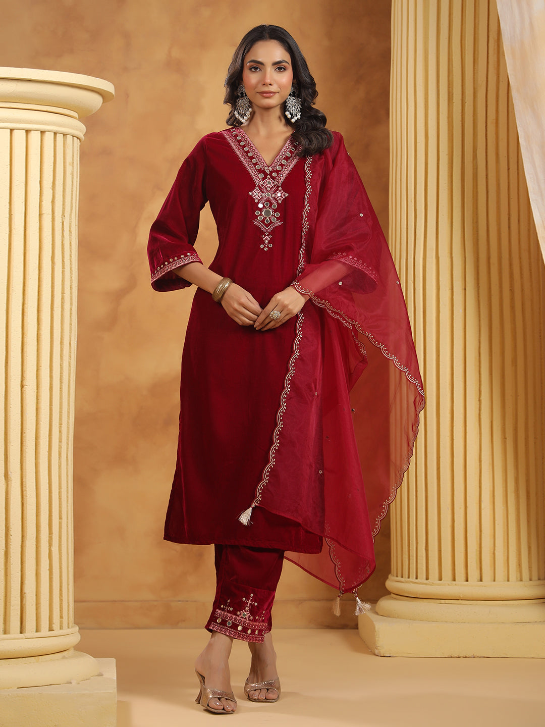 Our best-selling kurta sets from Mbz.in Meena Bazaar are velvet suit sets. Searching for a sophisticated yet elegant party outfit? If so, this women's suit set is ideal for you! This suit will give you a sophisticated confidence boost.