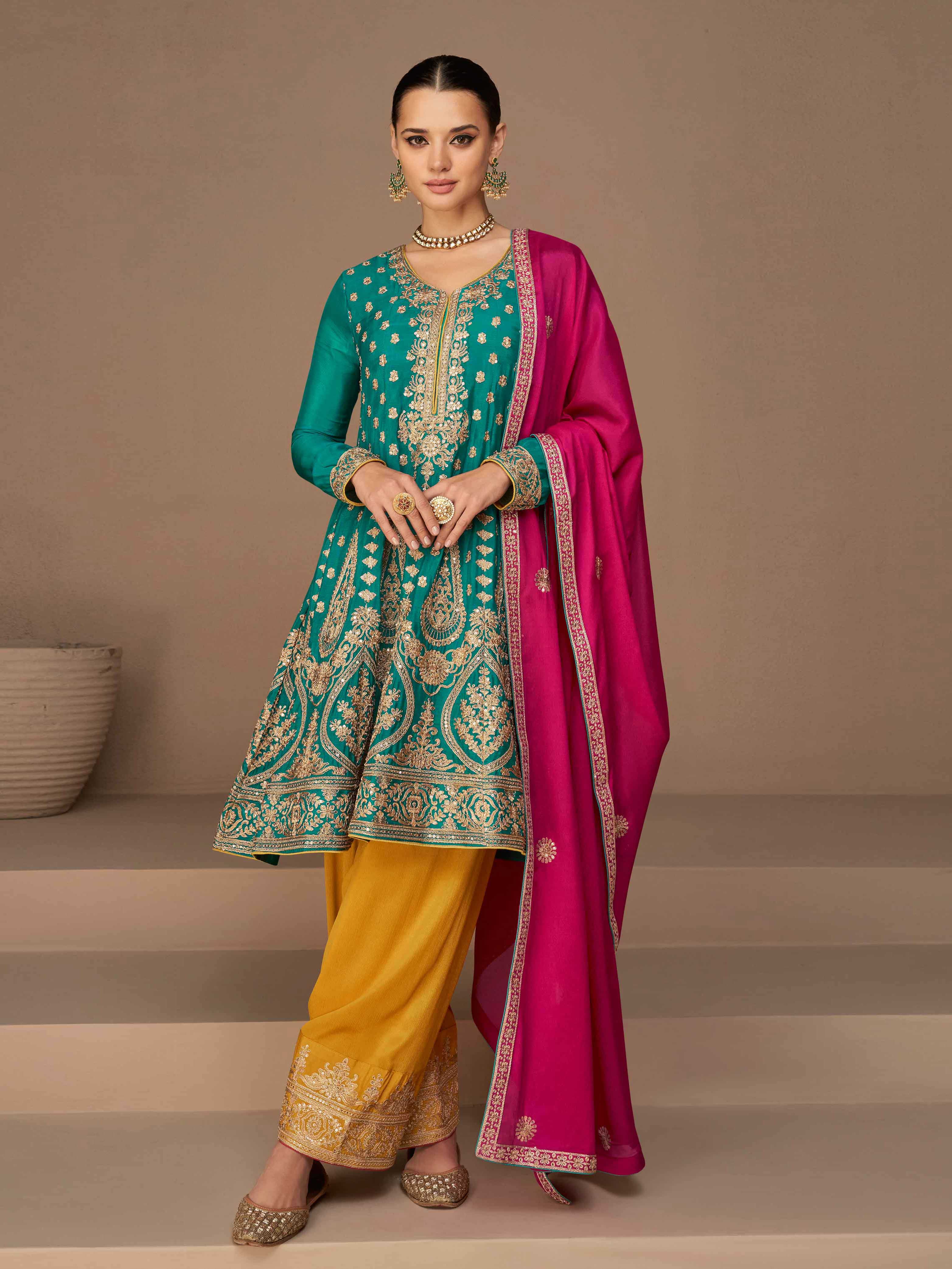 The classic and subtle art of wearing a suit set is mesmerizing! You could dress in the most basic suit and yet manage to look effortlessly flawless. In this scorching summer, our love for cotton suit sets is going to increase. So check out the fresh stock of Meena Bazaar suit sets. With summer splashes of blossoming colors and breathable fabrics, suit sets might become your new best friend! Have you chosen the dream outfit for the nine days or are you still wondering what to wear? Check out our beautiful stitched suits with dupatta and unstitched suit dress material! We believe glamming up for nine days is just as important as preparing for the festival! Looking your best while religiously seeking blessings is top-tier contentment.