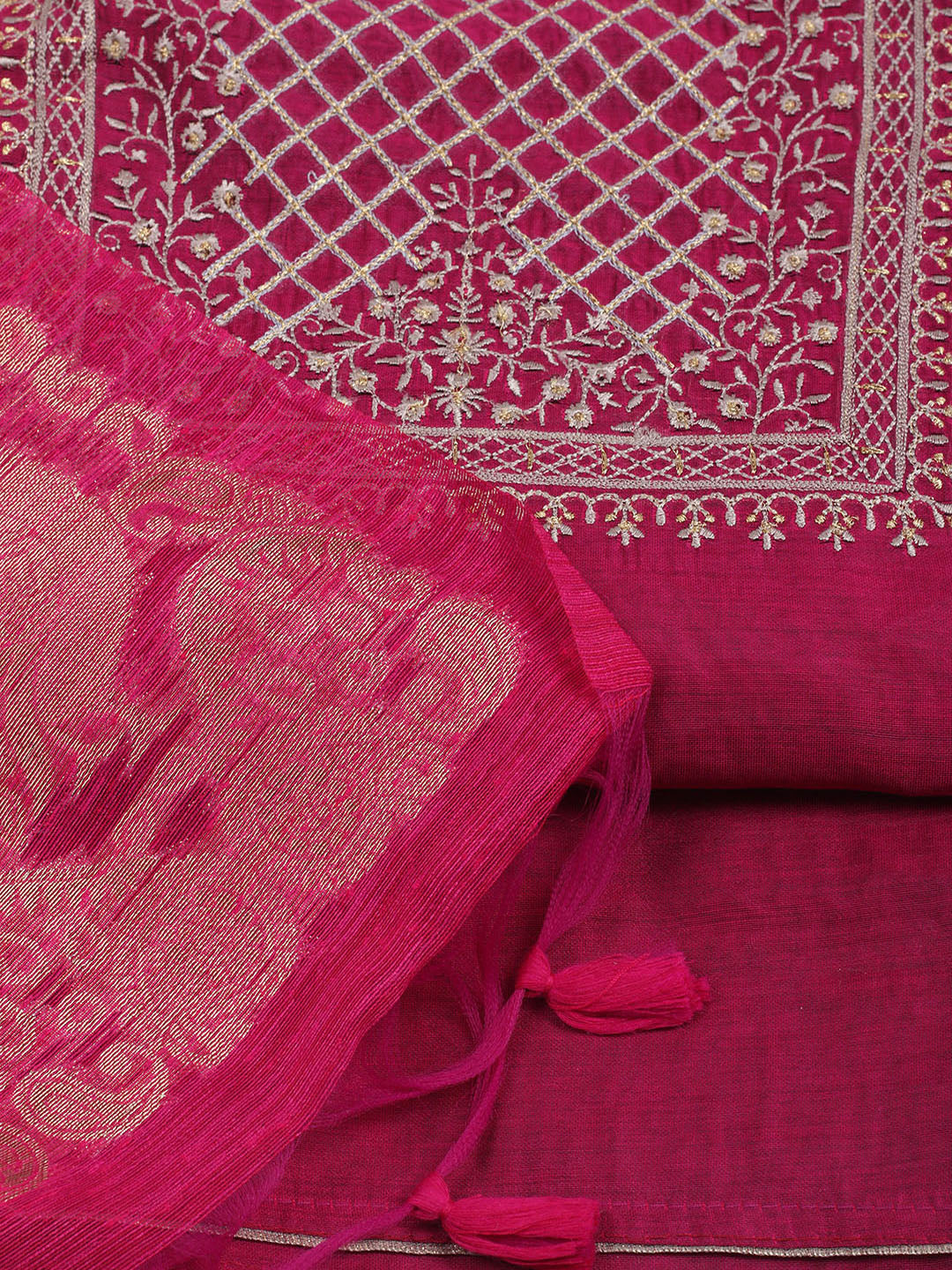 Neck Embroidered Chanderi Unstitched Suit Piece With Dupatta
