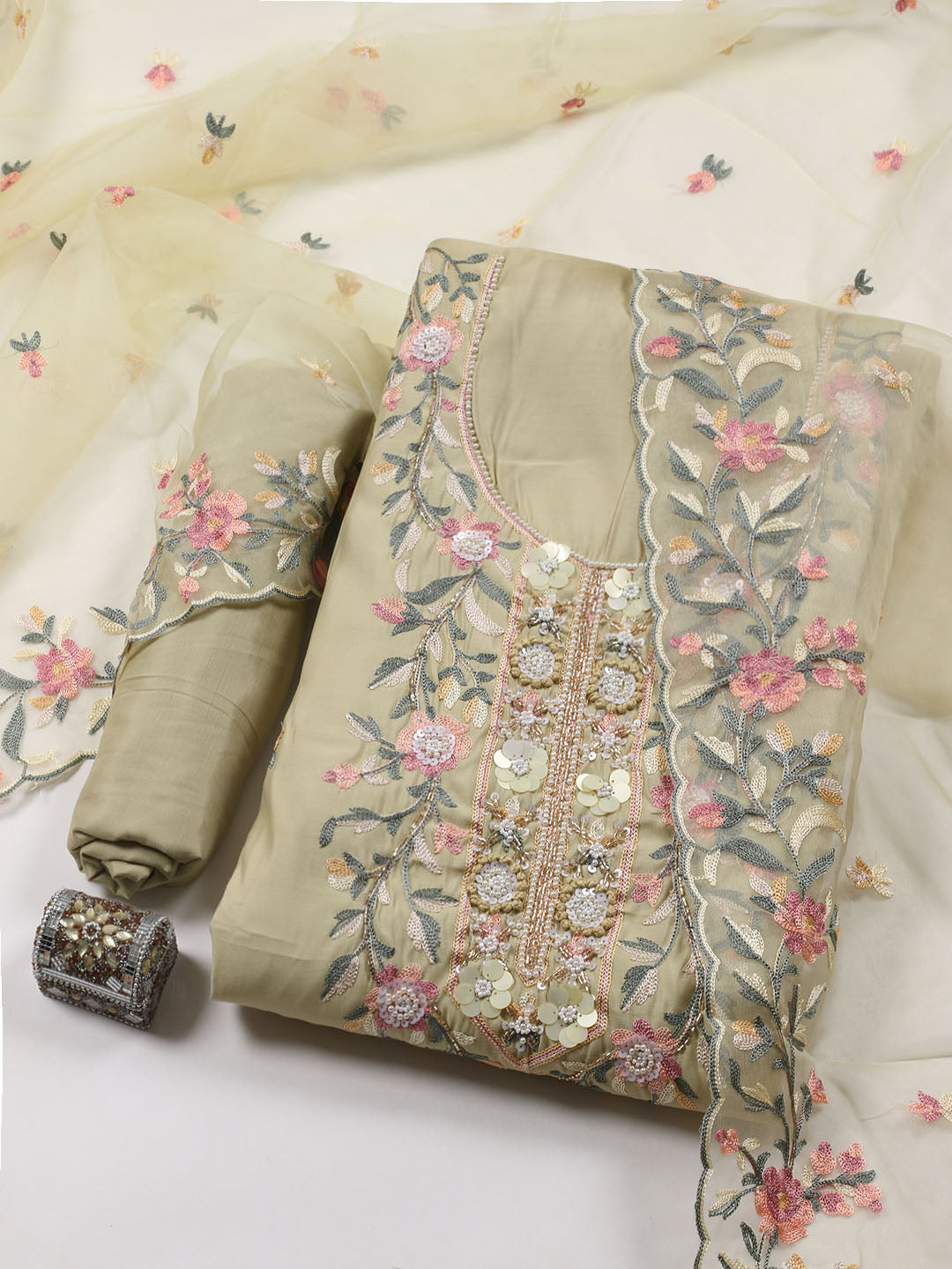 Neck Embroidered Chanderi Unstitched Suit With Dupatta
