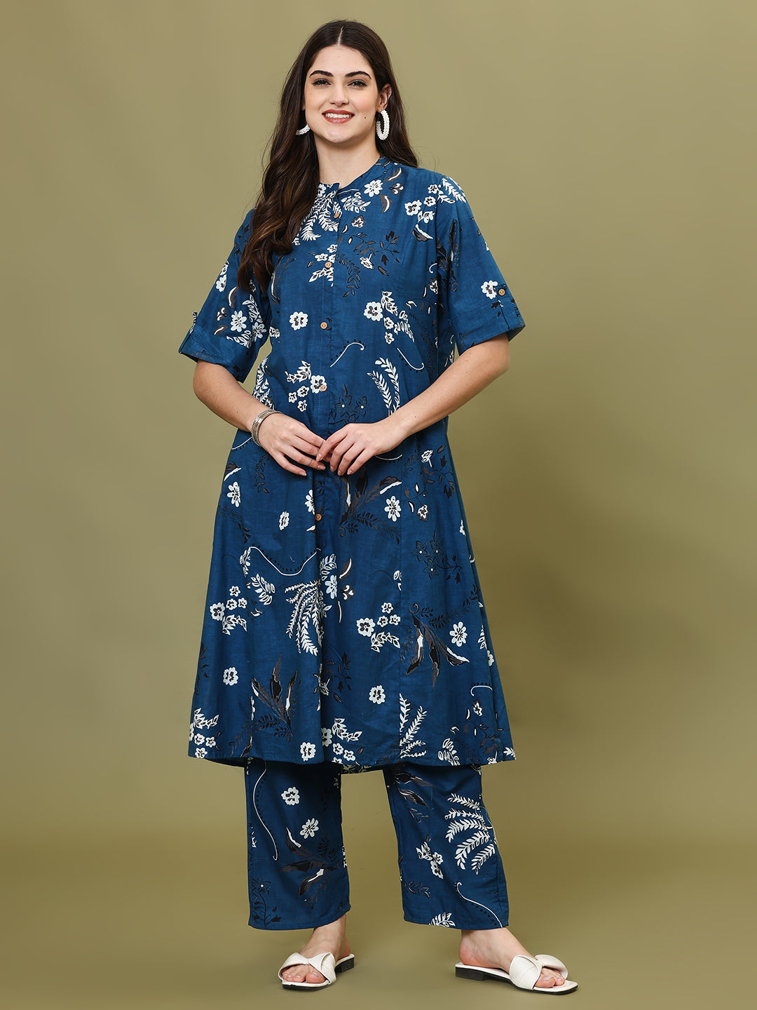 This Cotton Blend A-Line Kurta Set offers a perfect balance of comfort and style for everyday wear. The kurta features a mandarin neck and 3/4th sleeves, providing a chic and comfortable fit. With a stunning digital floral print, it adds a fresh, vibrant touch to your wardrobe. Paired with matching pants, this set ensures ease of movement and a flattering silhouette. Ideal for casual outings, workwear, or everyday errands, it combines modern design with classic comfort.