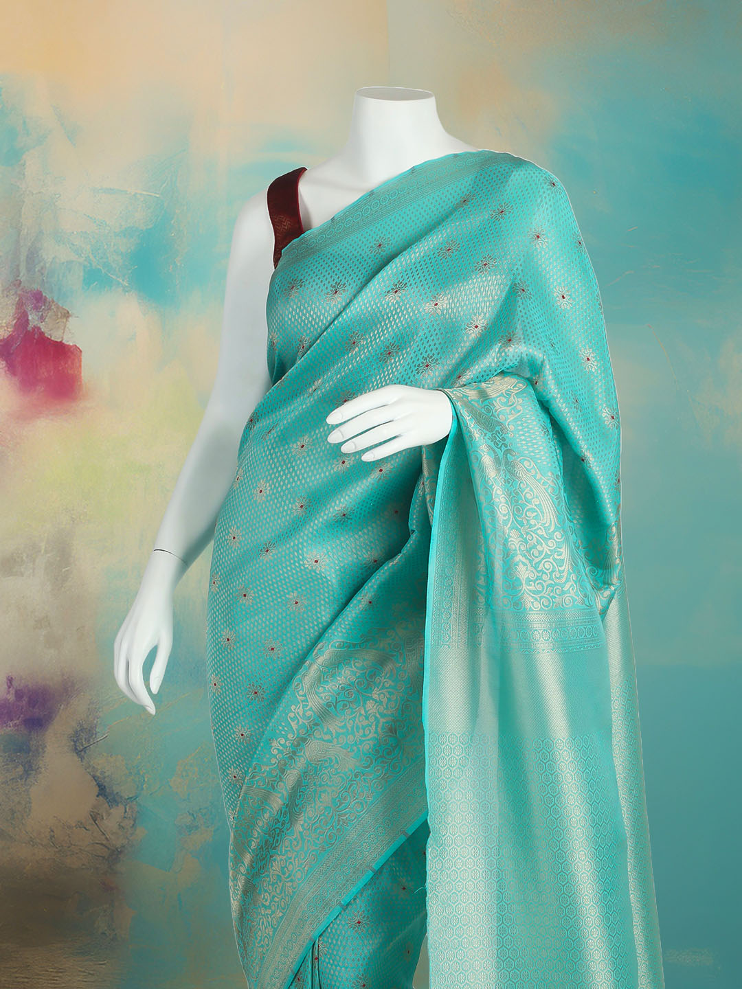 Note:The blouse shown in the pictures is just for Photoshoot purposes. The blouse you will get will be an attached running blouse.