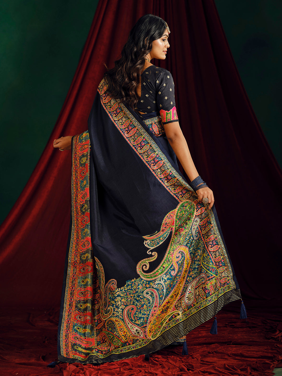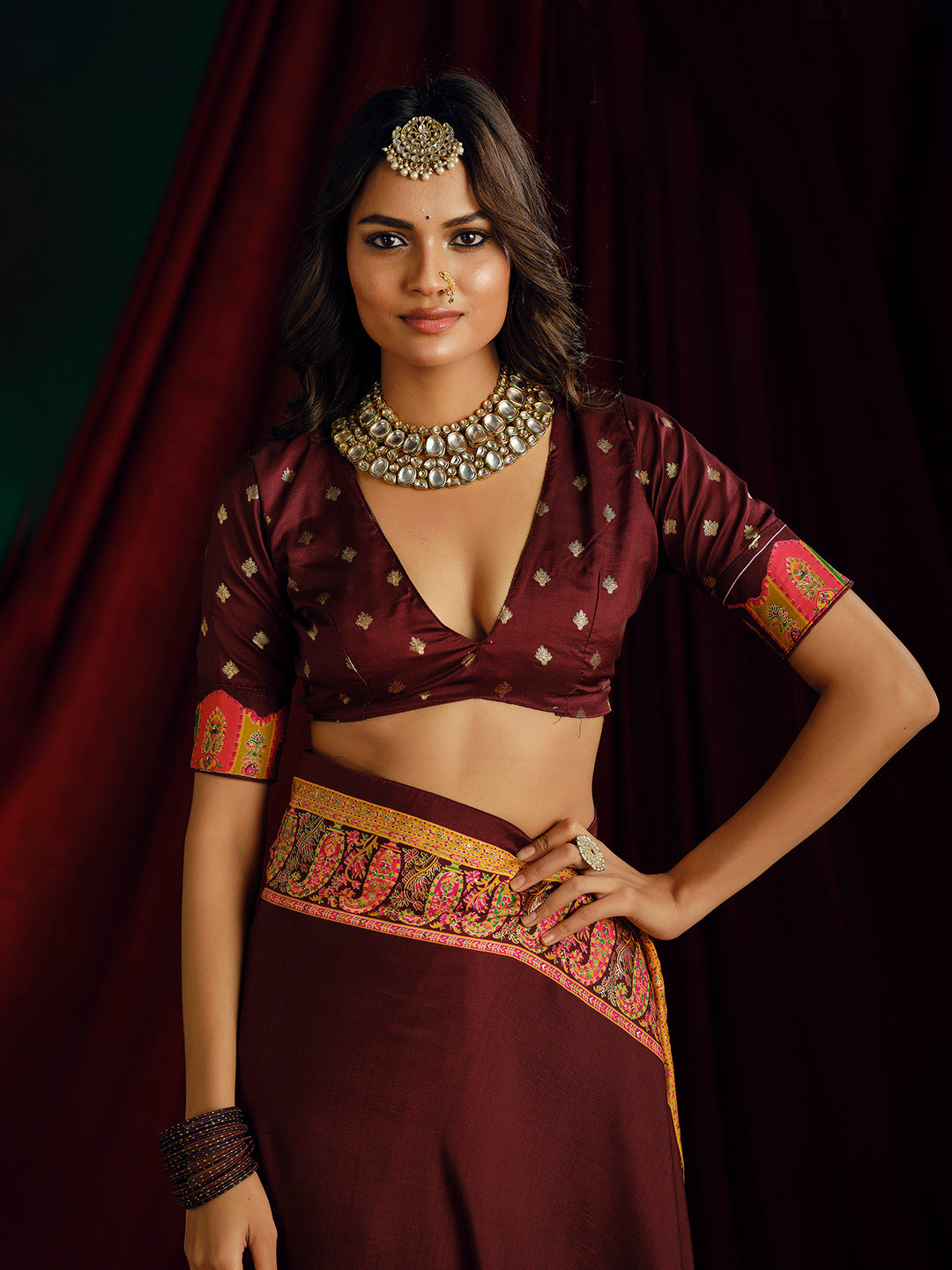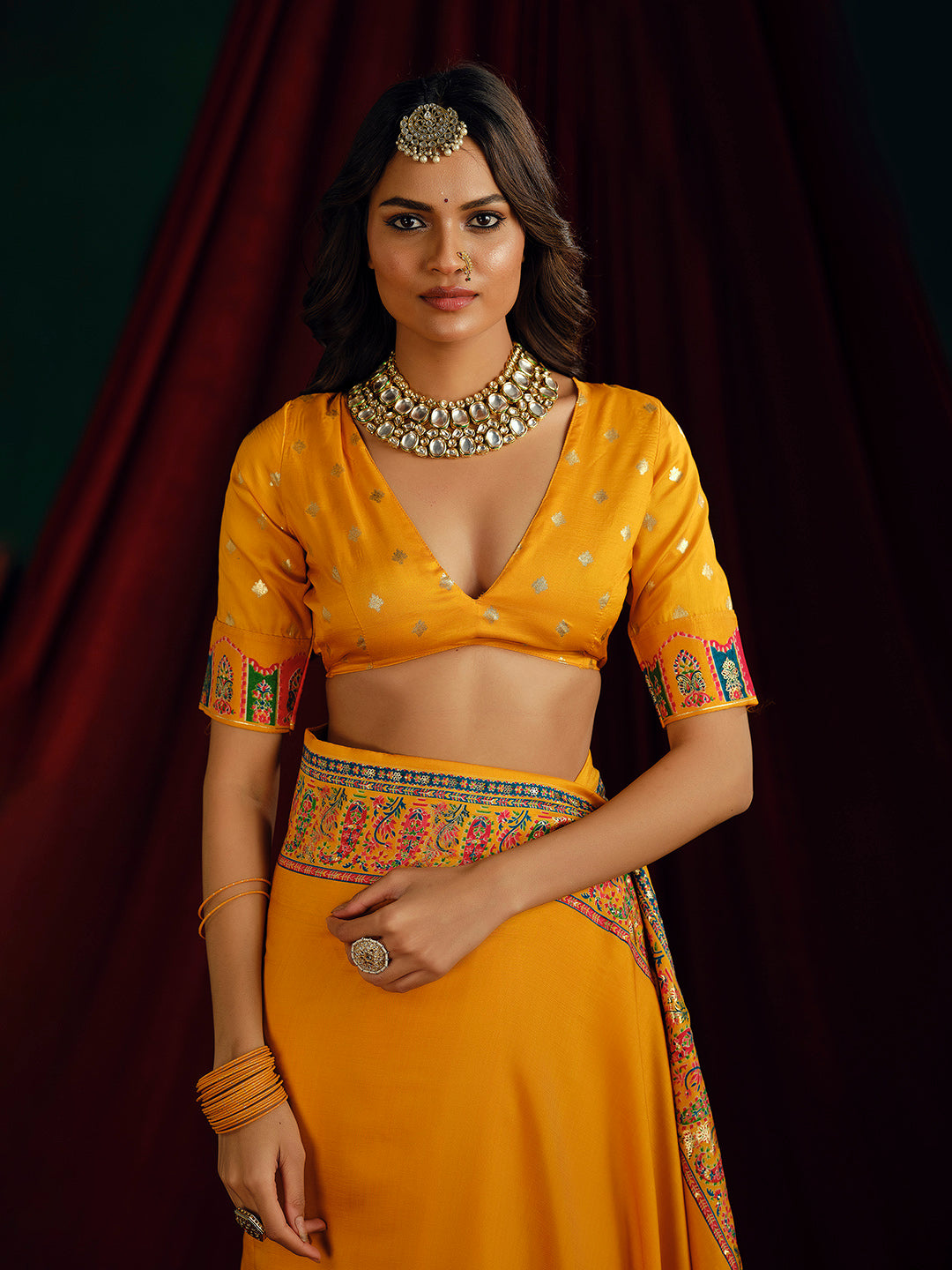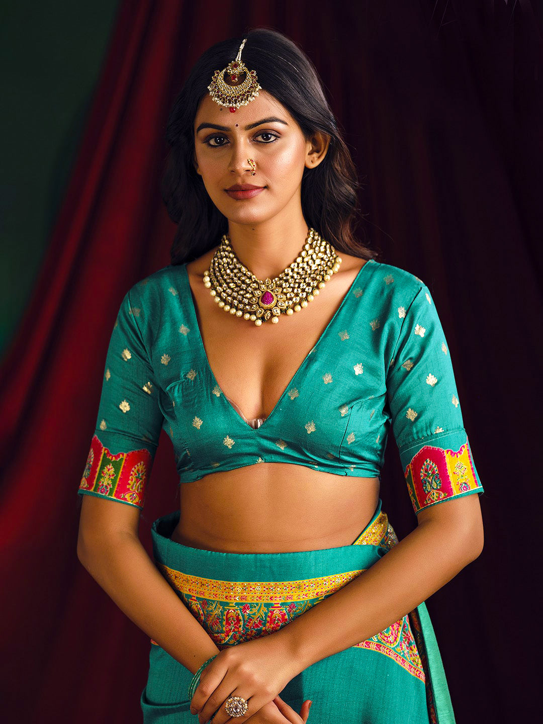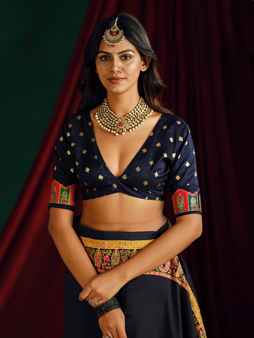 Note:The blouse shown in the pictures is just for Photoshoot purposes. The blouse you will get will be an attached running blouse.