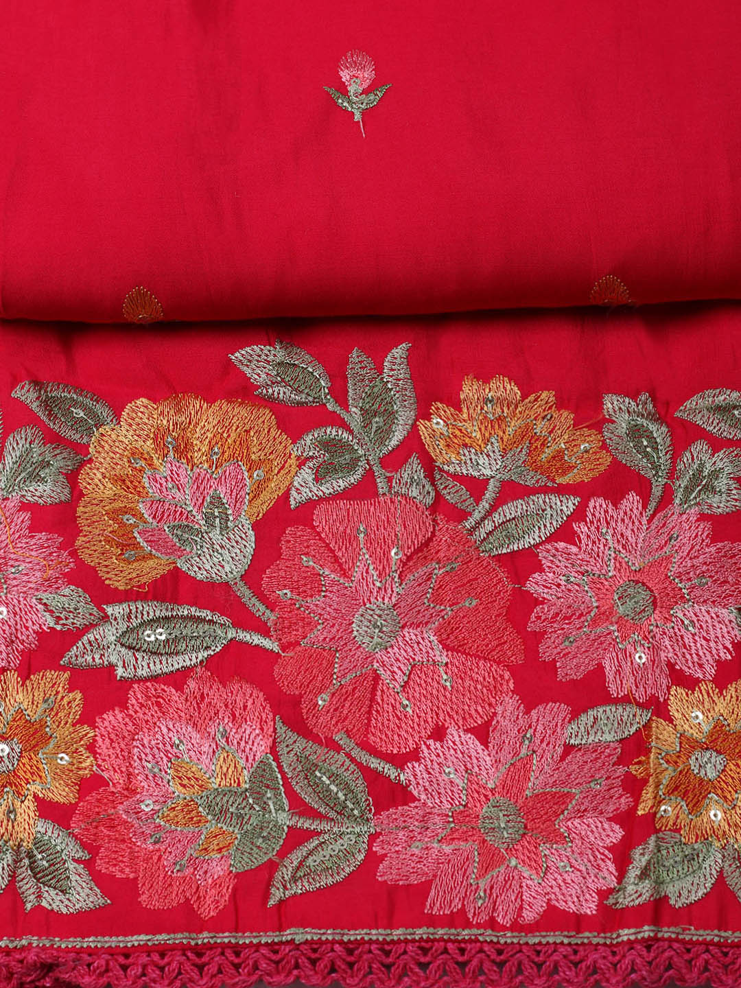 Embroidered Chanderi Rani Unstitched Suit With Pant & Dupatta