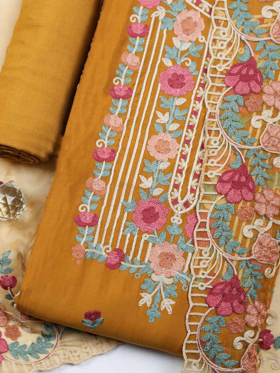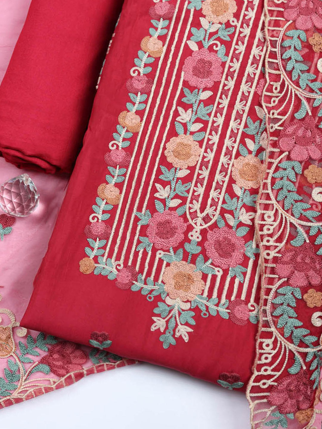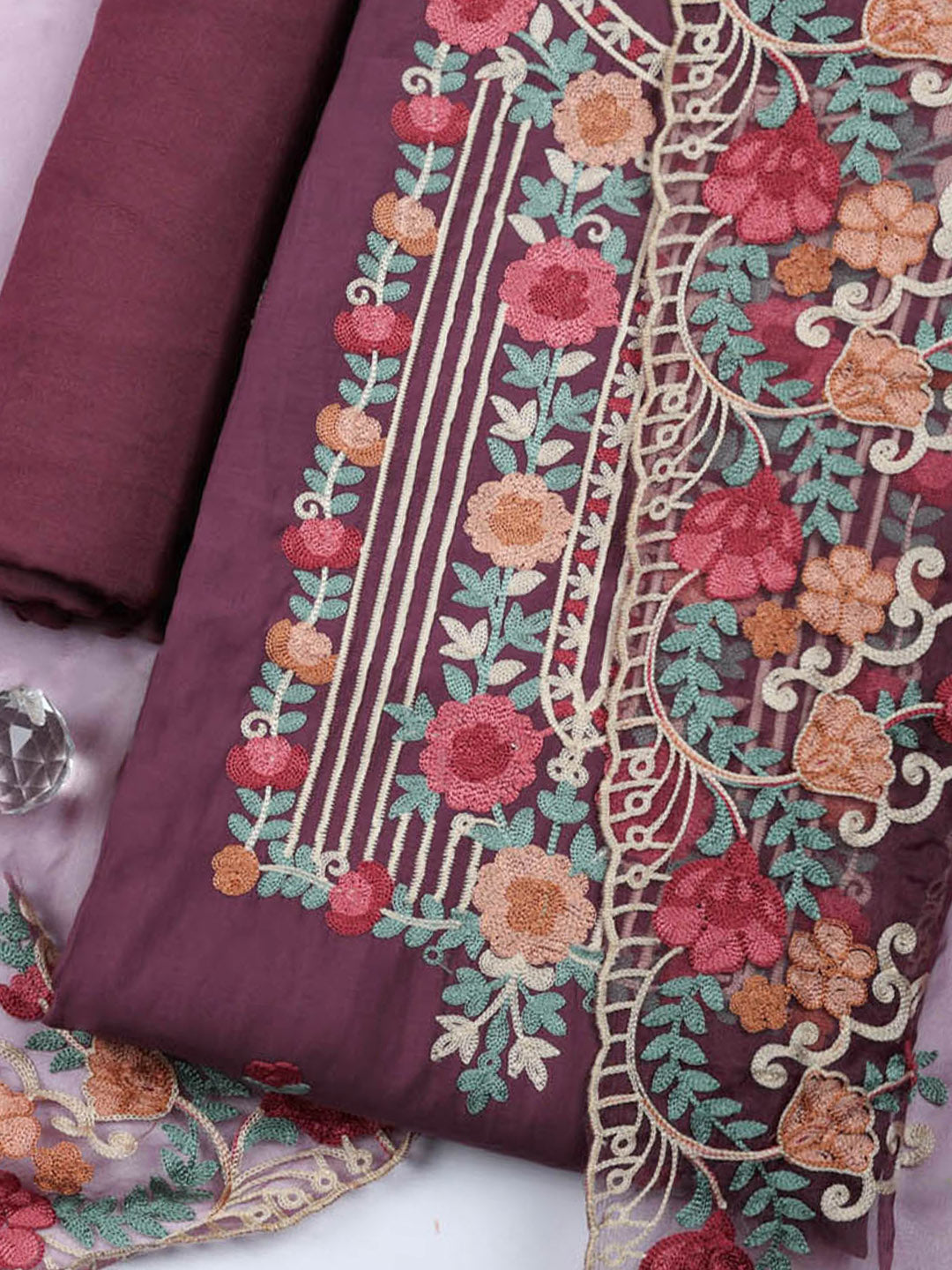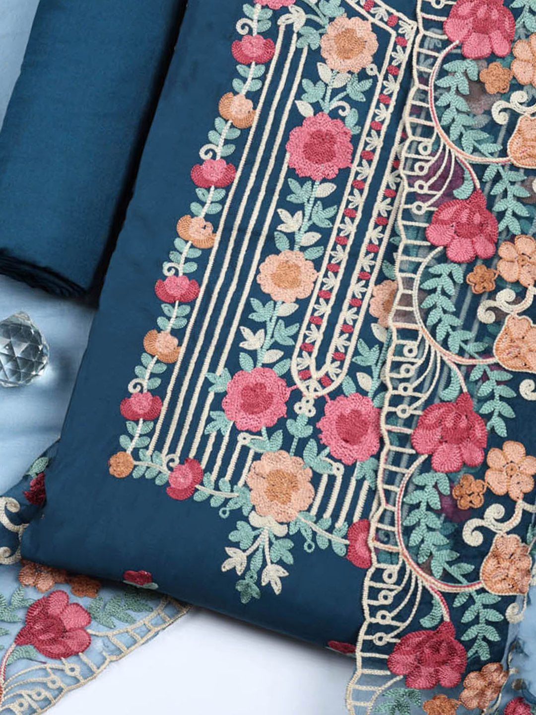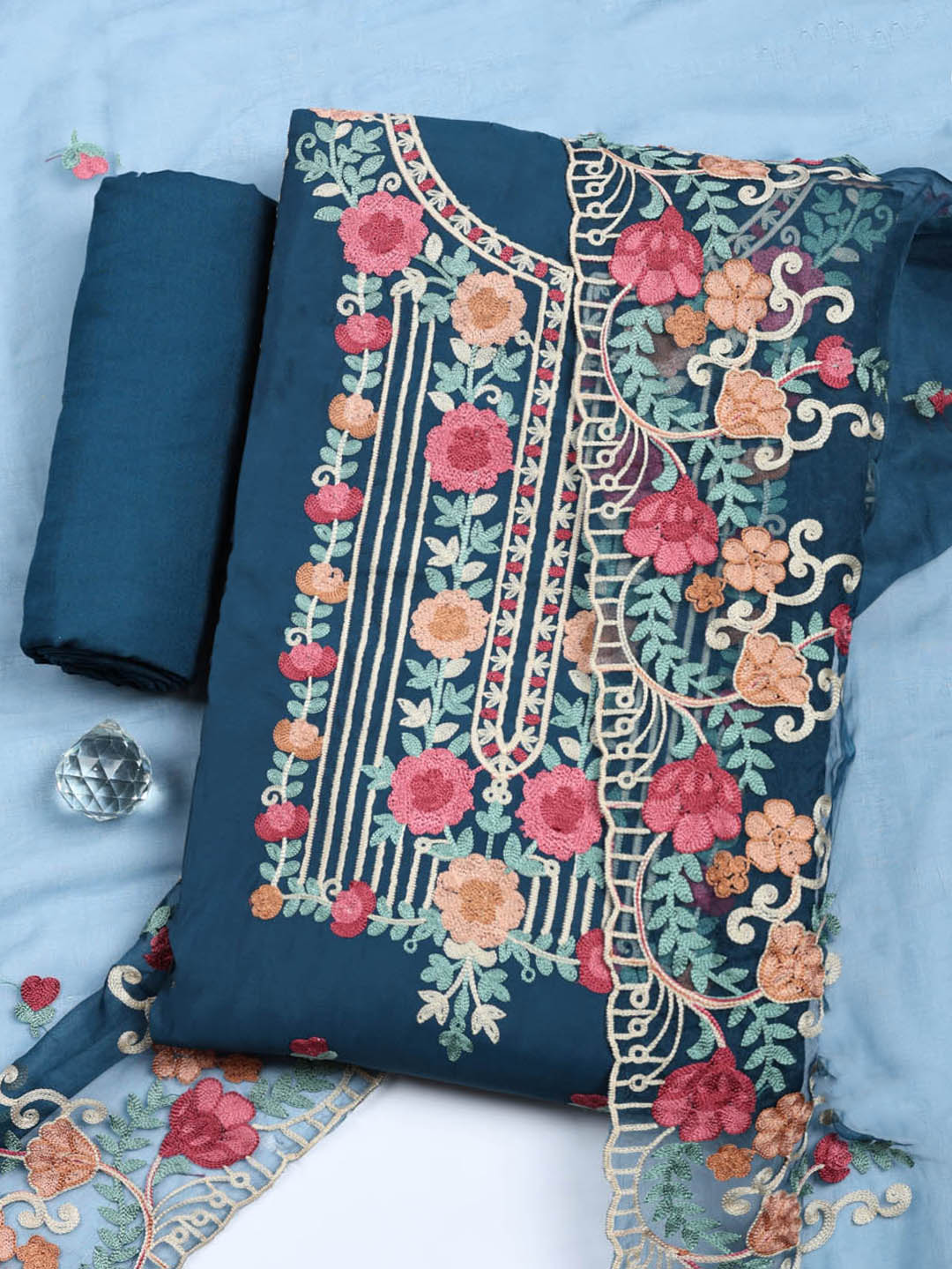 Embroidered Cotton Blend Unstitched Suit With Pant & Dupatta