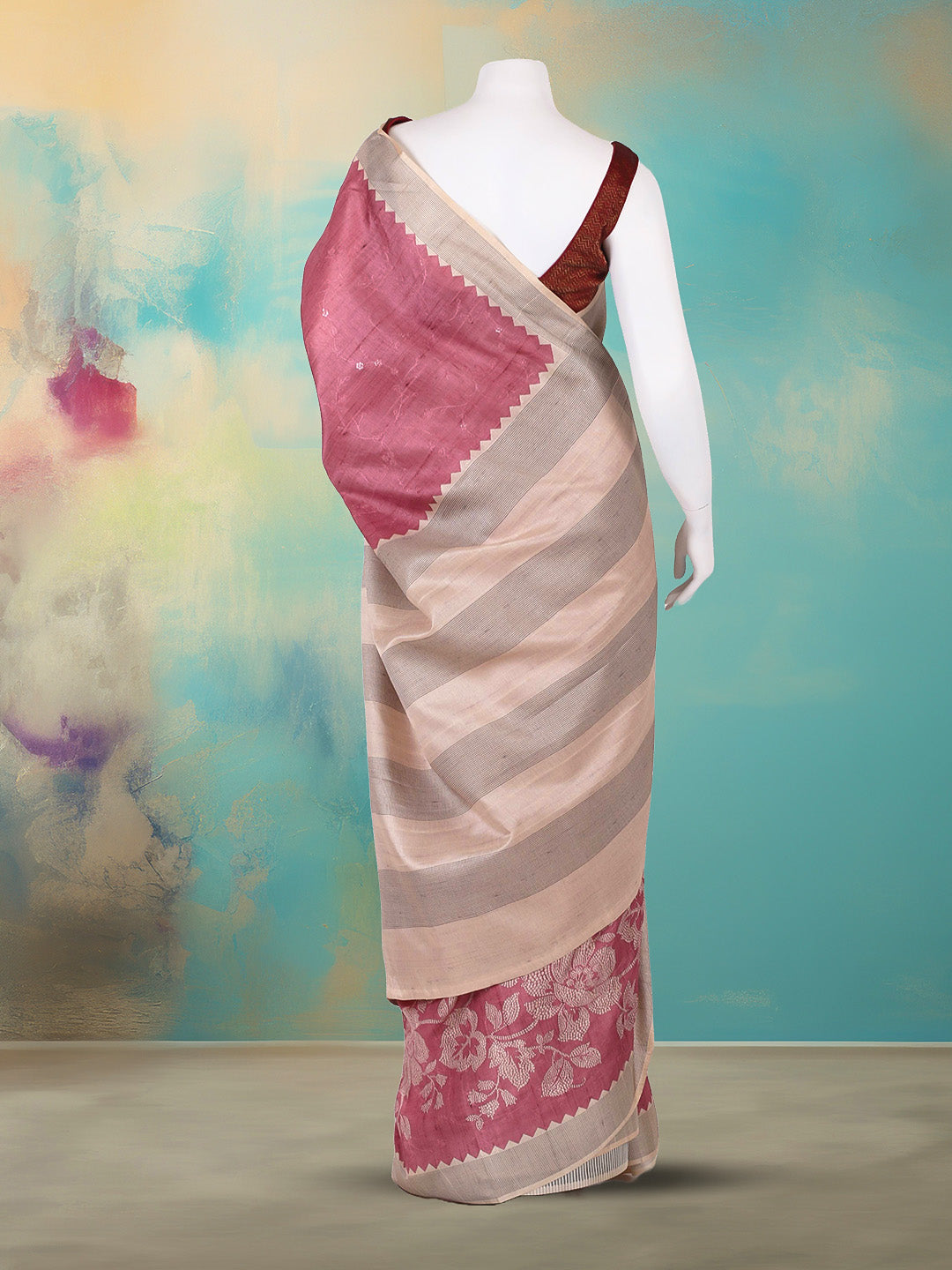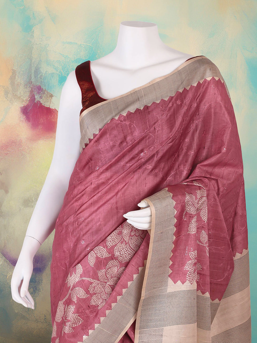 Printed Tussar Pink Saree