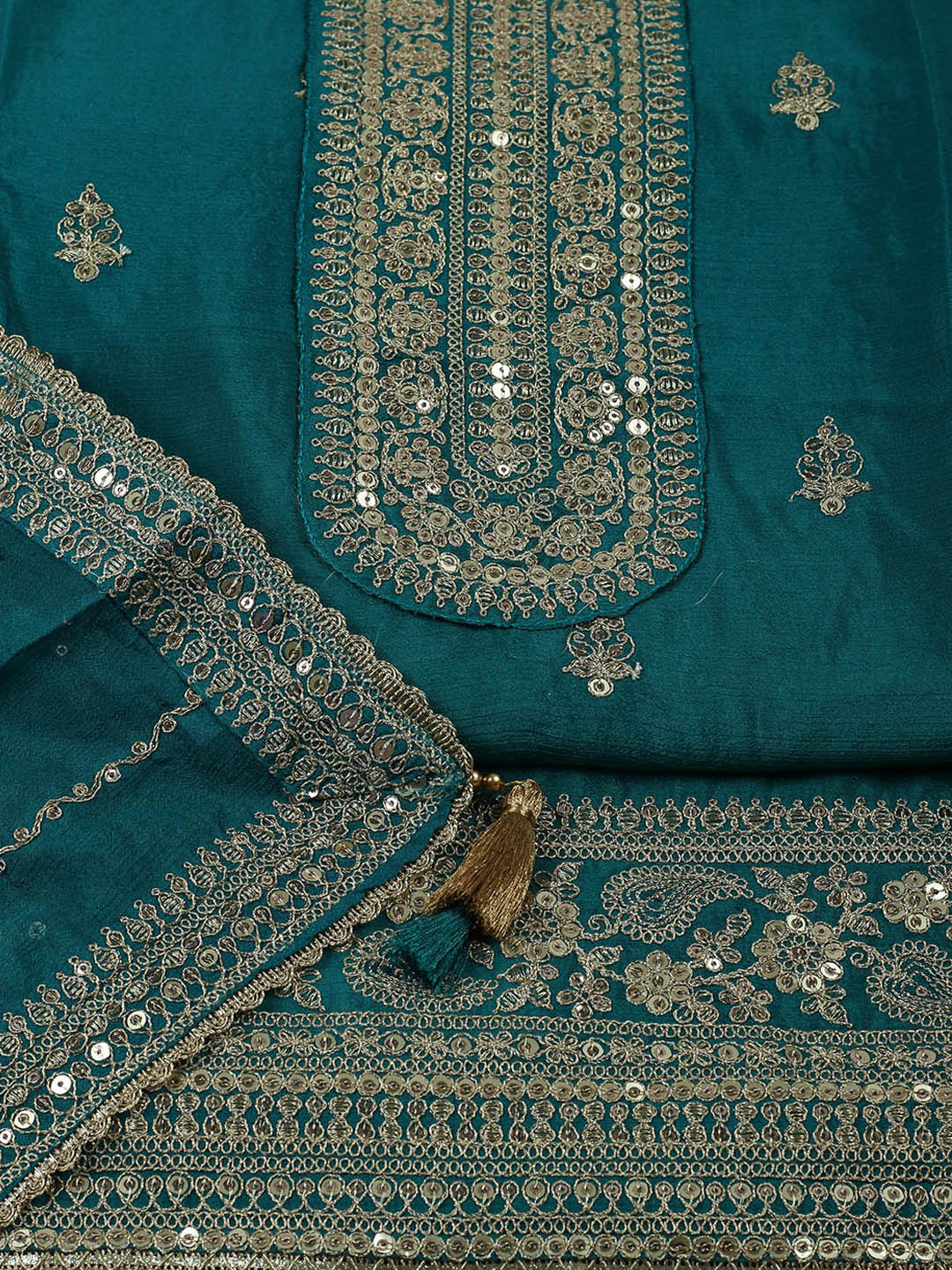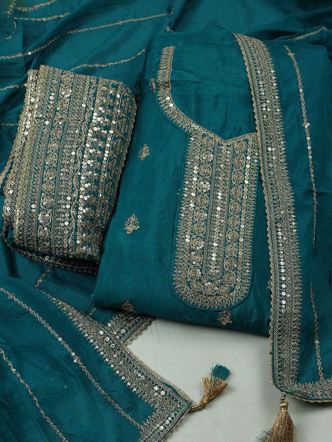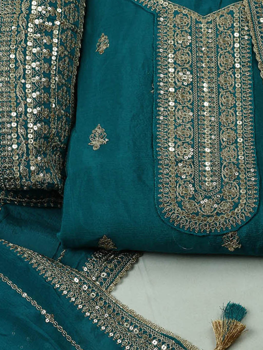 Embroidered Chinon Lake Blue Unstitched Suit With Pant & Dupatta