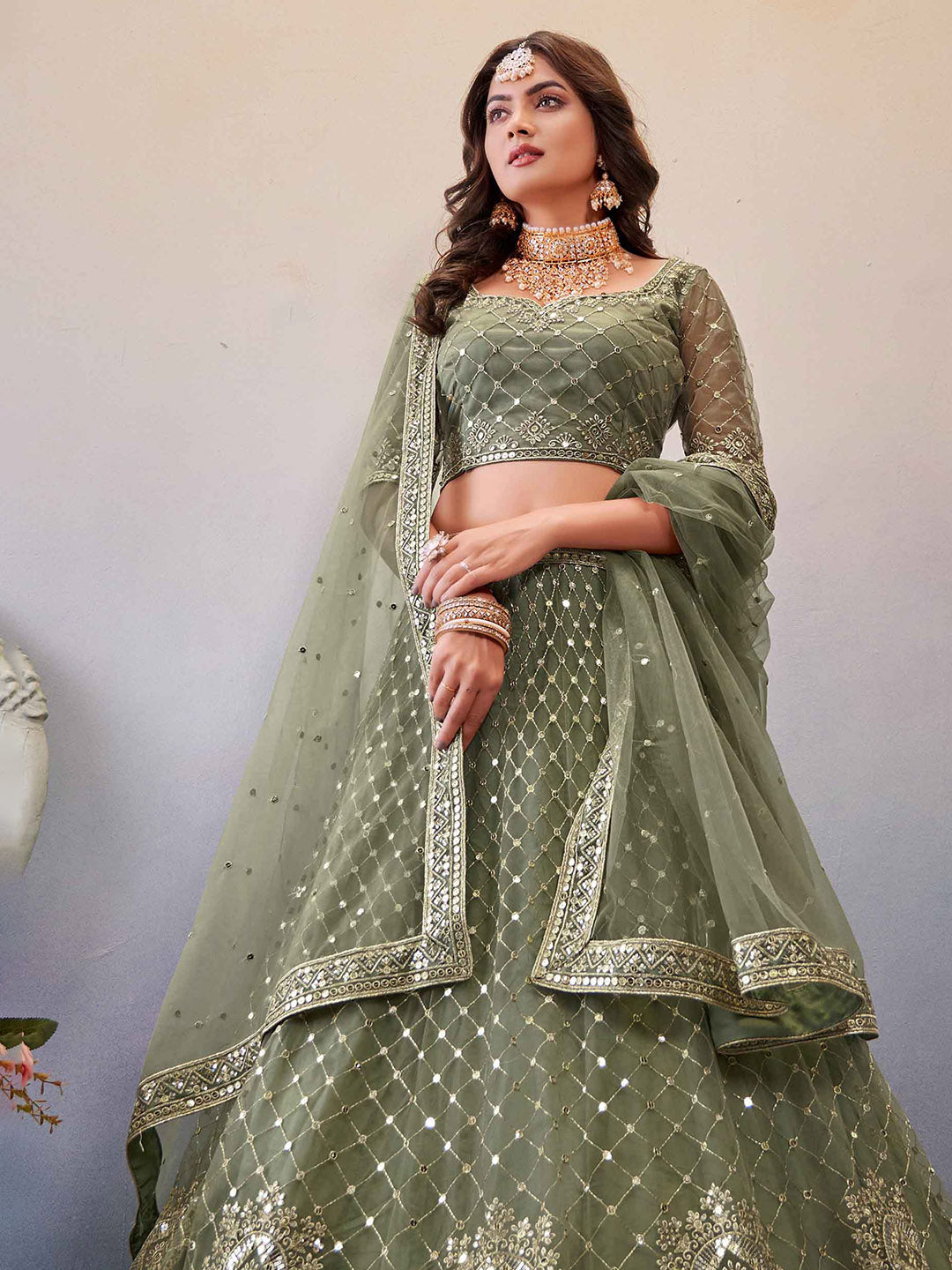 Embroidered Net Unstitched Choli With Lehenga & Dupatta