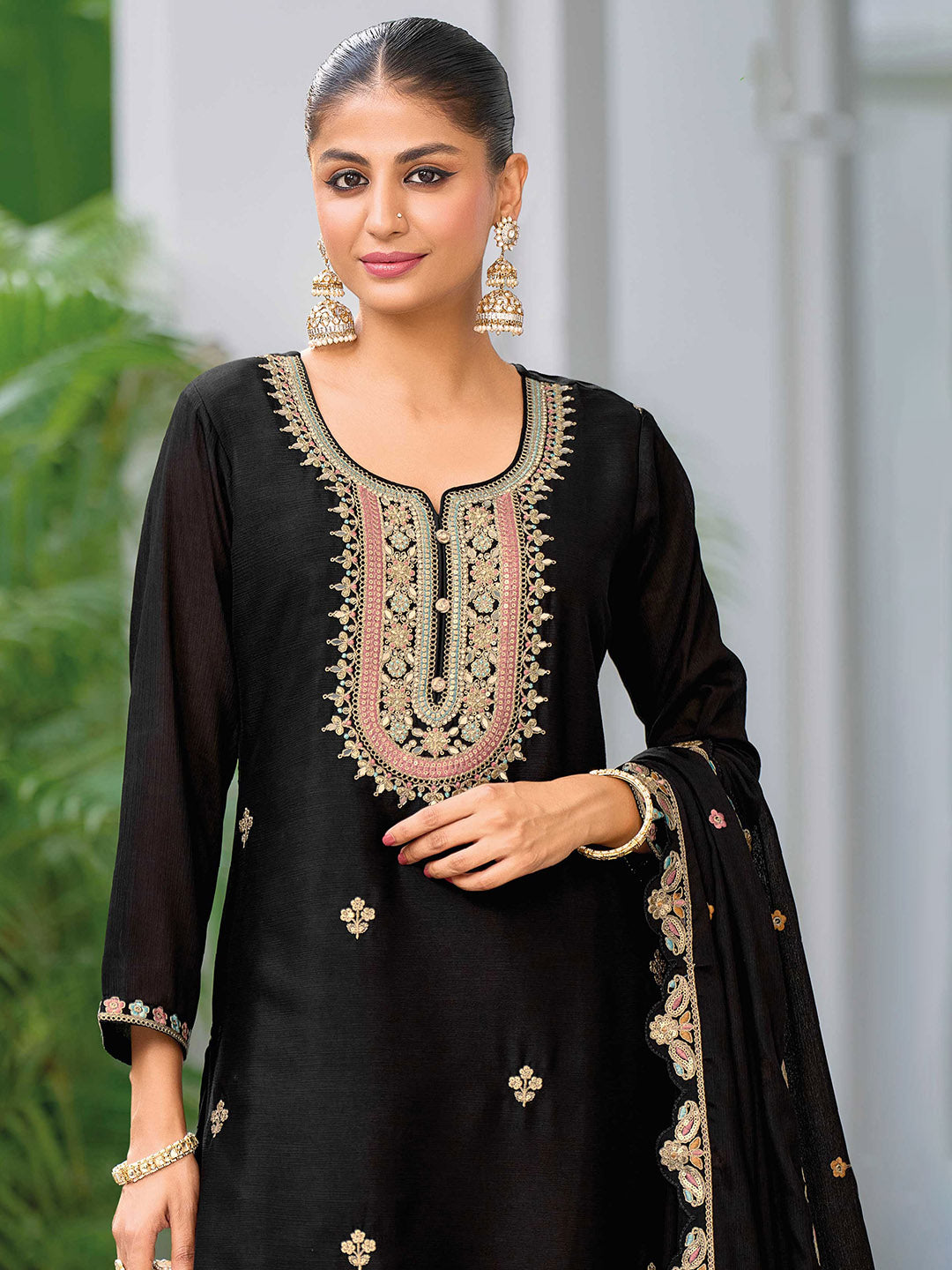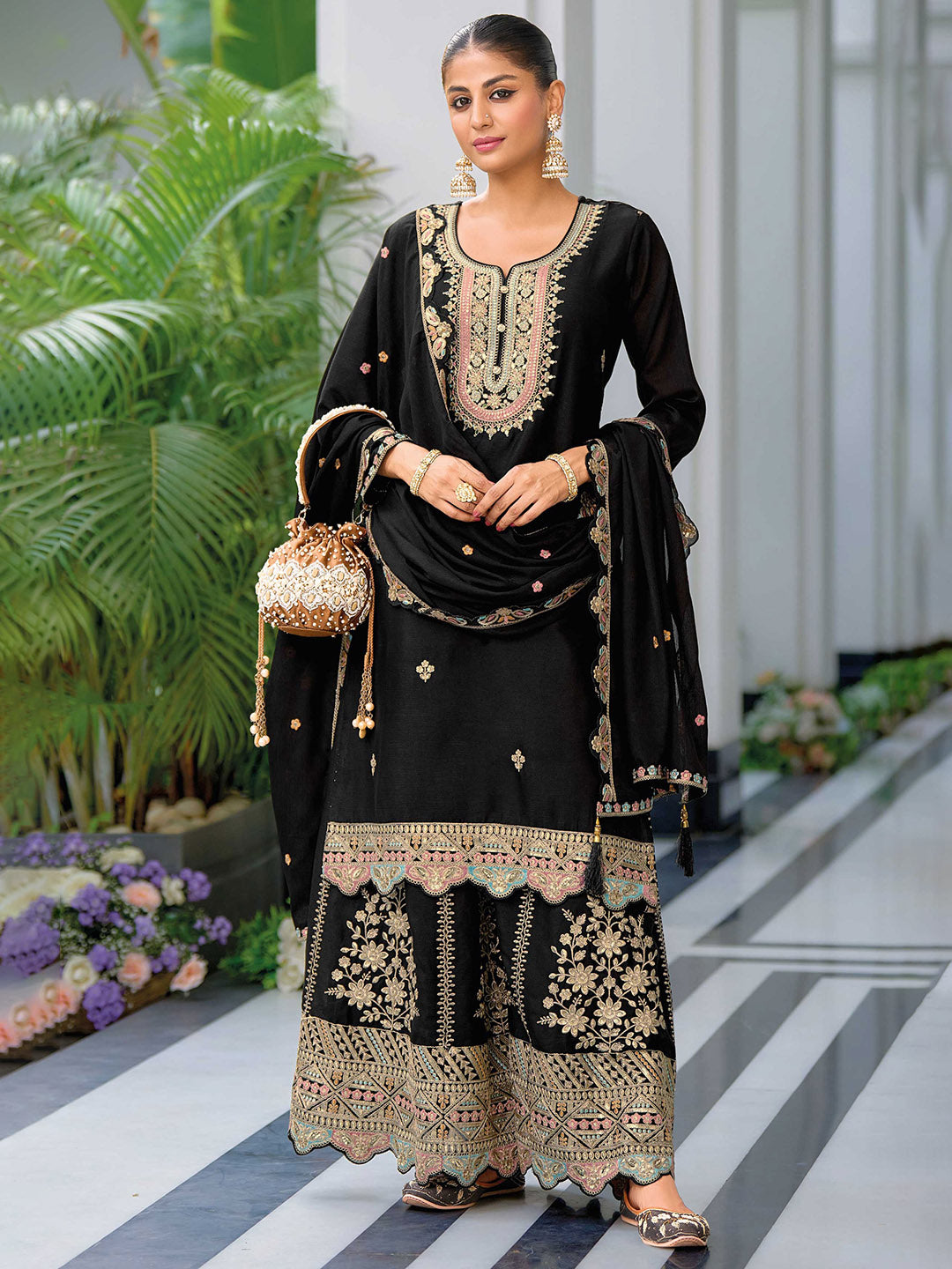 Embroidered Chinon Kurta With Plazzo & Dupatta