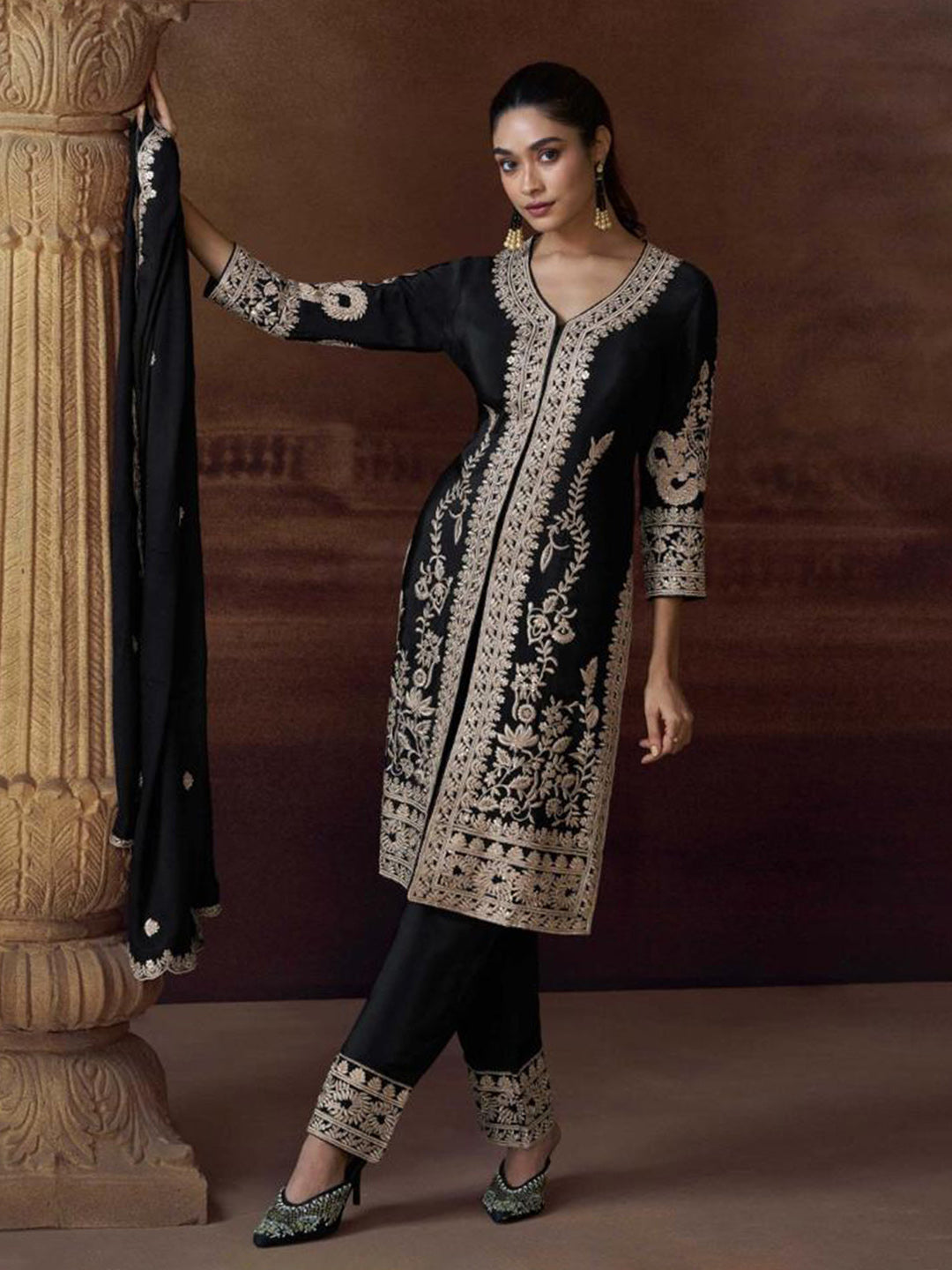 Embroidered Chinon Suit With Pant & Dupatta