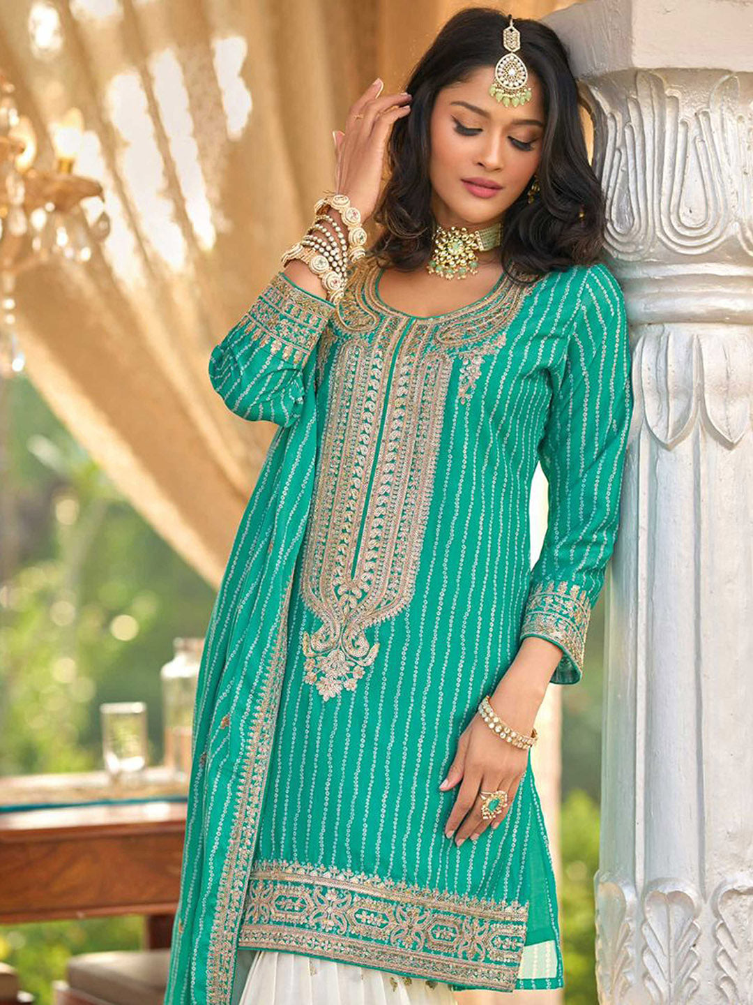Embroidered Chinon Kurti With Gharara & Dupatta