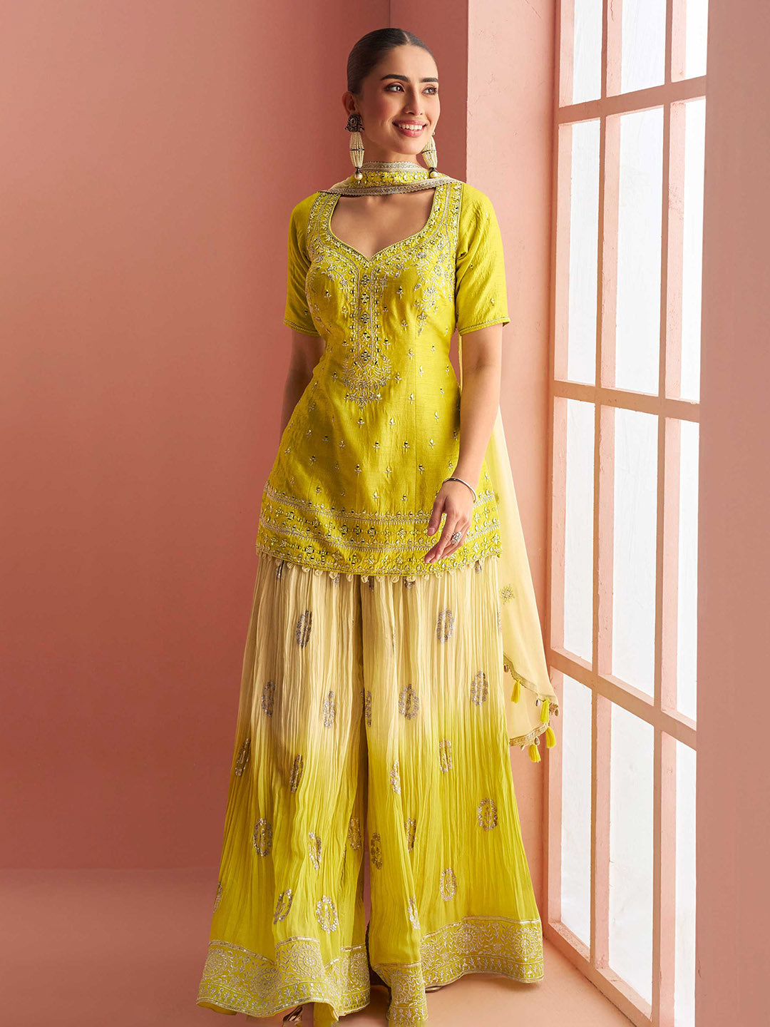 Embroidered Chinon Kurti With Gharara & Dupatta