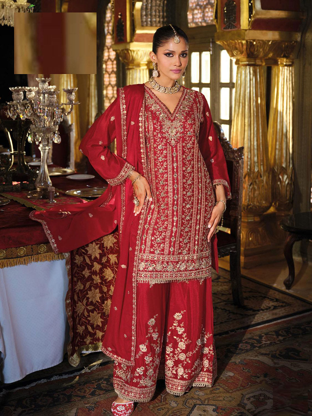 Embroidered Chinon Kurta With Plazzo & Dupatta