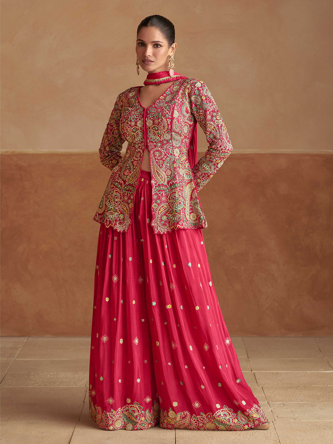 Embroidered Chinon Kurti With Gharara & Dupatta