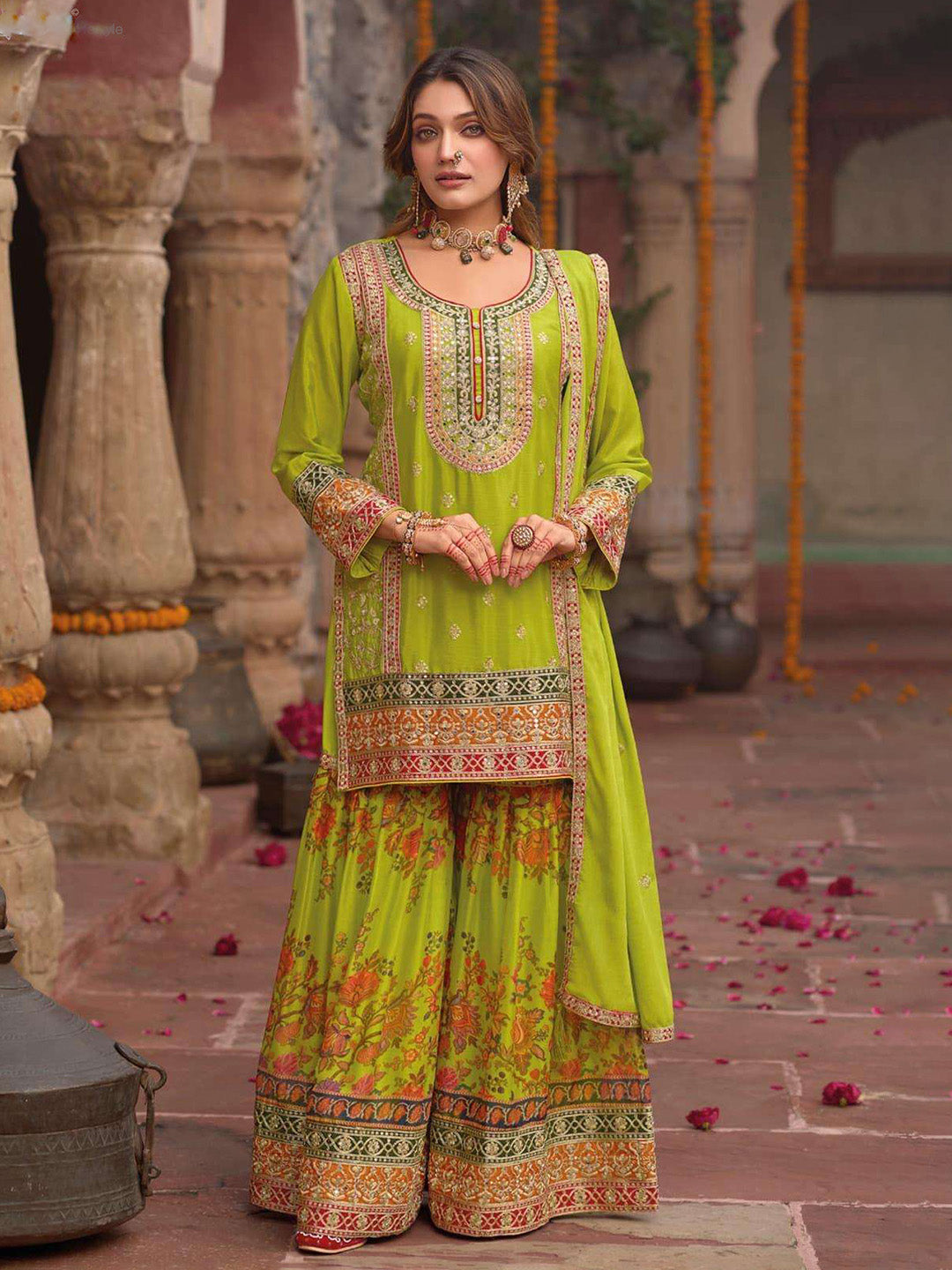 Embroidered Chinnon Silk Kurti With Gharara & Dupatta