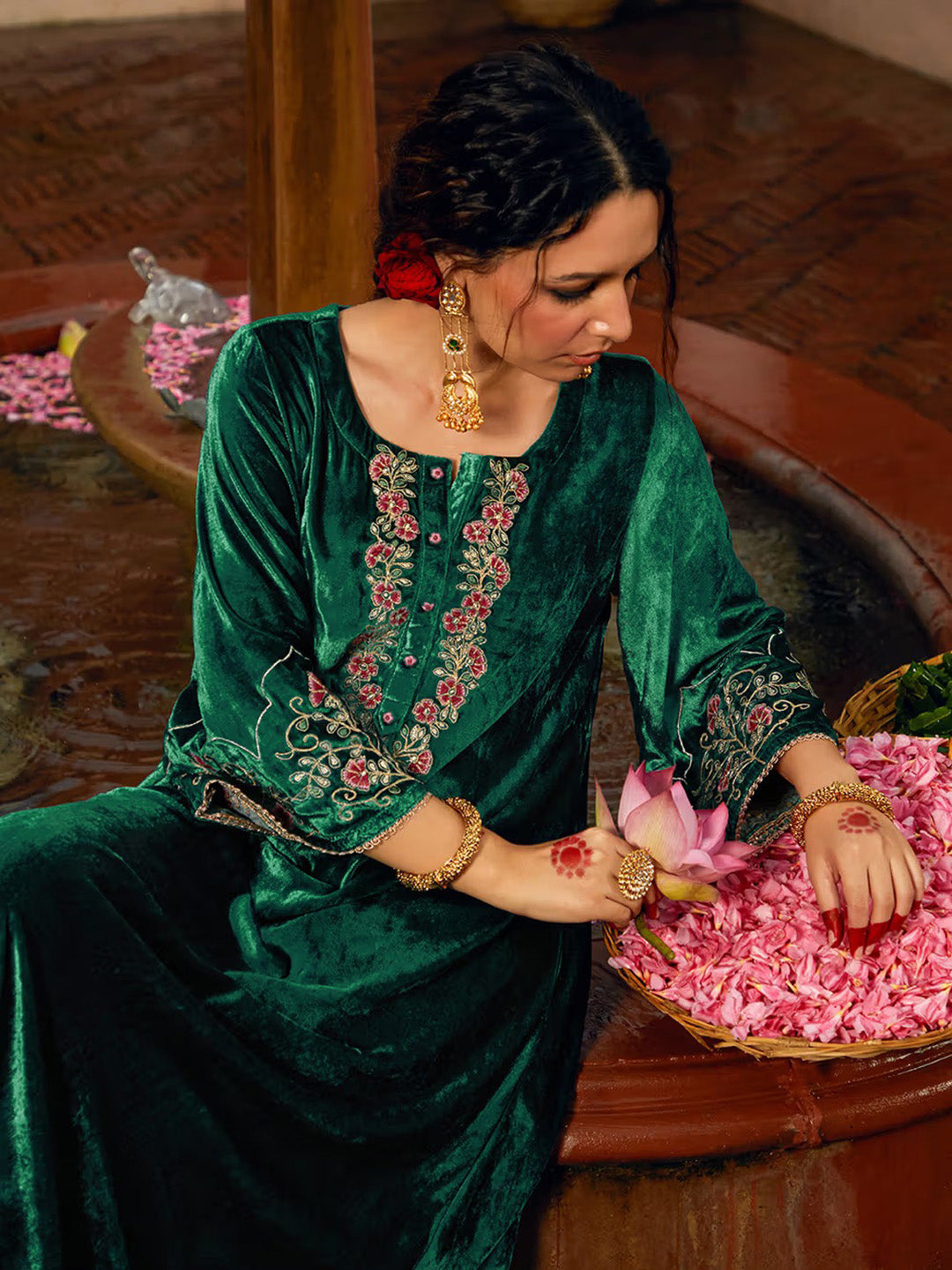 Embroidered Velvet Kurta With Pant & Dupatta