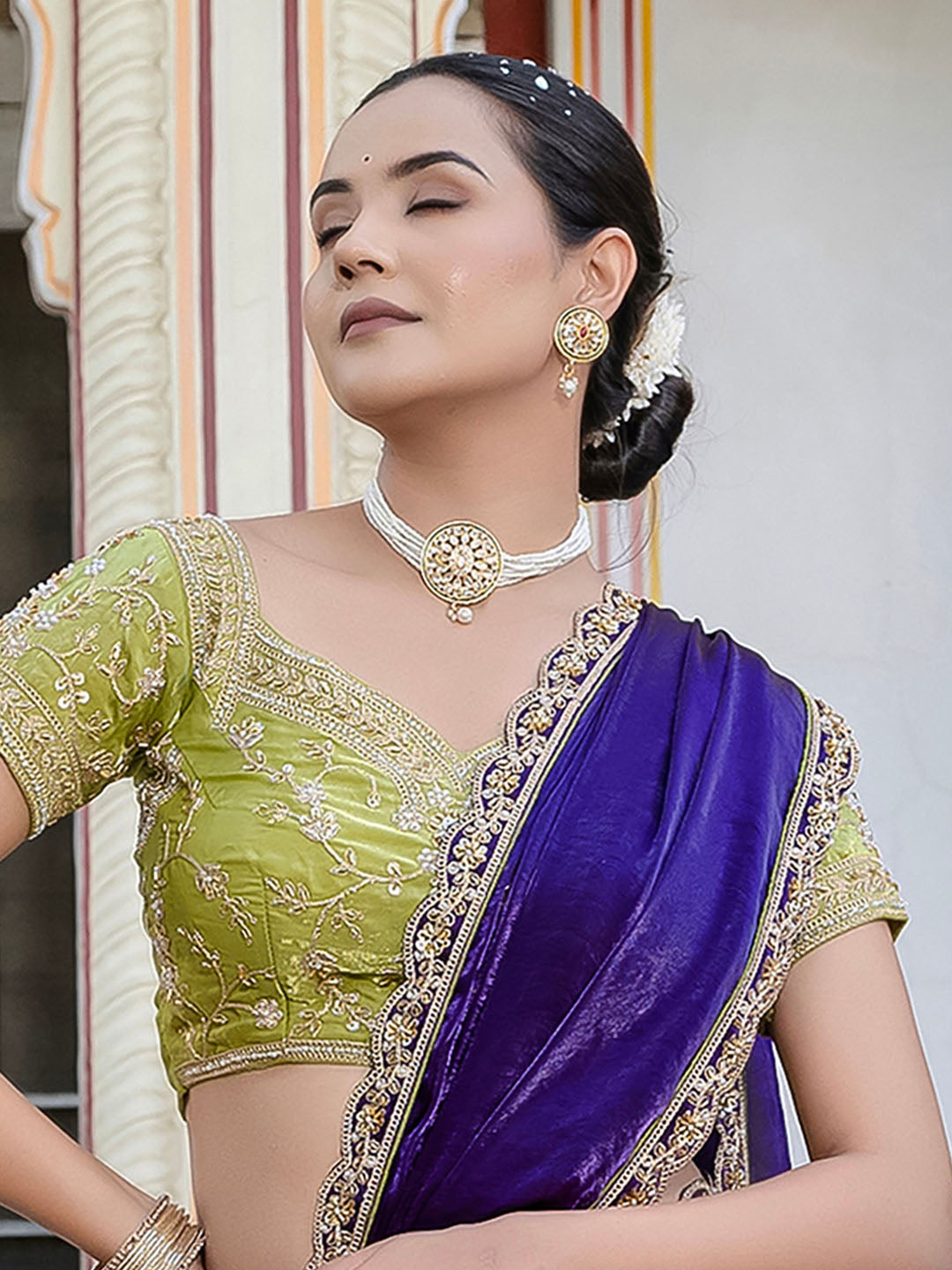 Note: The blouse shown in the pictures is just for Photoshoot purposes. The blouse you will get will be an attached running blouse.