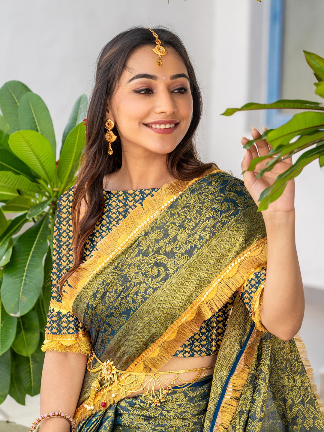 Note: The blouse shown in the pictures is just for Photoshoot purposes. The blouse you will get will be an attached running blouse.