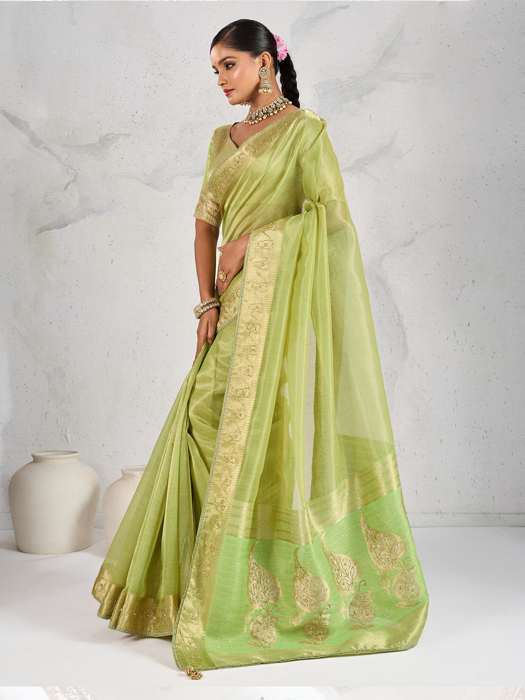 Note: The blouse shown in the pictures is just for Photoshoot purposes. The blouse you will get will be an attached running blouse.