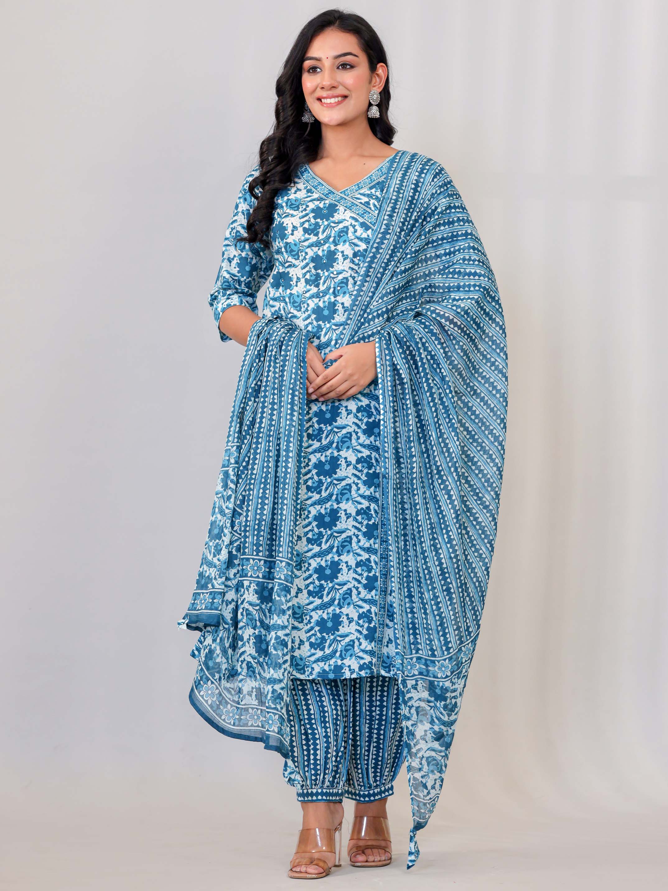 ÿThe Angrakha Stitched Suit with Dupatta has beautiful pastel colors filled with floral print. The embroidered/printed Patti pattern on the v-neck overlapped by Angrakha Kurta border looks perfect for everyday outfits. The subtle color Afghani pants are trending, complimenting the ladies suit set. The cotton dupatta has stunning floral print matching with both Kurta and Afghani Pants. The dupatta has tassels all around the edges, adding more charm.