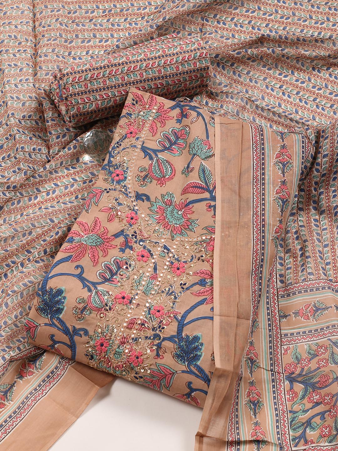 Printed Cotton Blend Unstitched Suit With Dupatta
