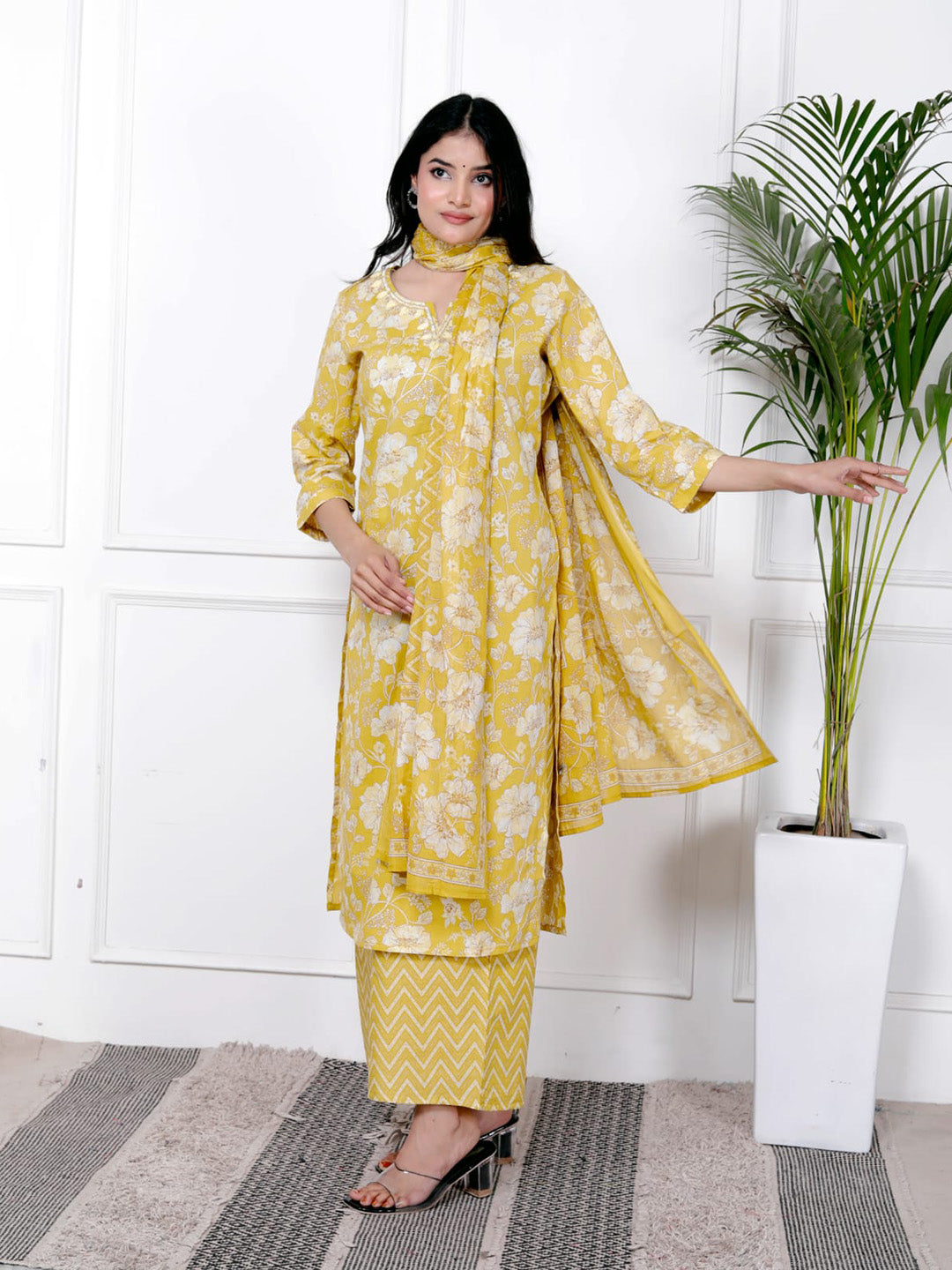 Printed Cotton Blend Kurta With Pants & Dupatta