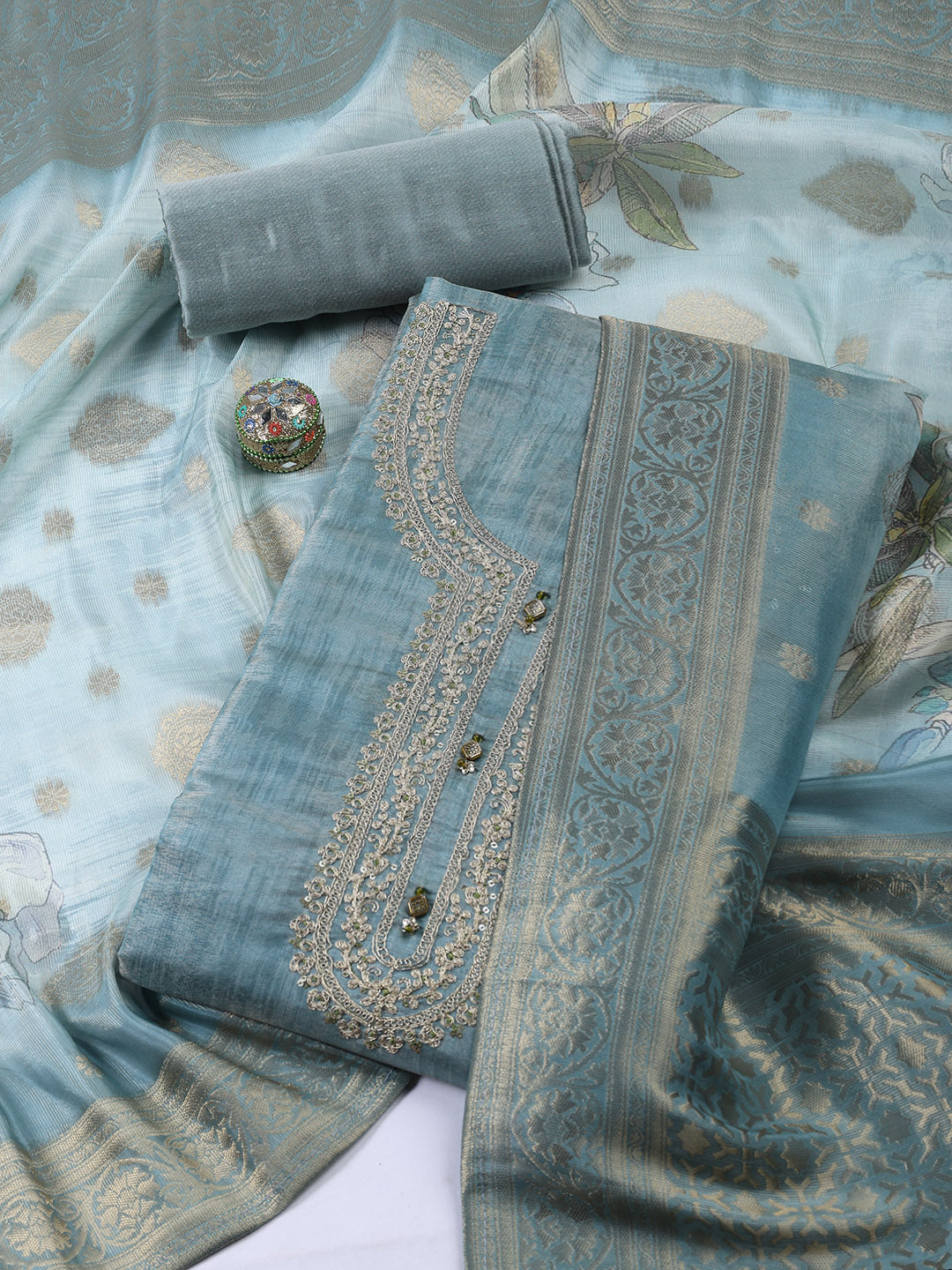 Neck Embroidered Tissue Unstitched Suit Piece With Dupatta