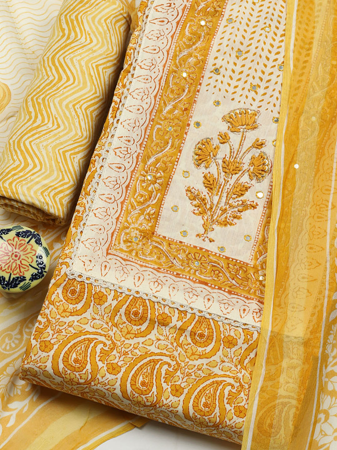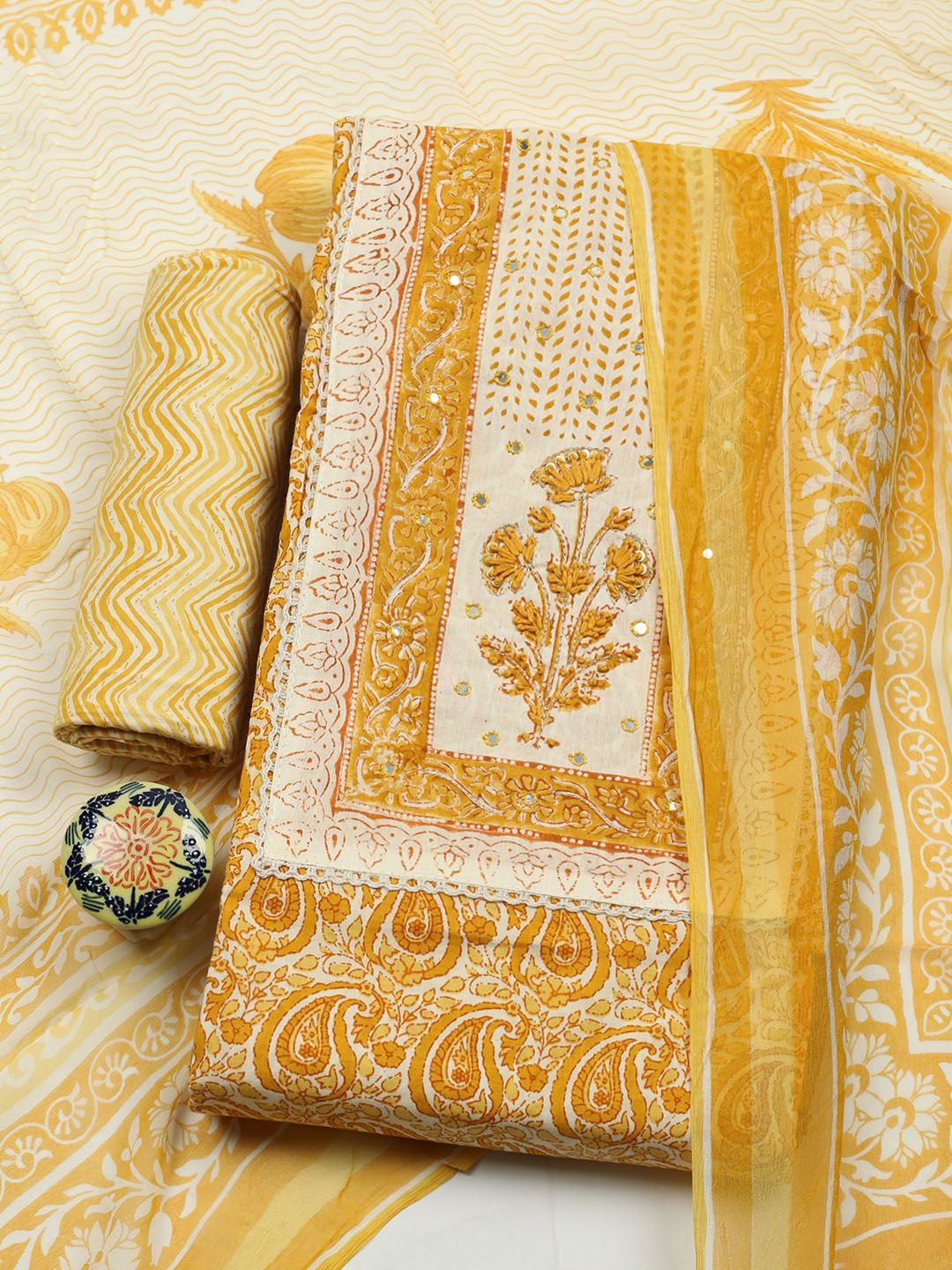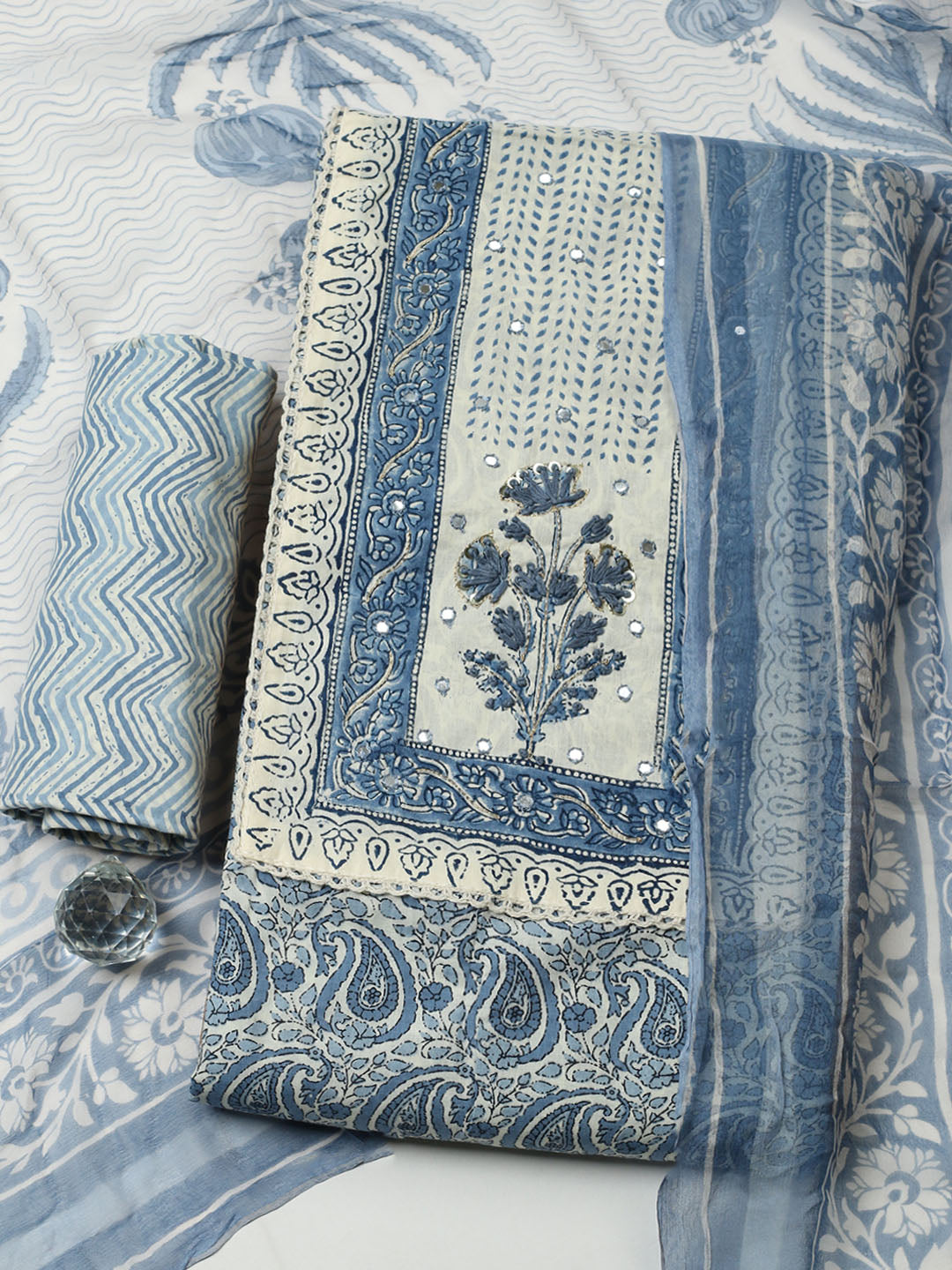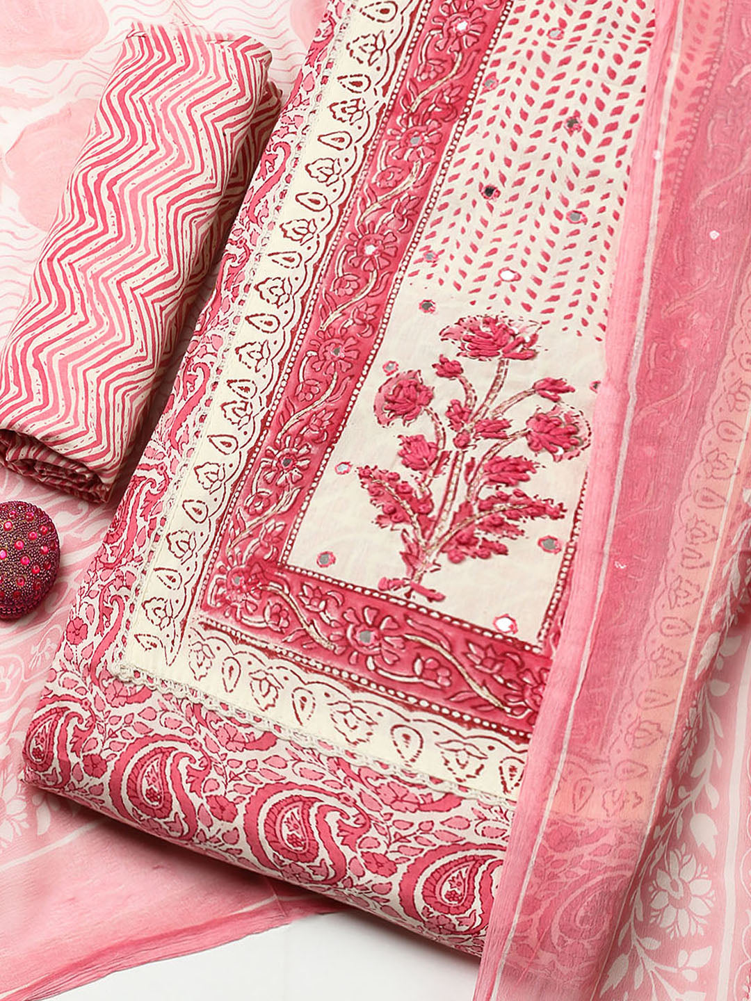 Printed Cotton Blend Unstitched Suit With Pant & Dupatta