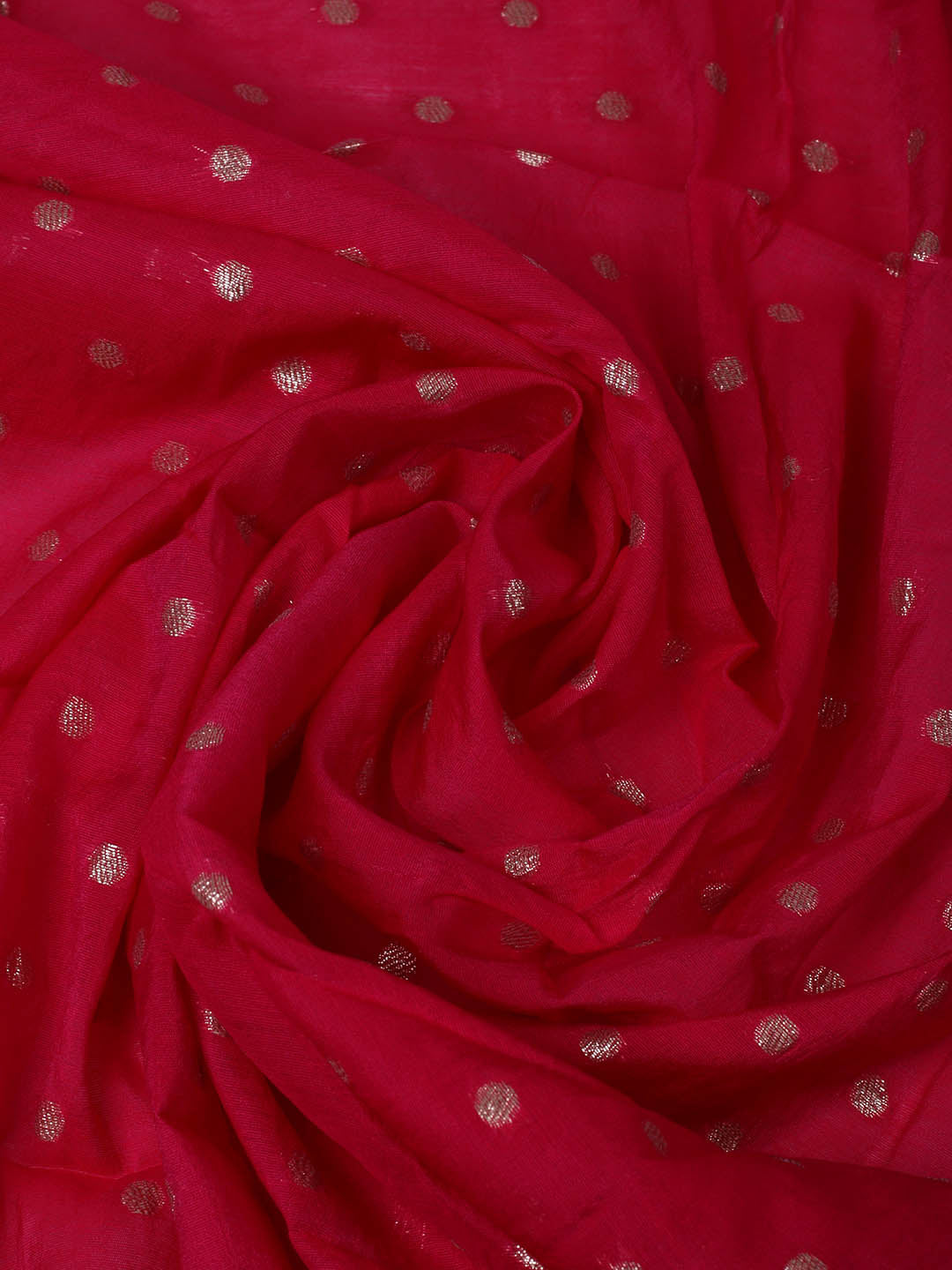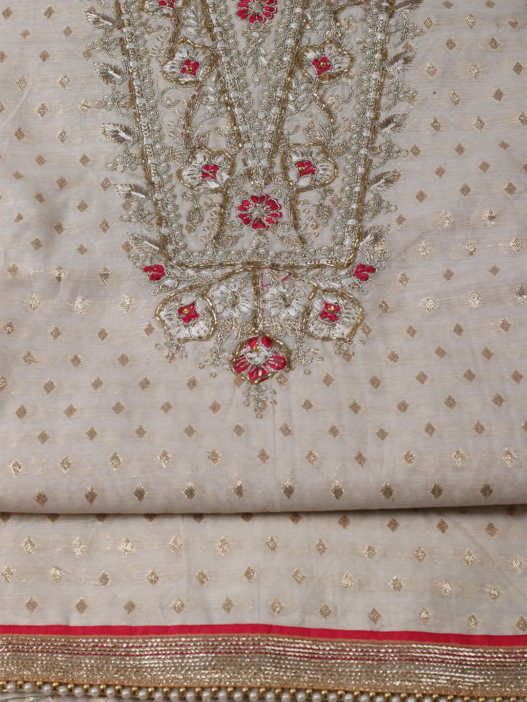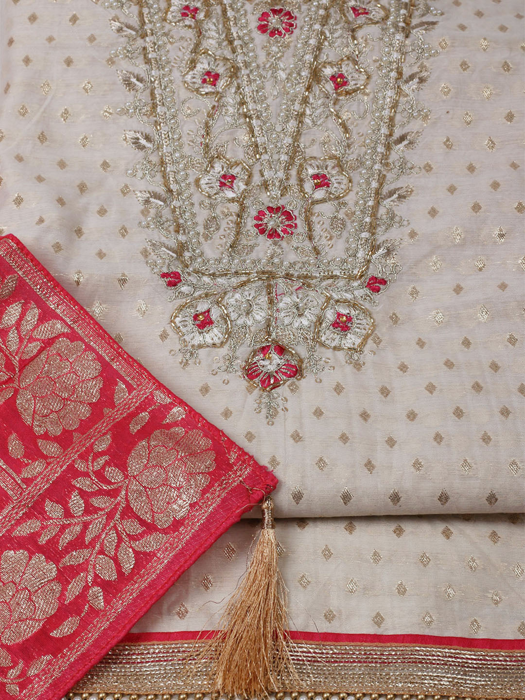 Embroidered Chanderi Cream-Rani Unstitched Suit With Pant & Dupatta