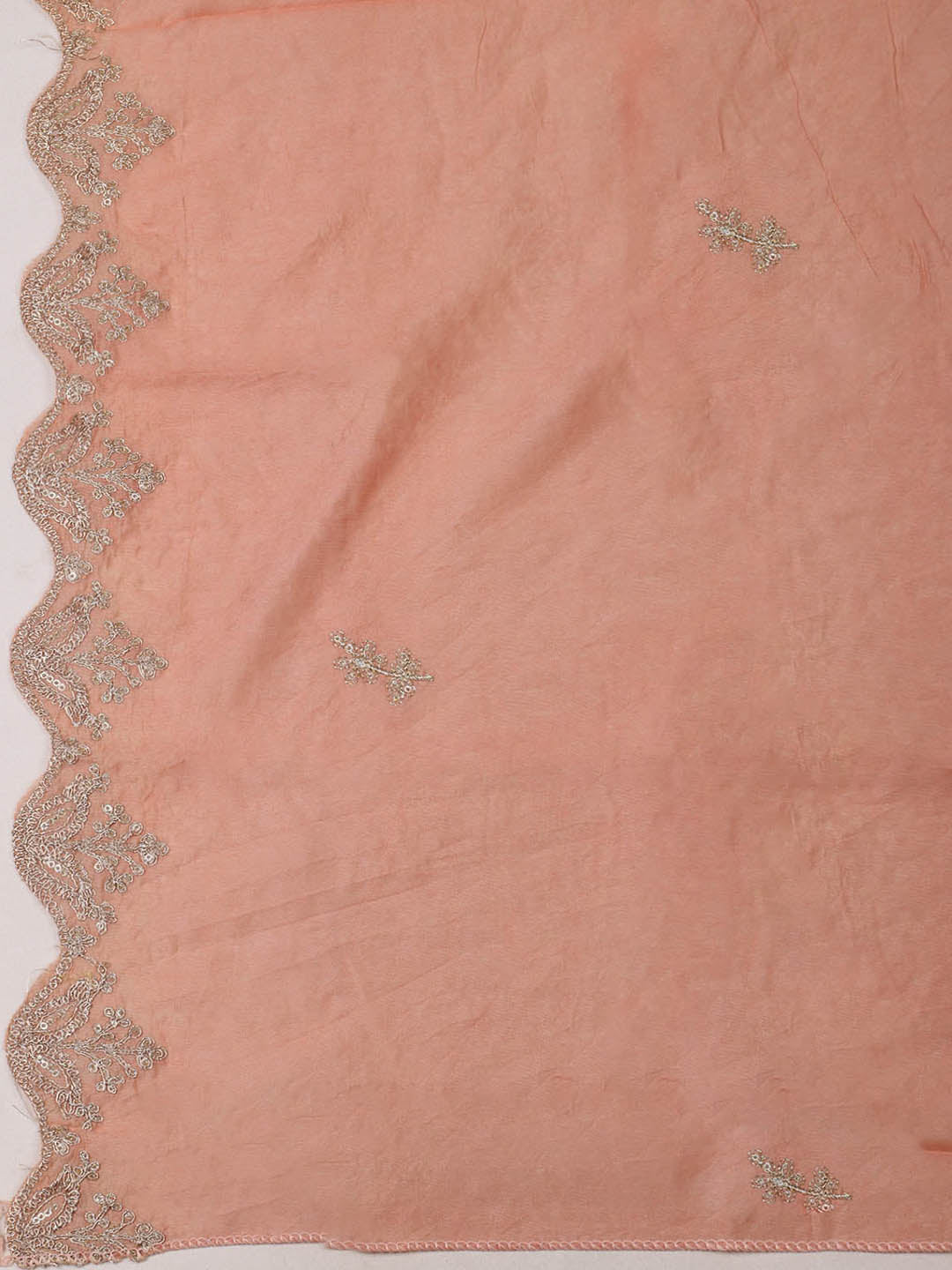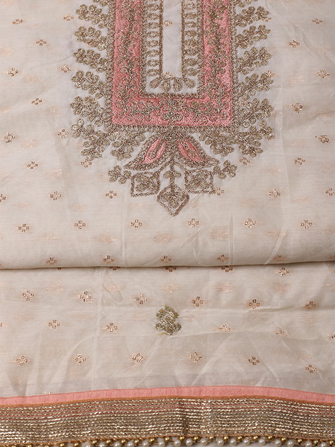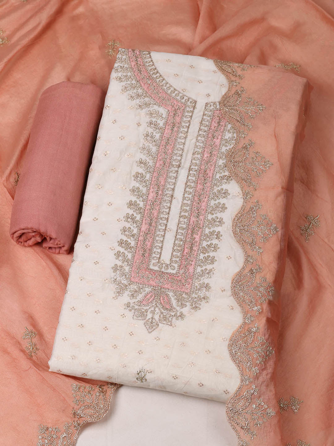 Embroidered Chanderi Cream-Peach Unstitched Suit With Pant & Dupatta