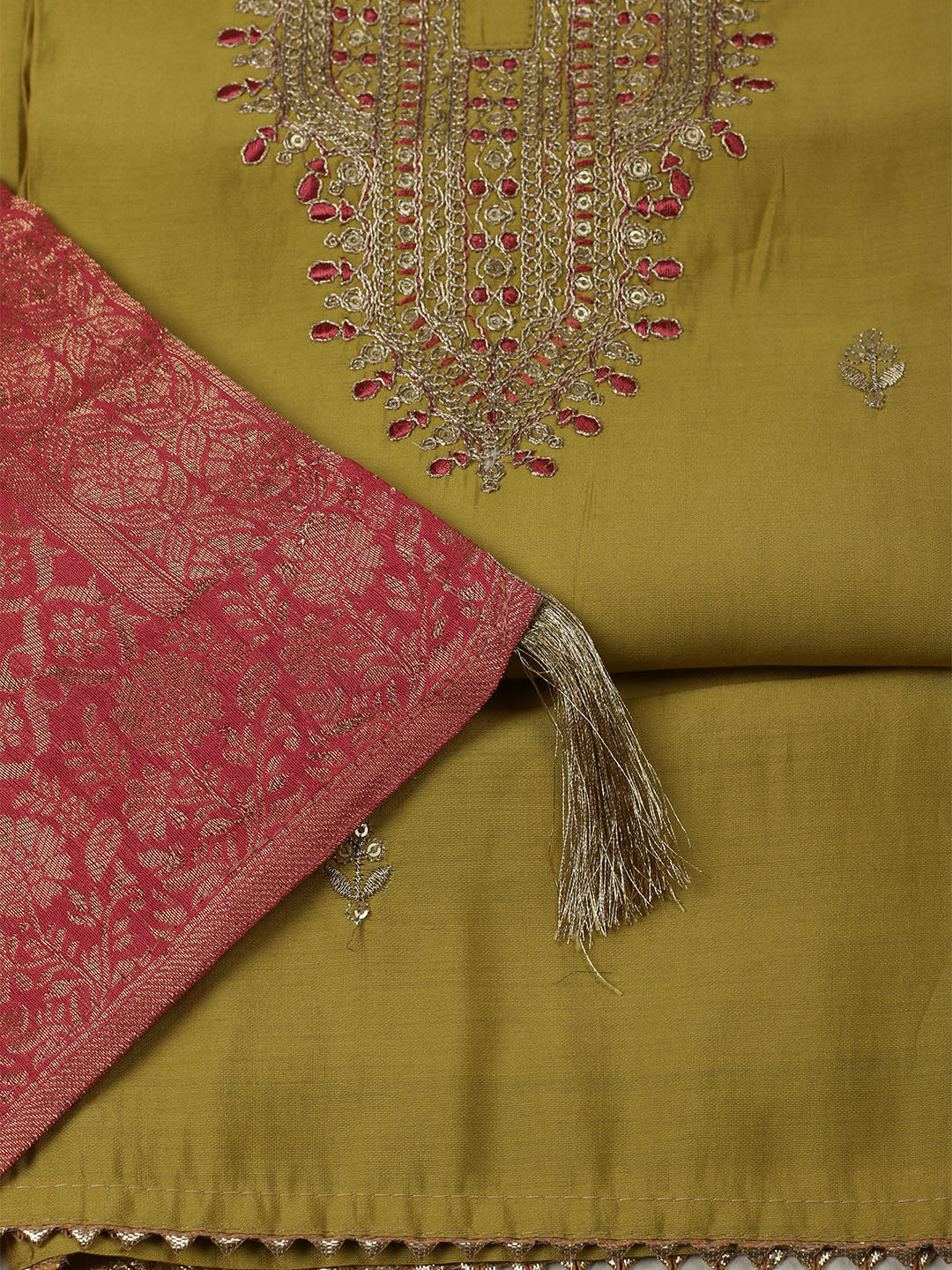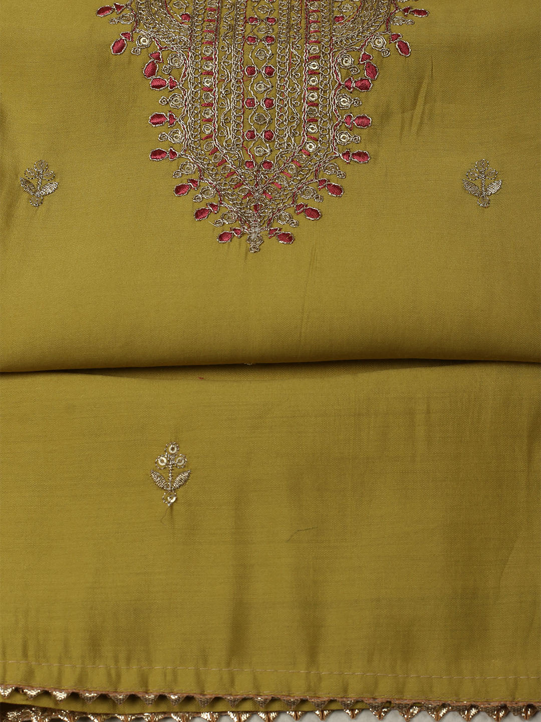 Embroidered Chanderi Mehndi Unstitched Suit With Pant & Dupatta