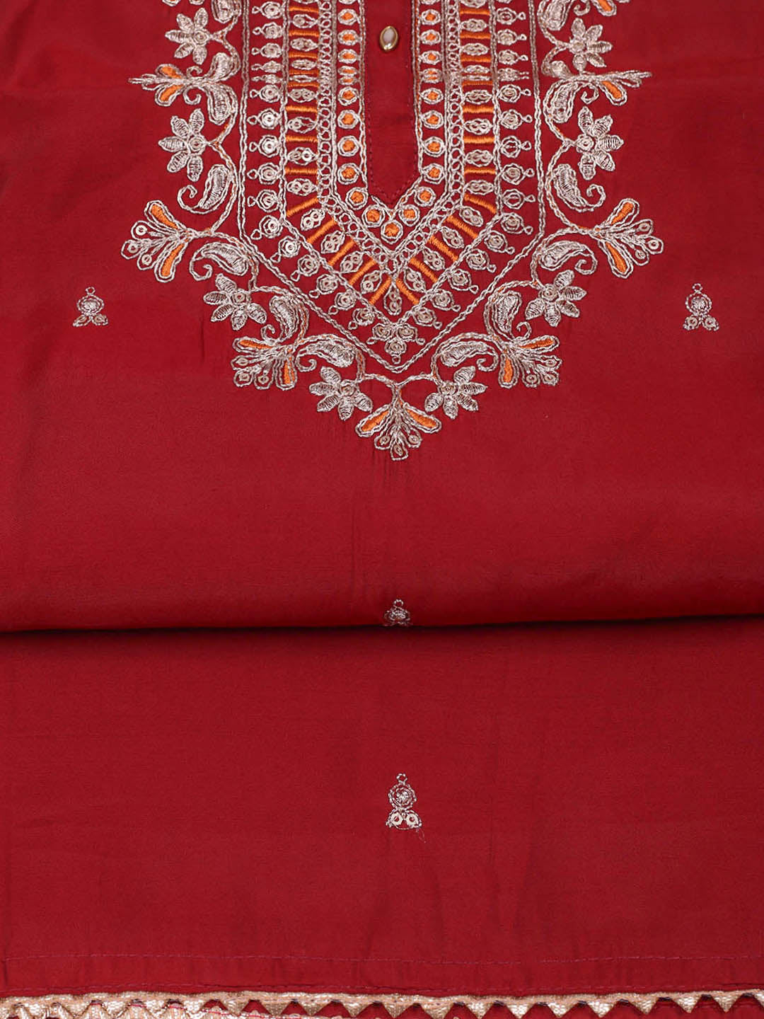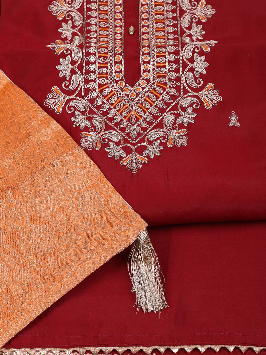 Embroidered Chanderi Maroon Unstitched Suit With Pant & Dupatta