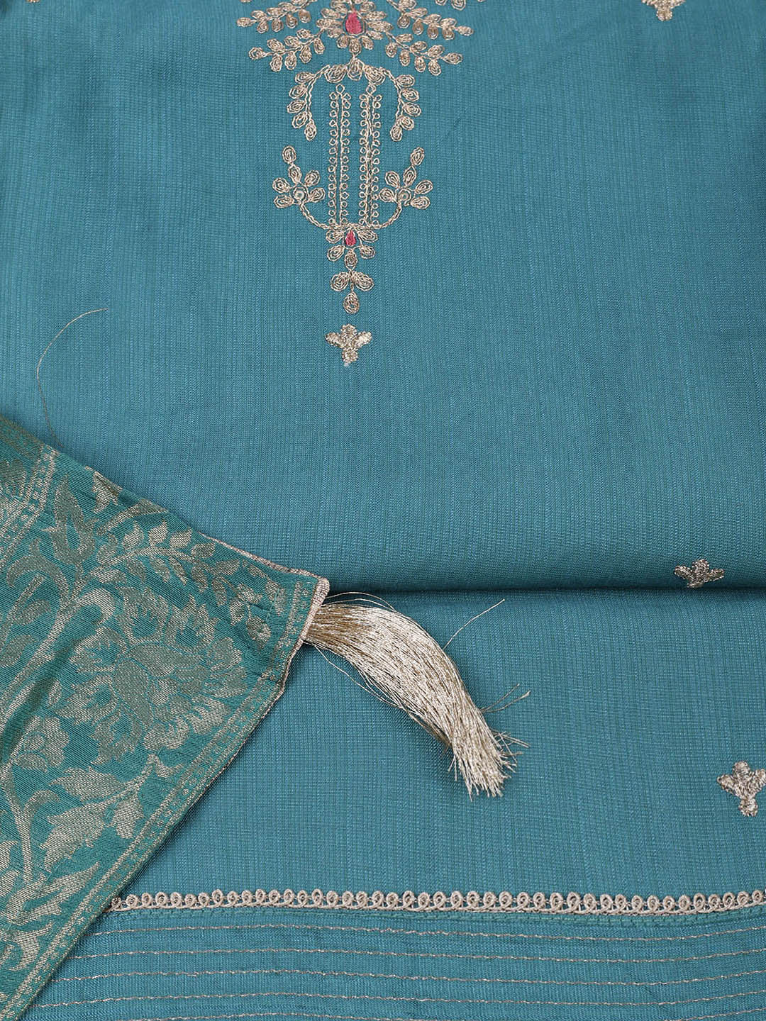 Embroidered Chanderi Rama Green Unstitched Suit With Pant & Dupatta