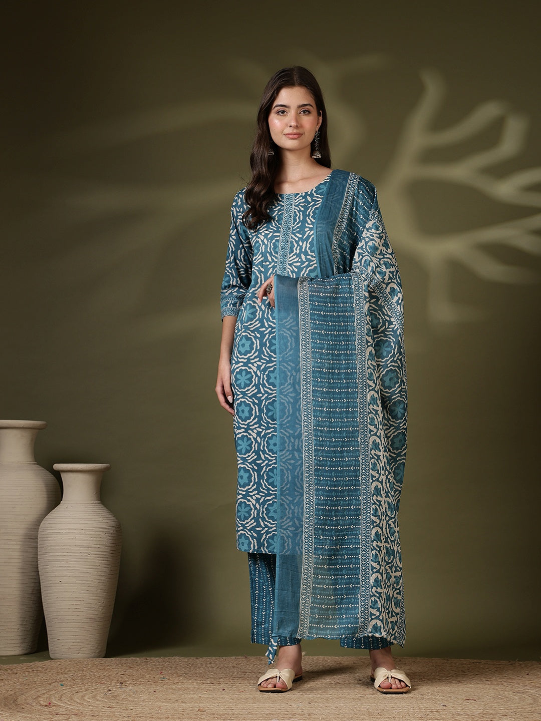 Printed Cotton Blend Kurta With Pant & Dupatta