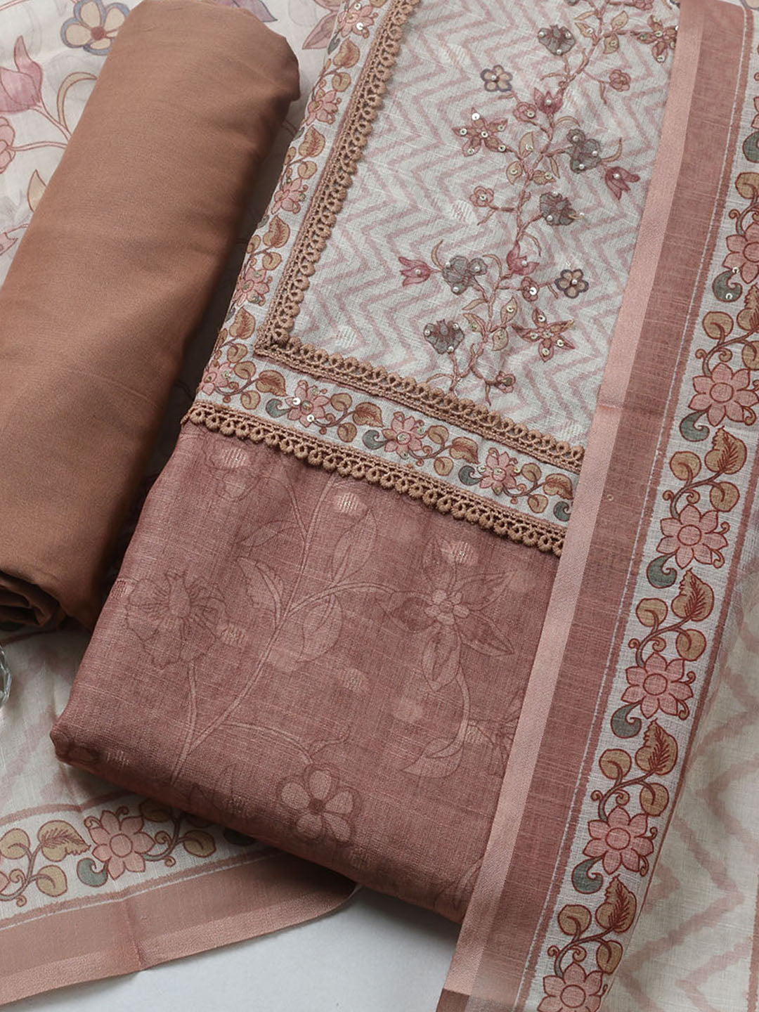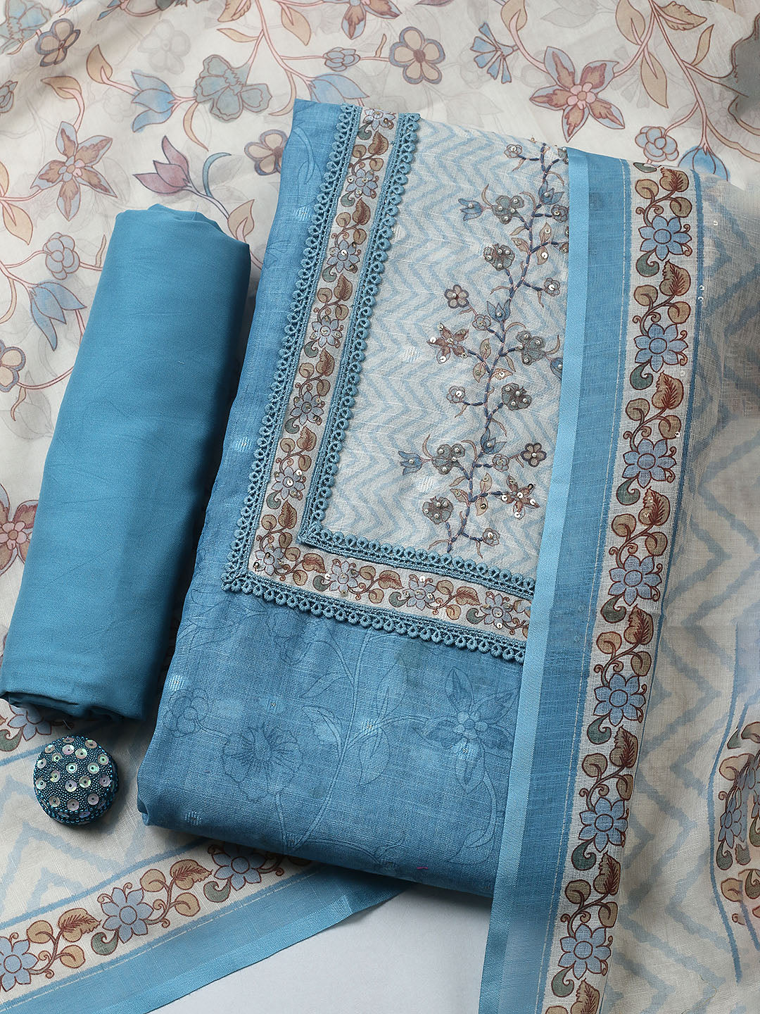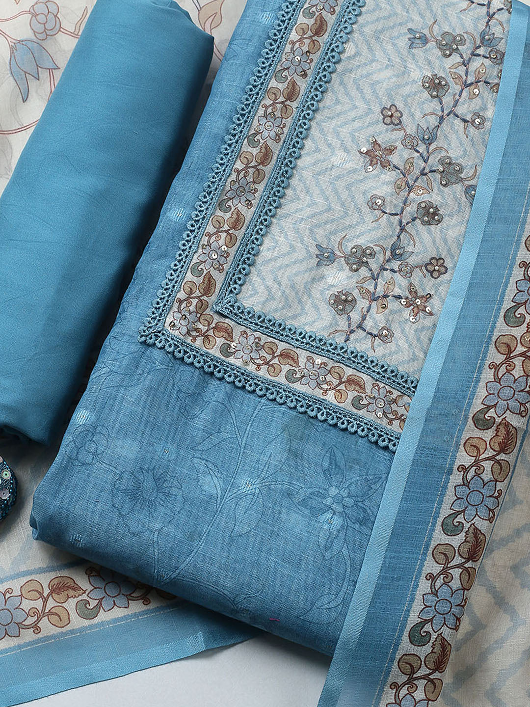 Printed Cotton Blend Unstitched Suit With Pant & Dupatta
