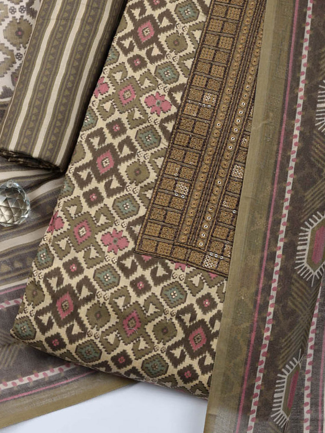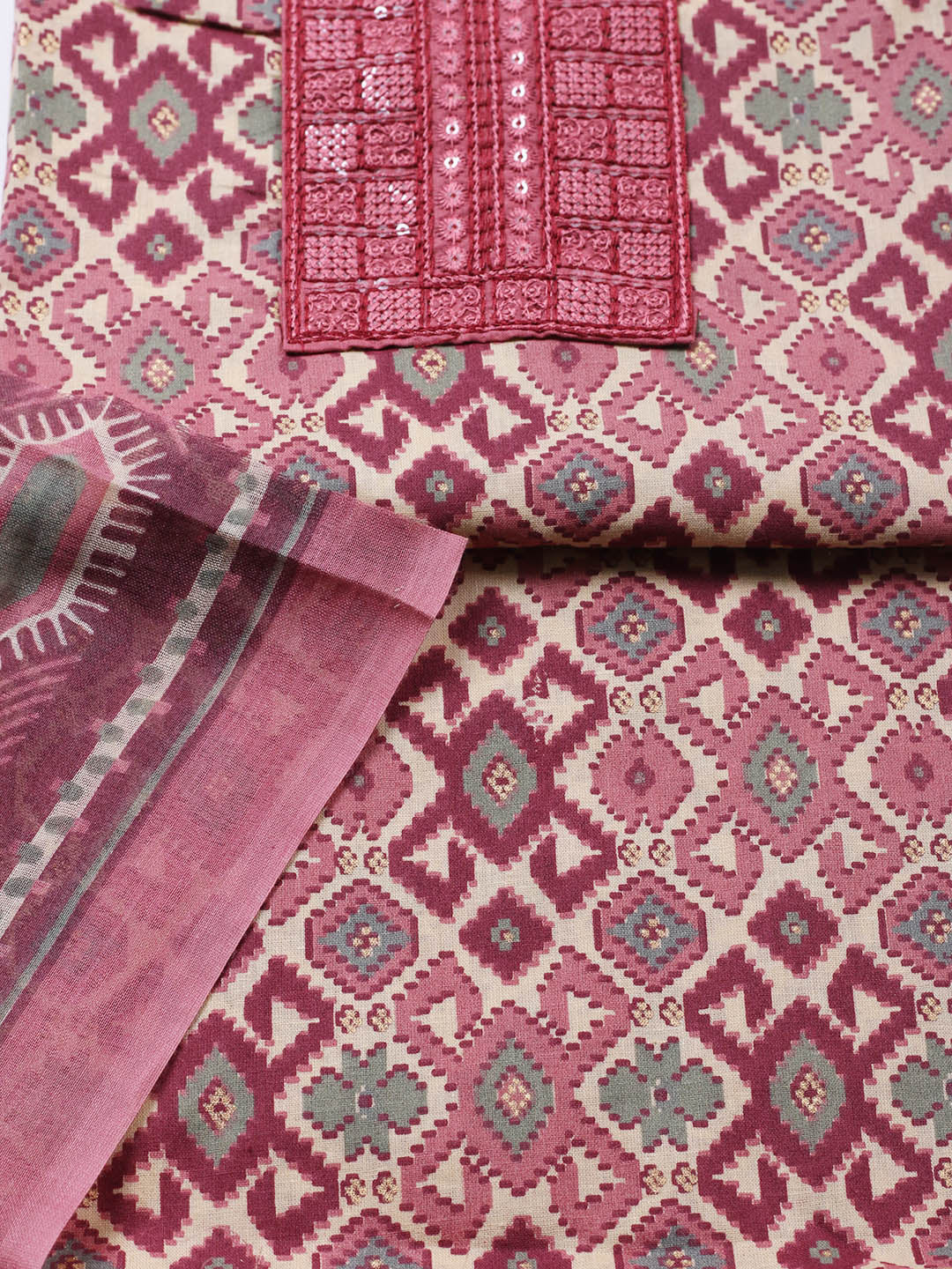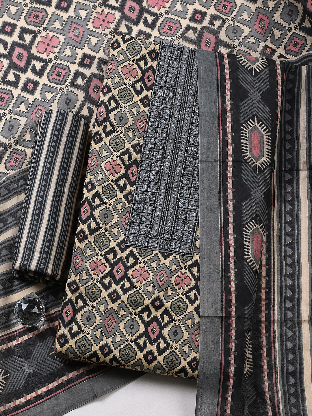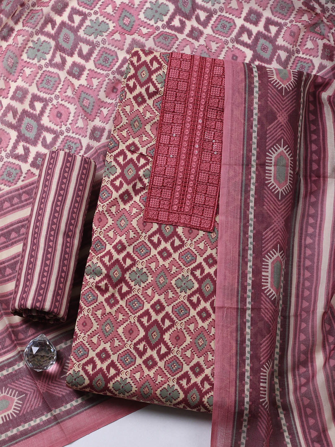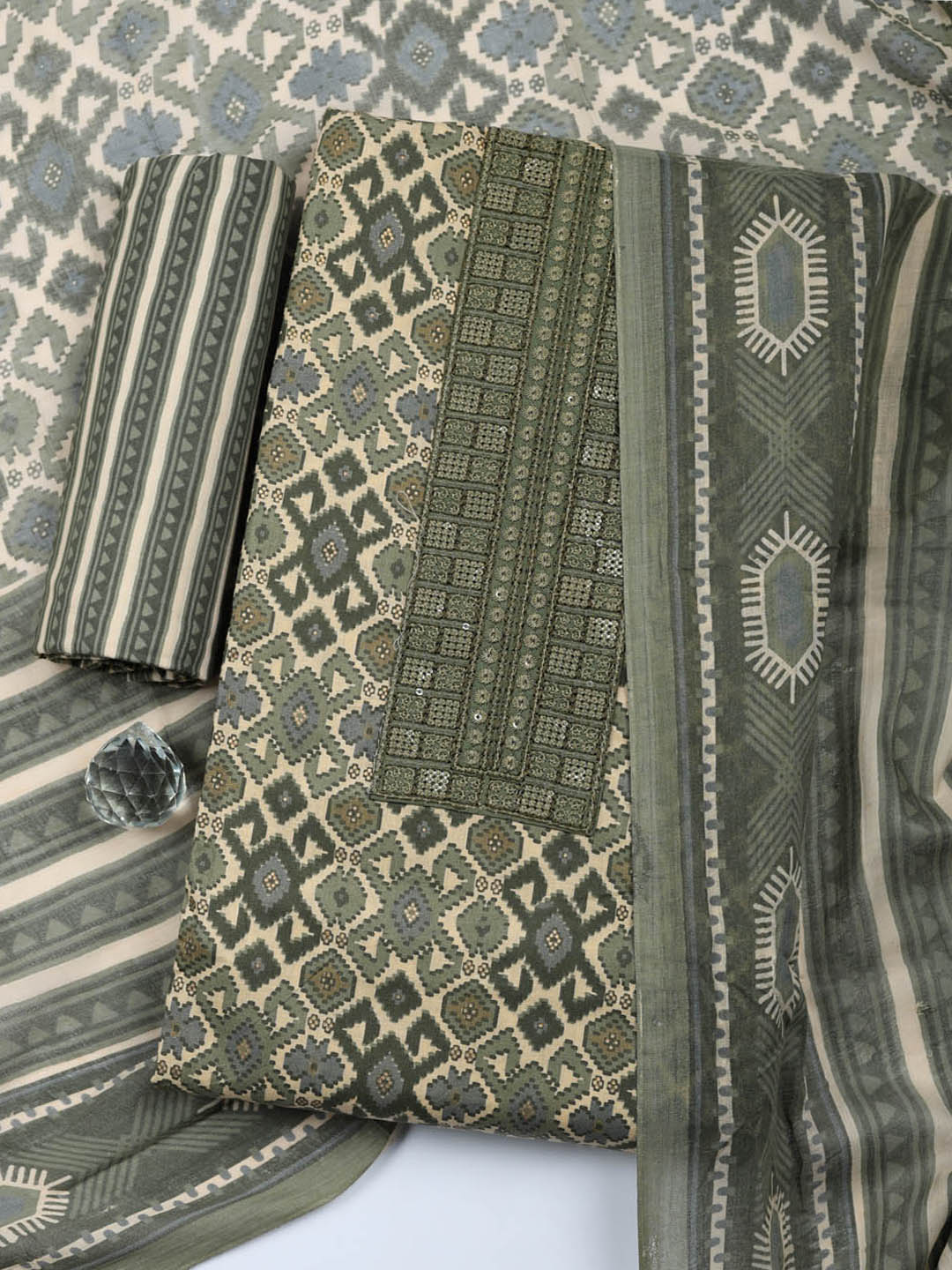 Printed Cotton Blend Unstitched Suit With Pant & Dupatta