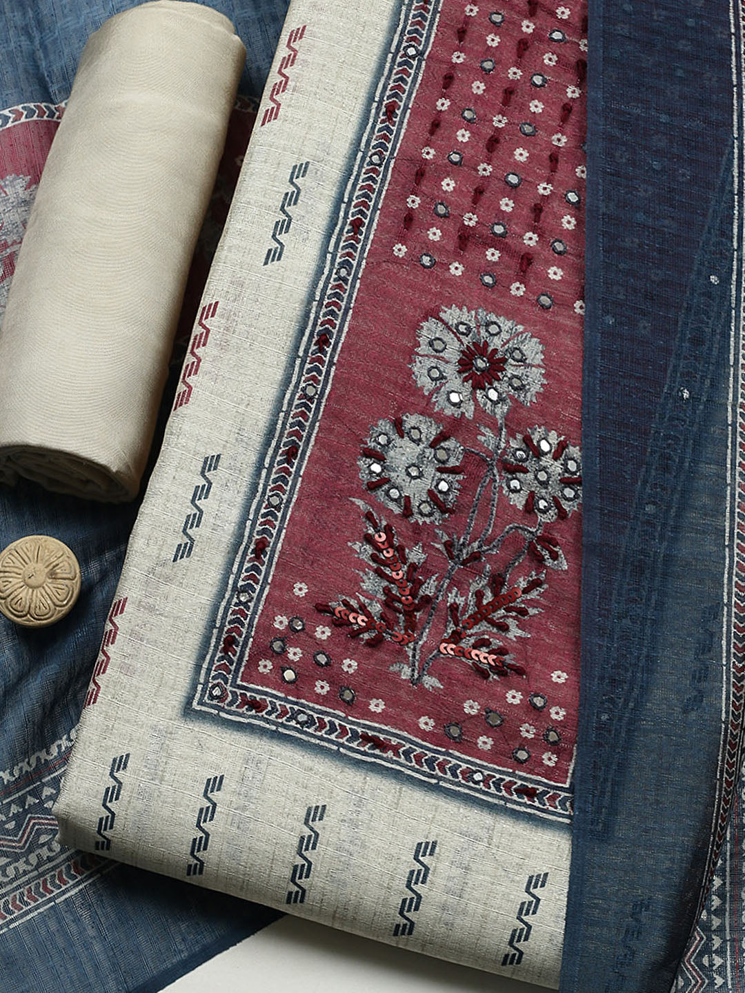 Printed Cotton Blend Unstitched Suit With Pant & Dupatta