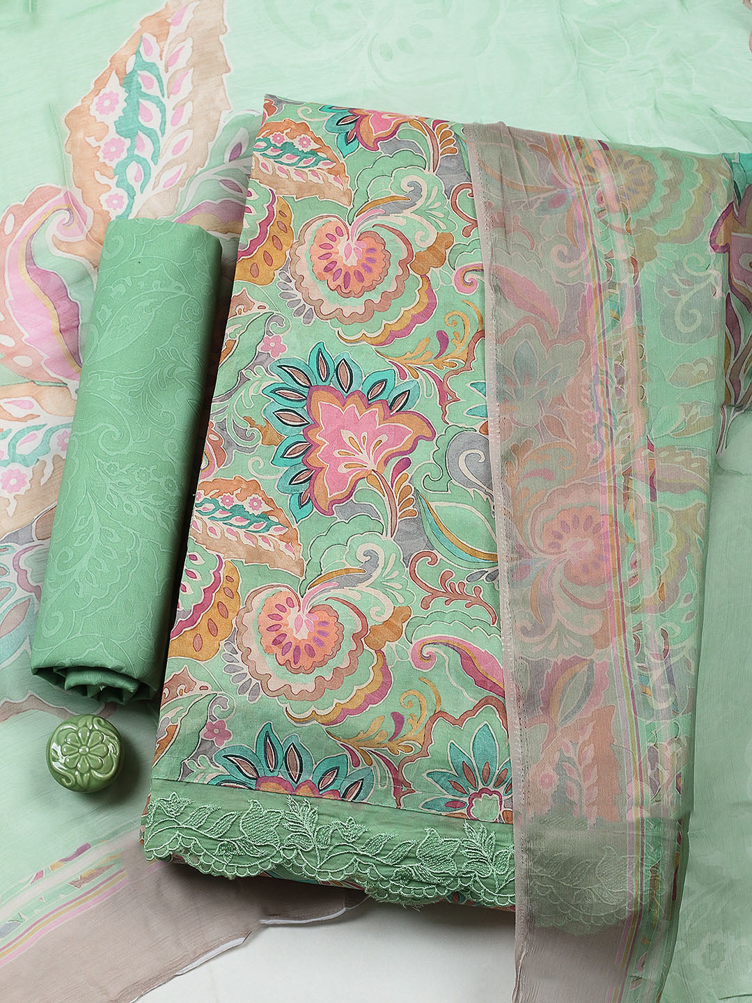 Embroidered Cotton Blend Unstitched Suit With Pant & Dupatta