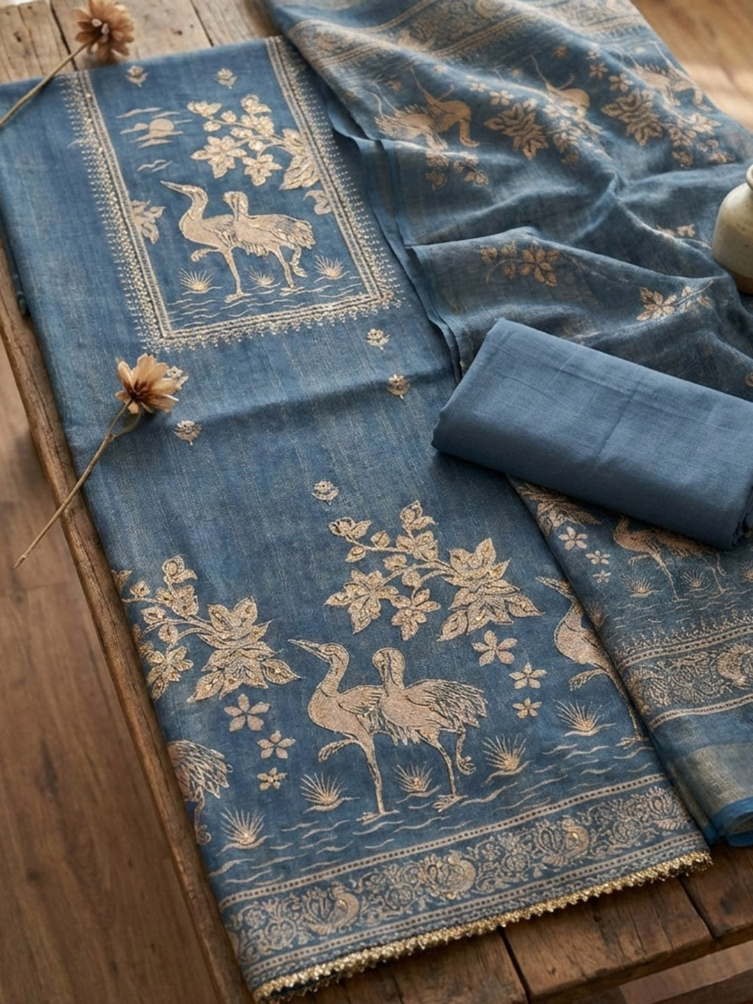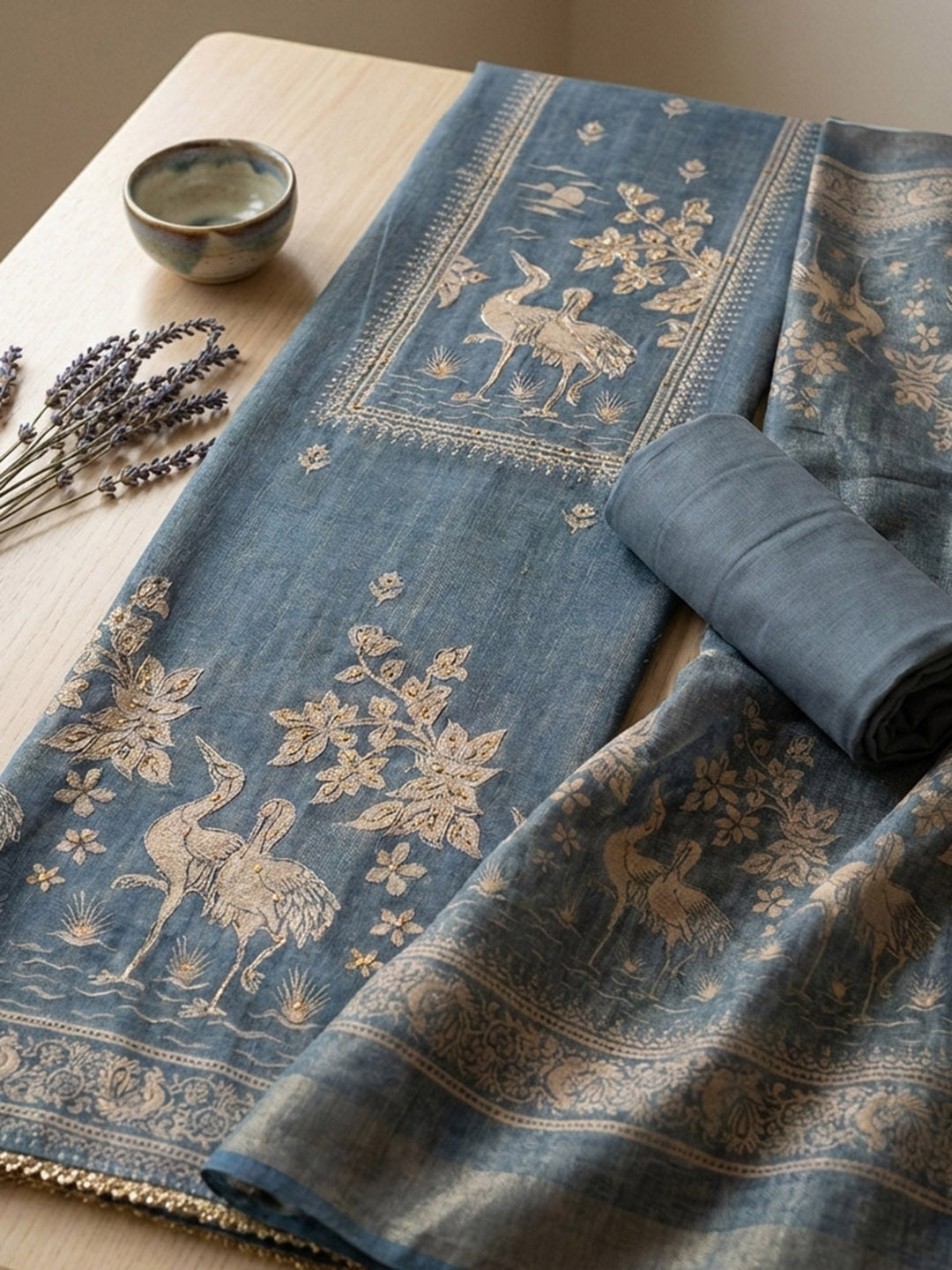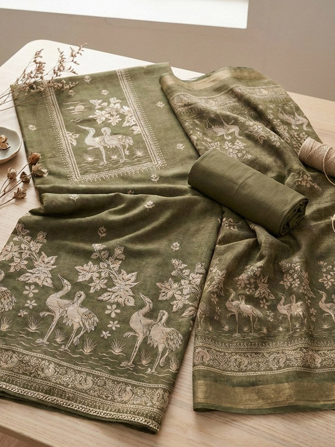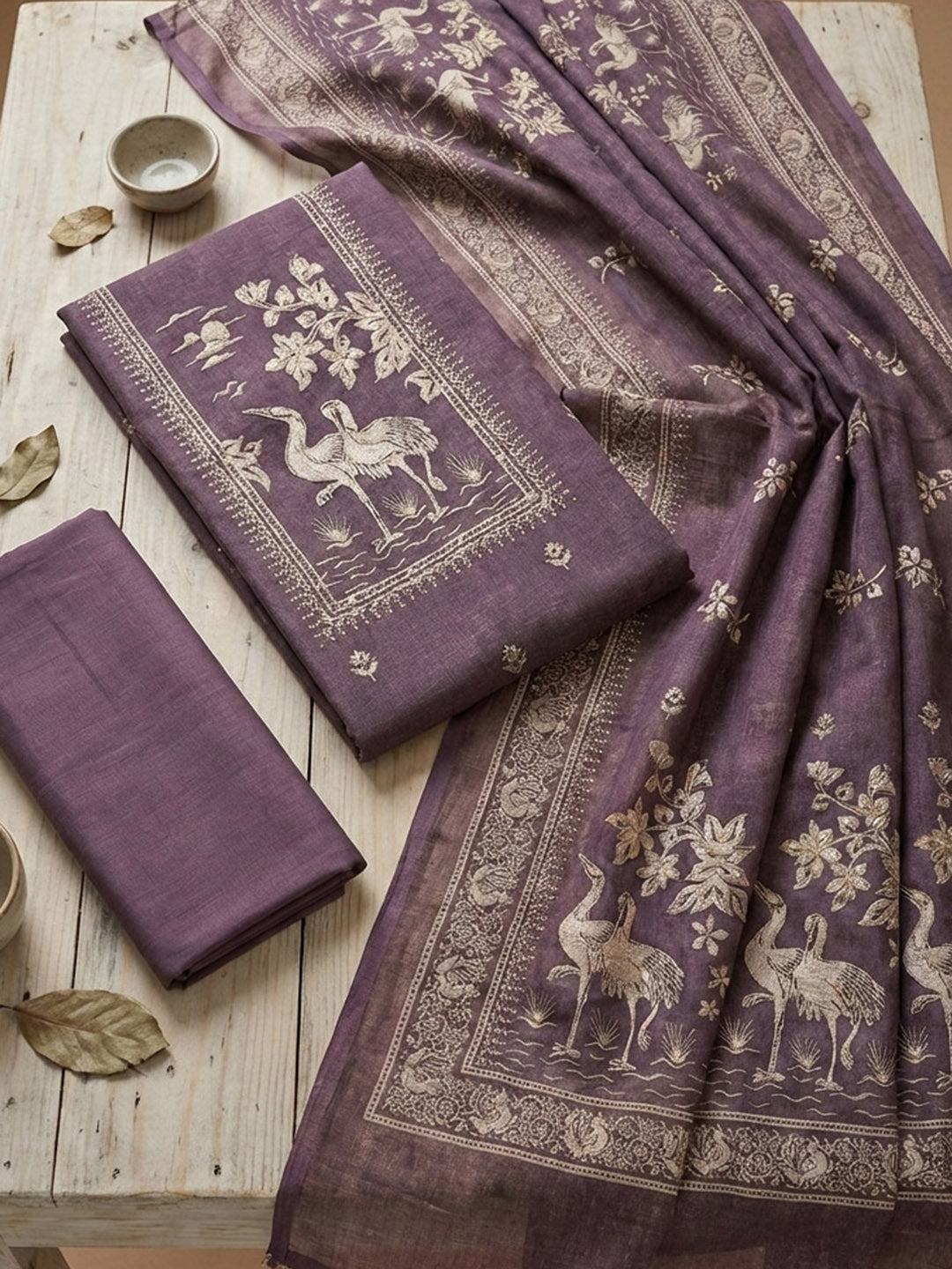 Printed Chanderi Unstitched Suit With Pant & Dupatta
