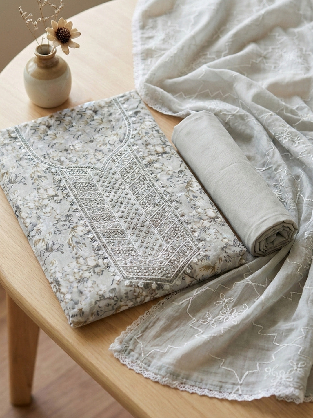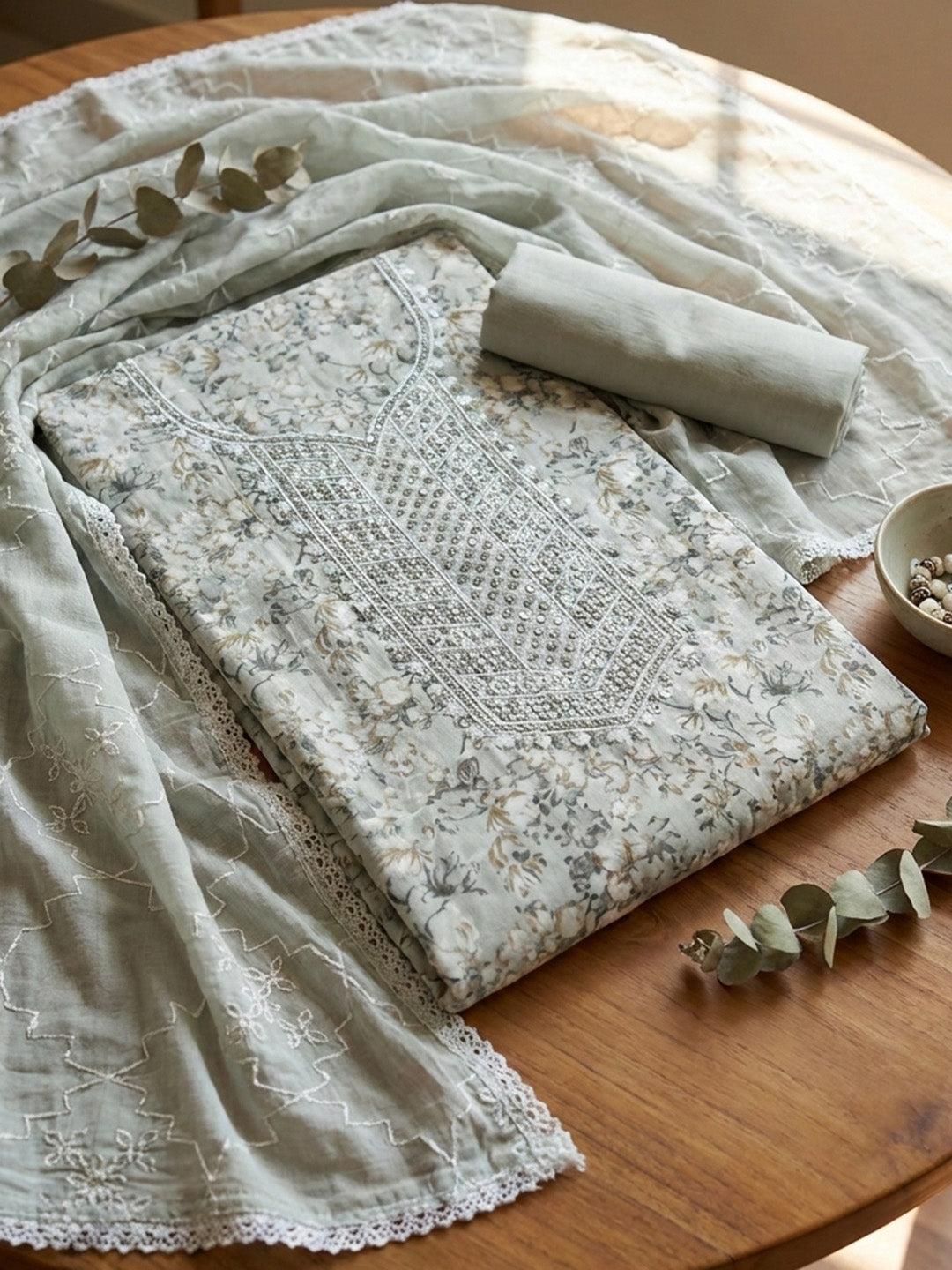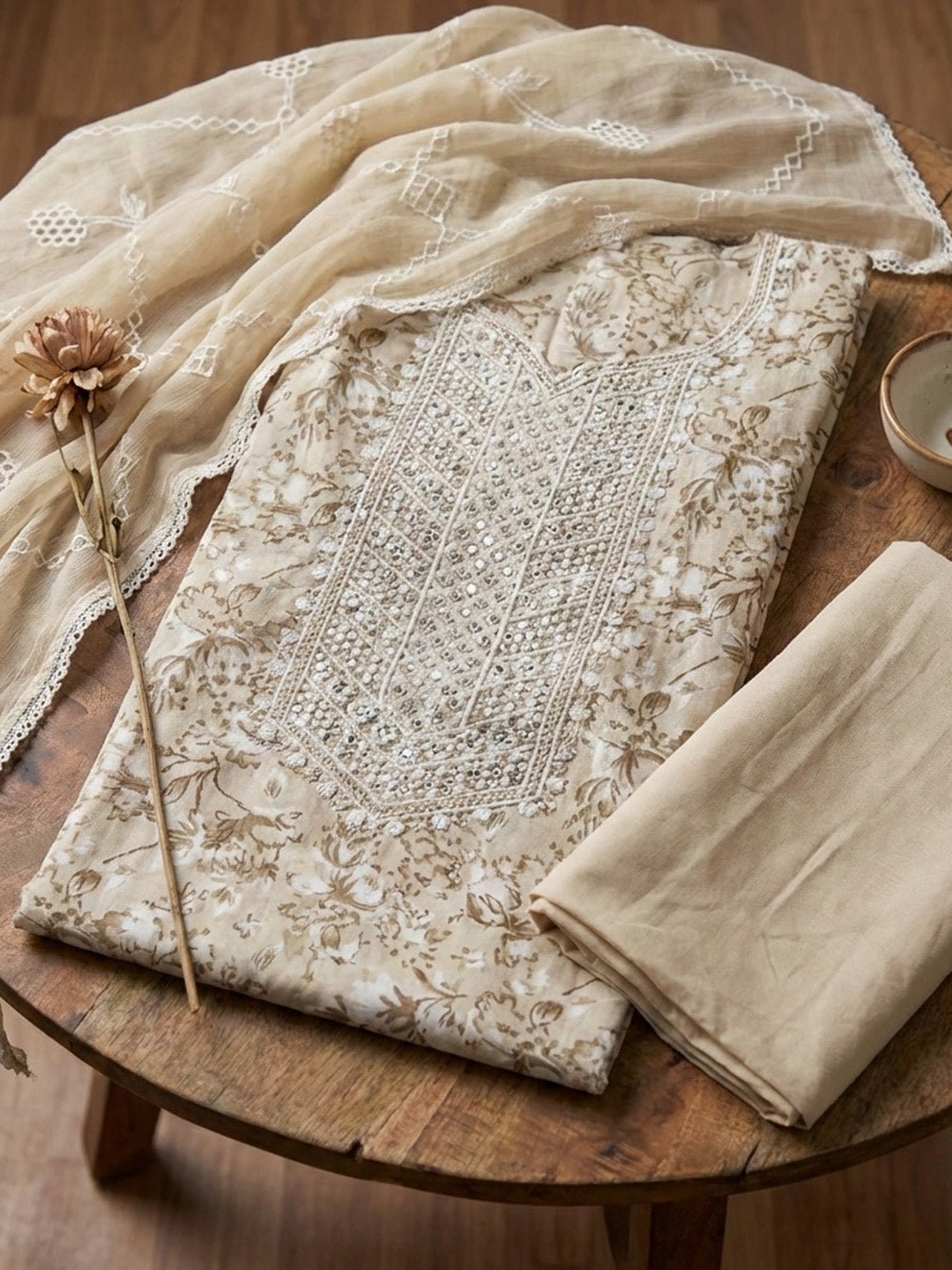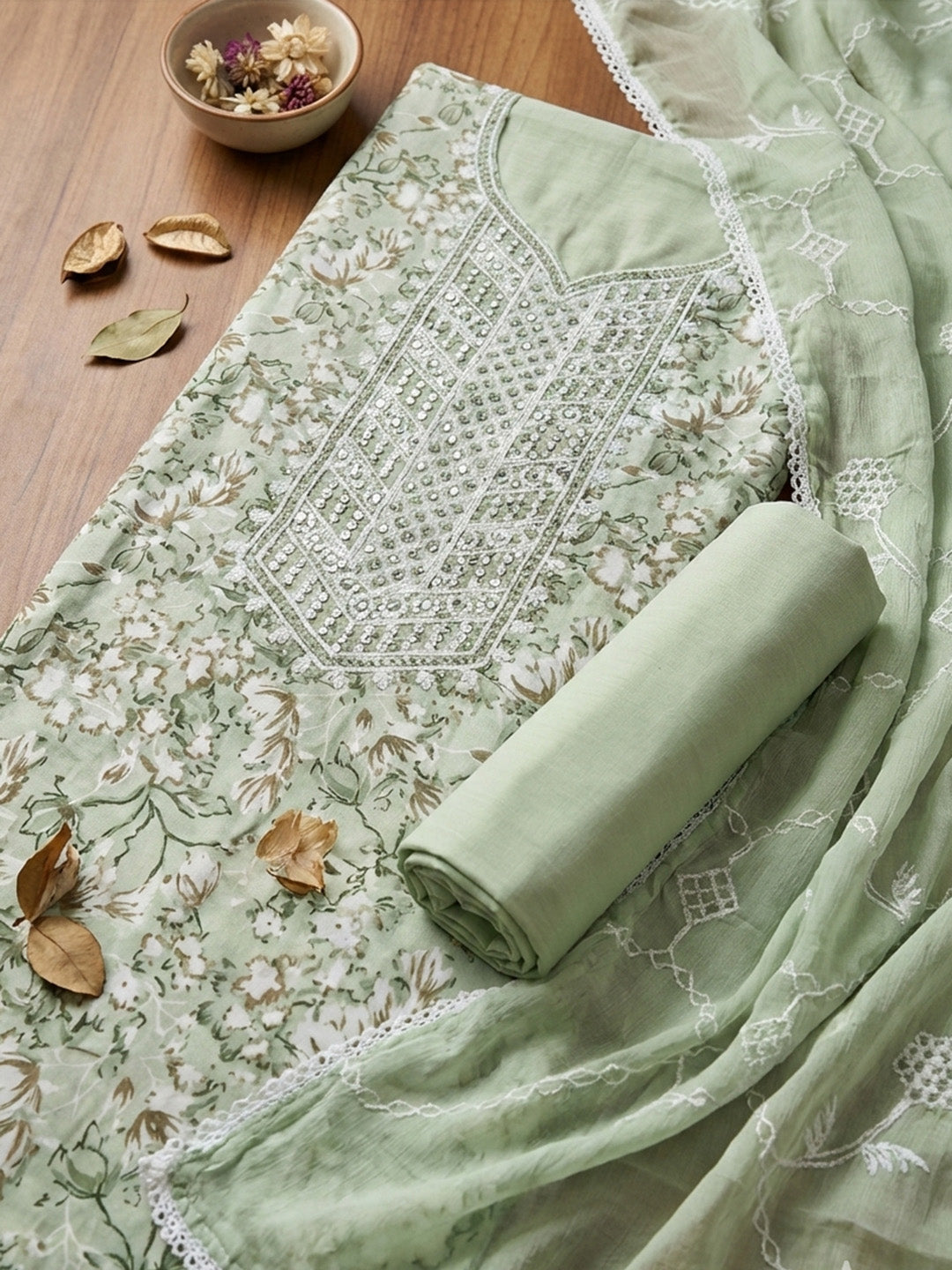Printed Cotton Blend Unstitched Suit With Pant & Dupatta