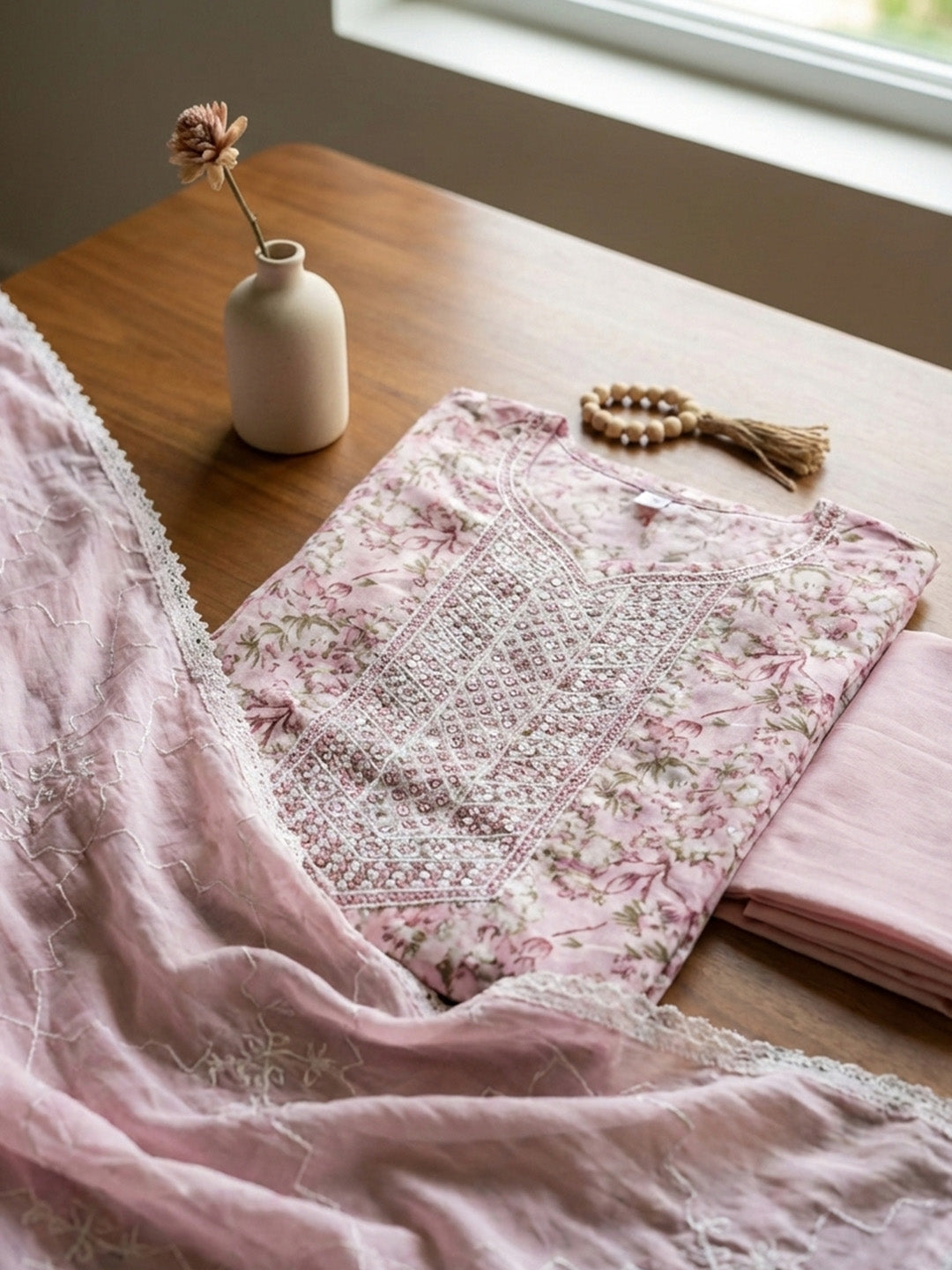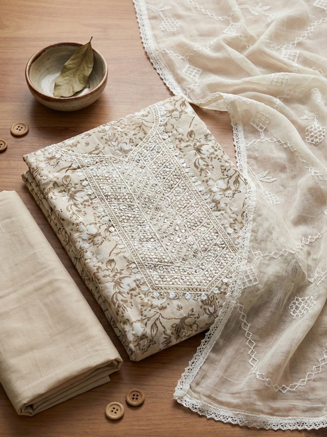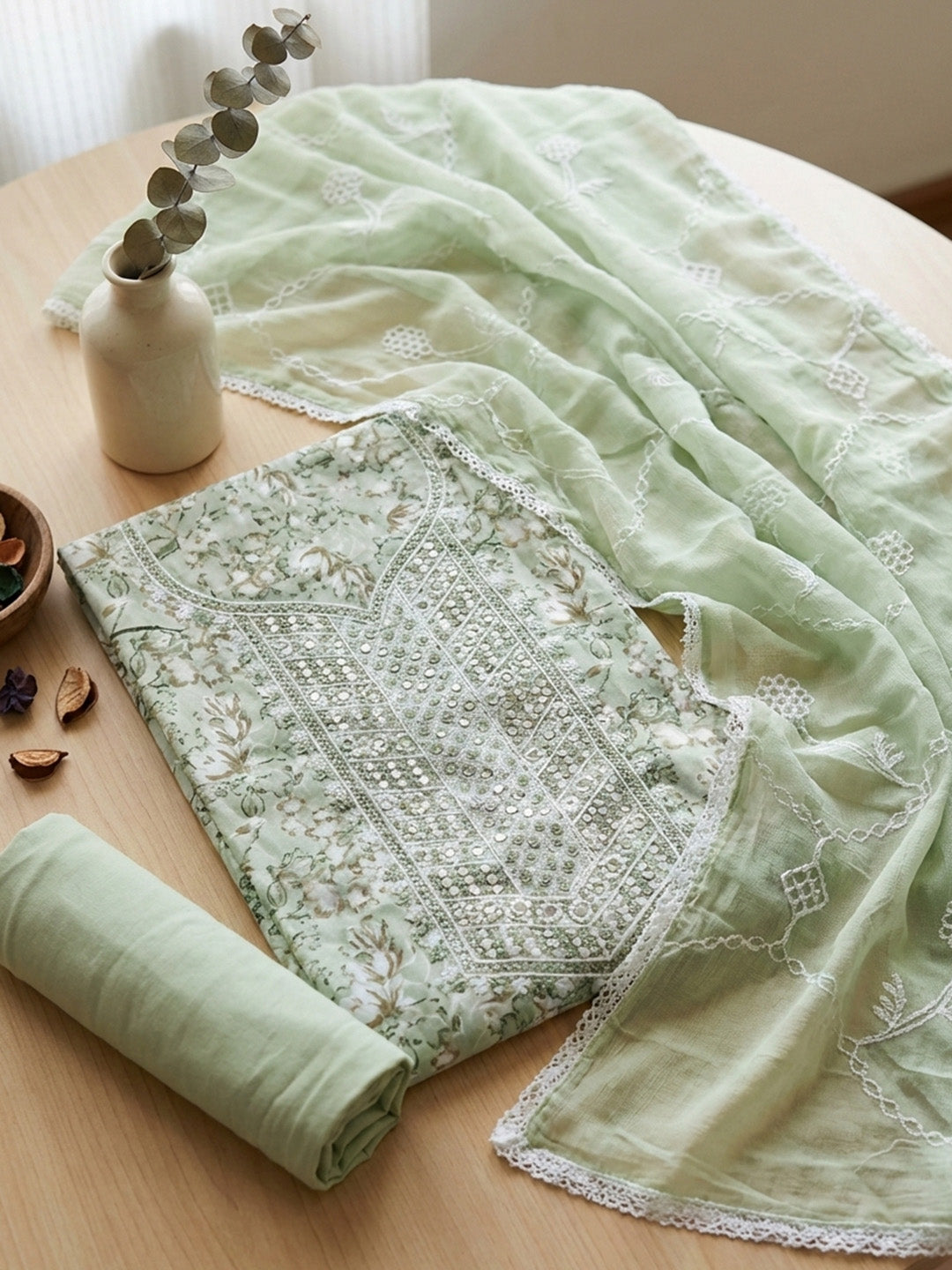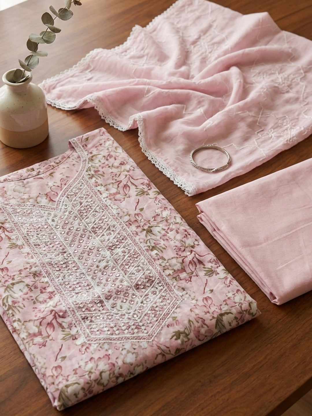 Printed Cotton Blend Unstitched Suit With Pant & Dupatta