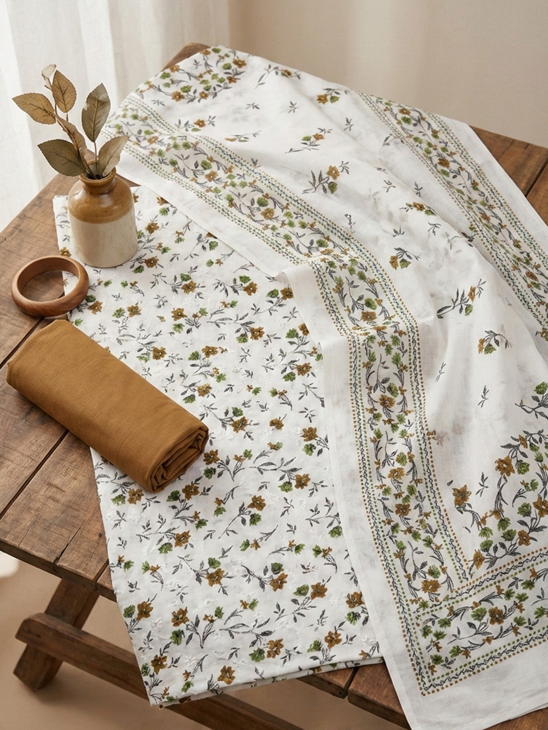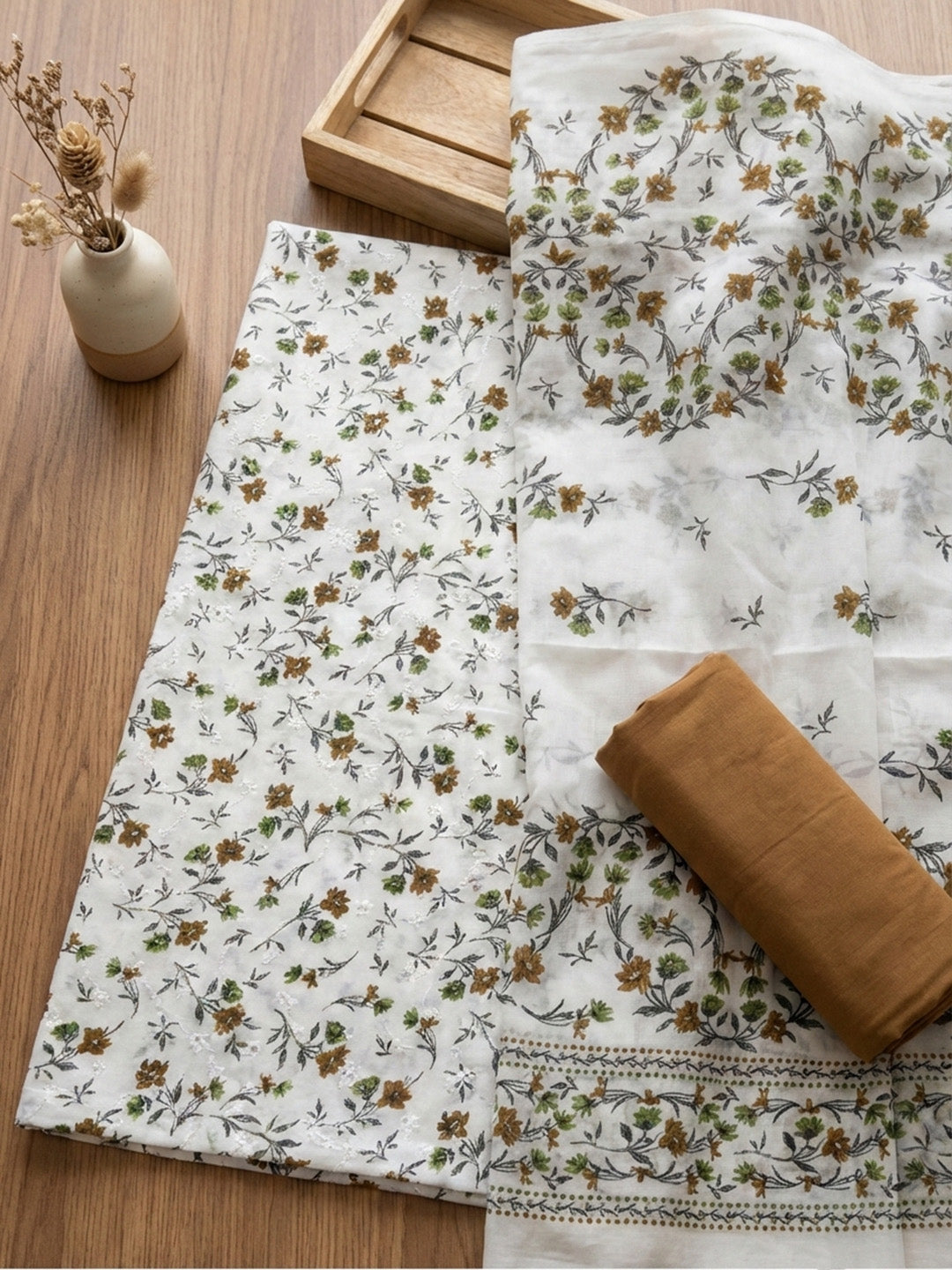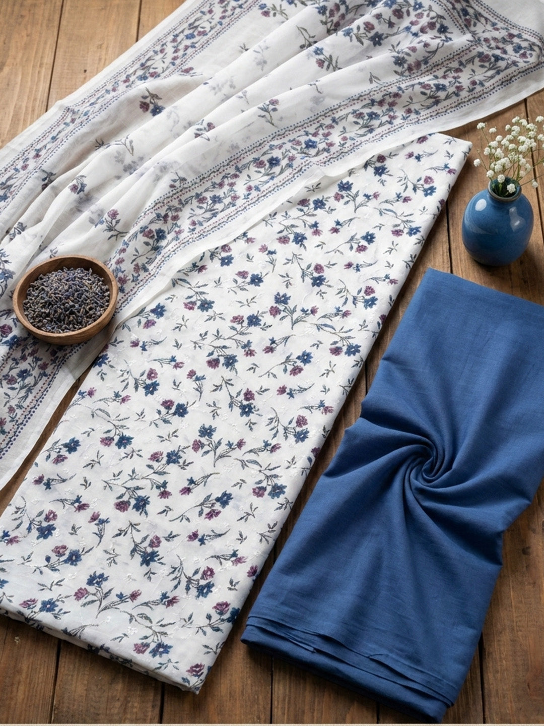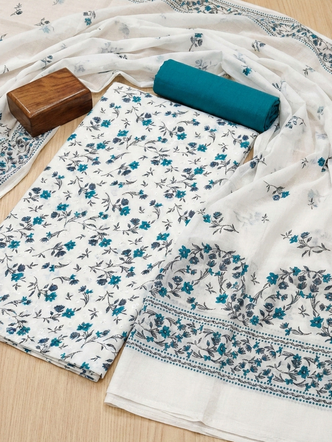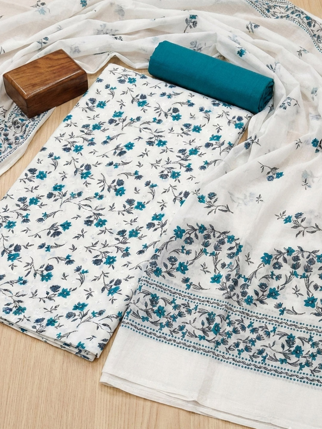 Embroidered Cotton Blend Unstitched Suit With Pant & Dupatta