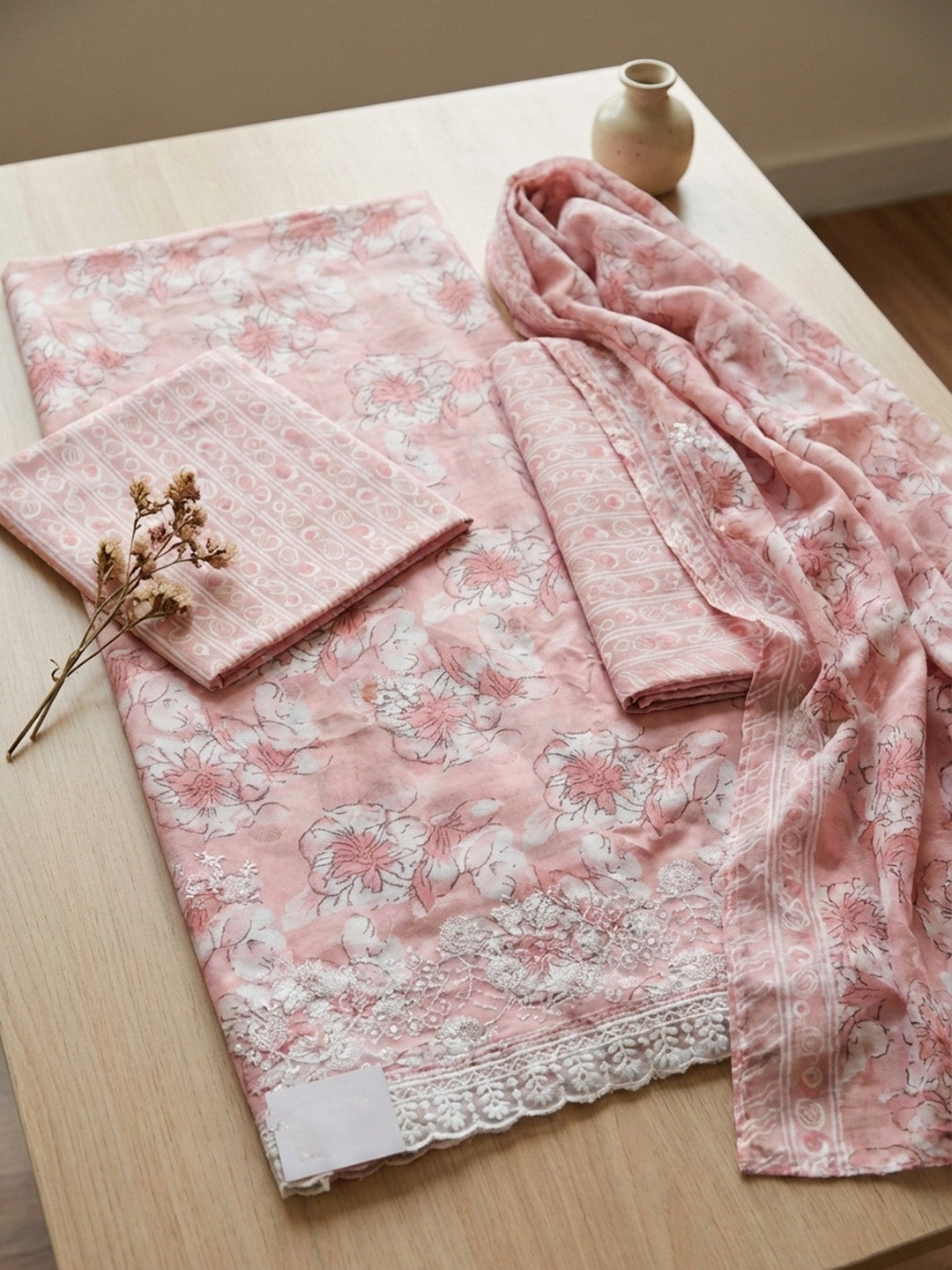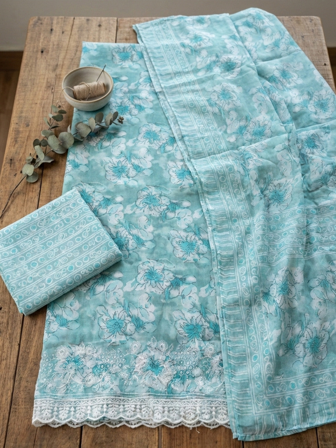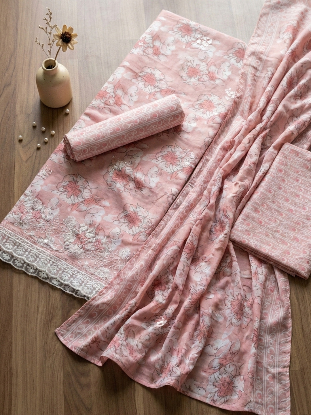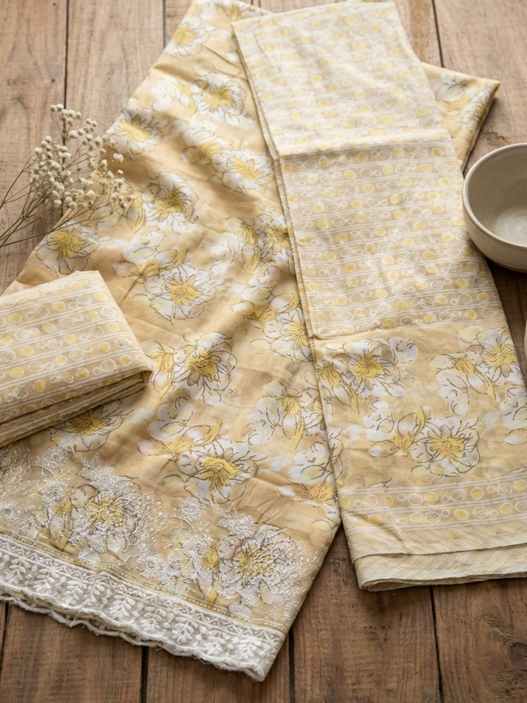 Printed Cotton Blend Unstitched Suit With Pant & Dupatta