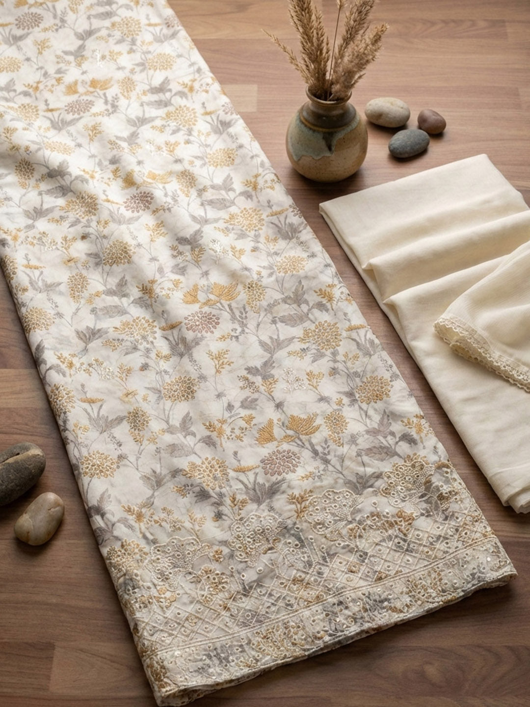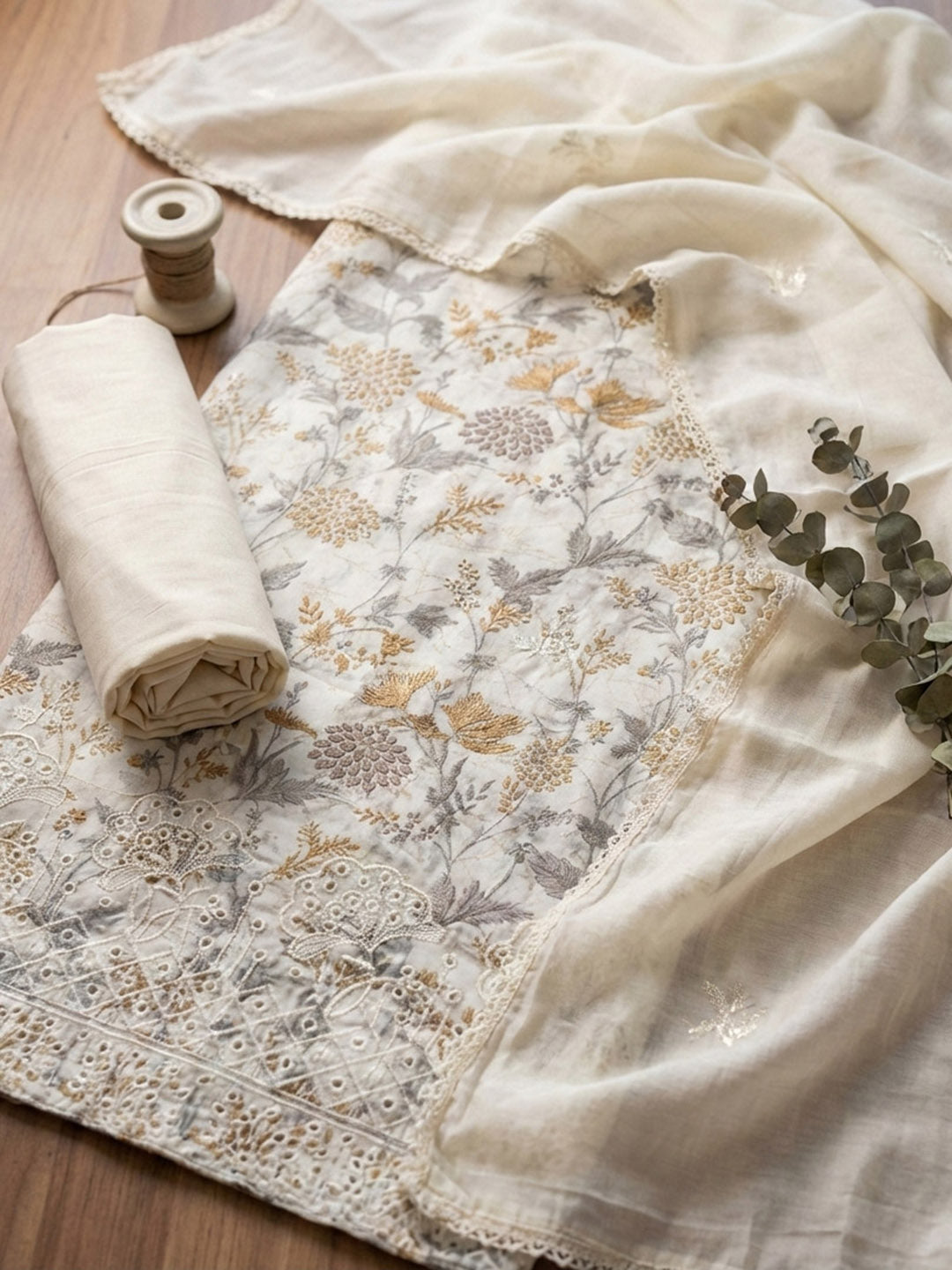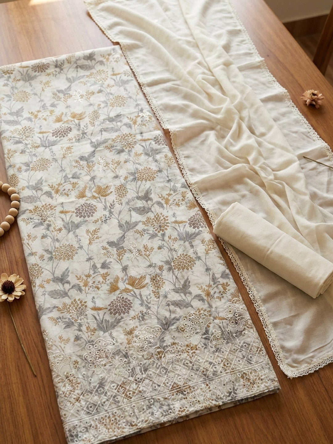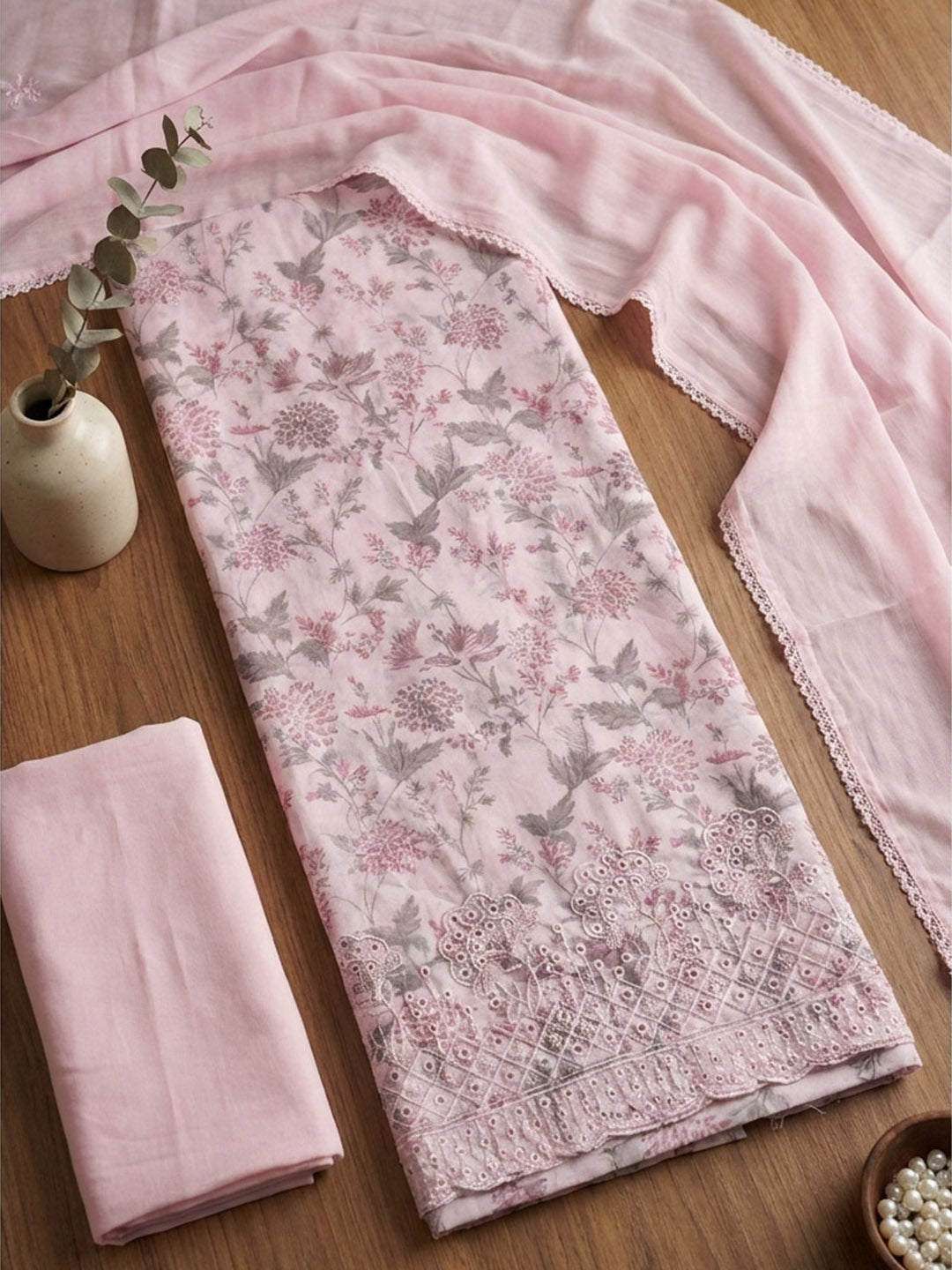 Embroidered Cotton Blend Unstitched Suit With Pant & Dupatta