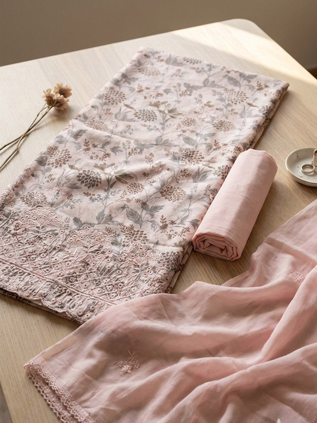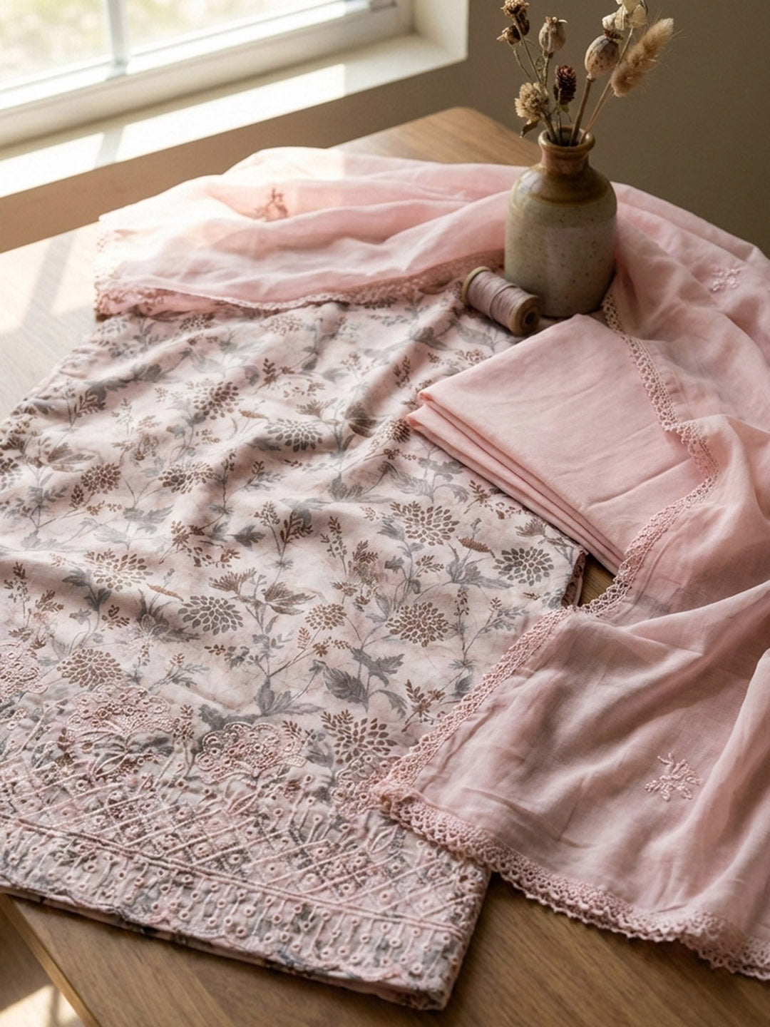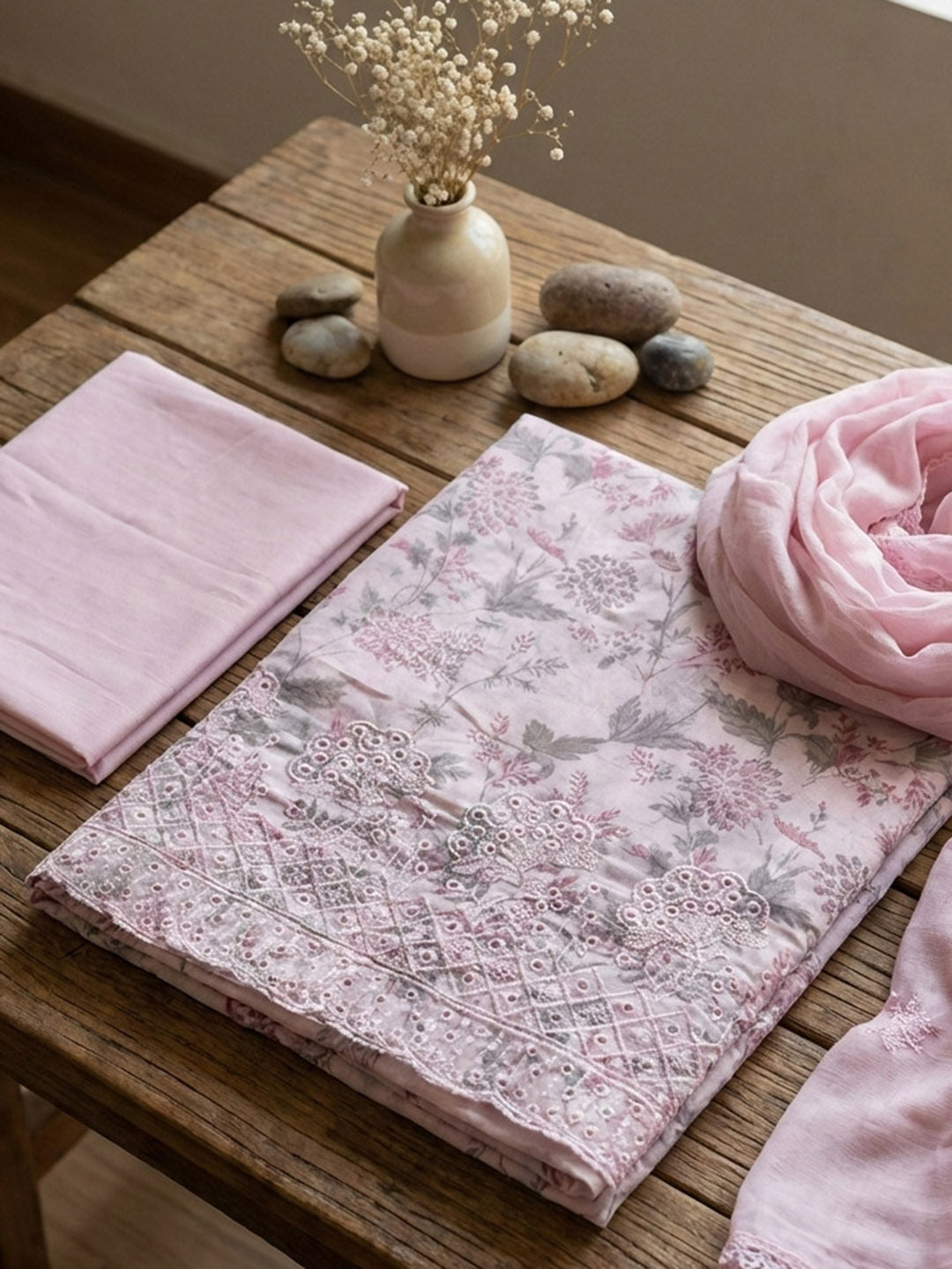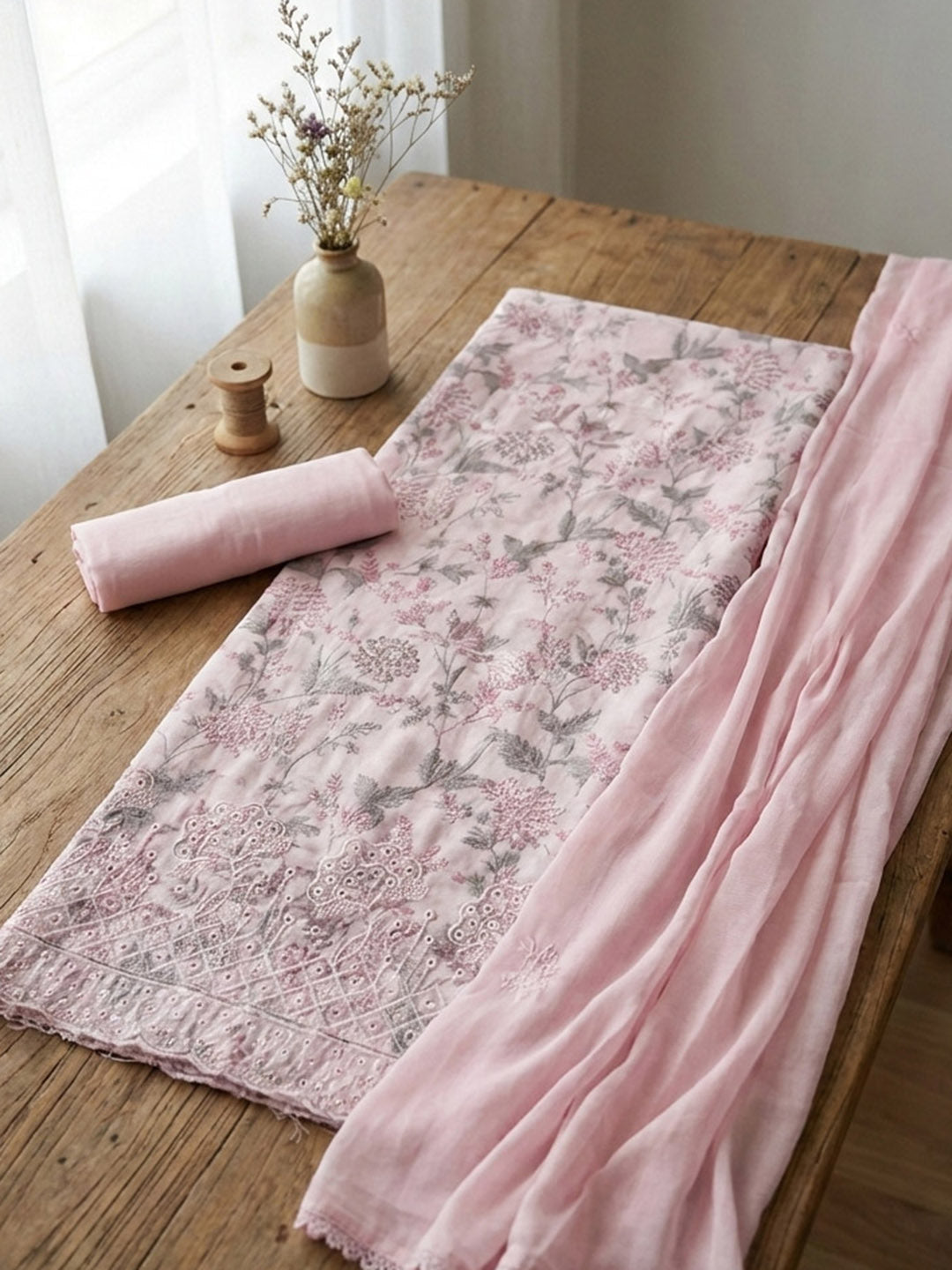 Embroidered Cotton Blend Unstitched Suit With Pant & Dupatta