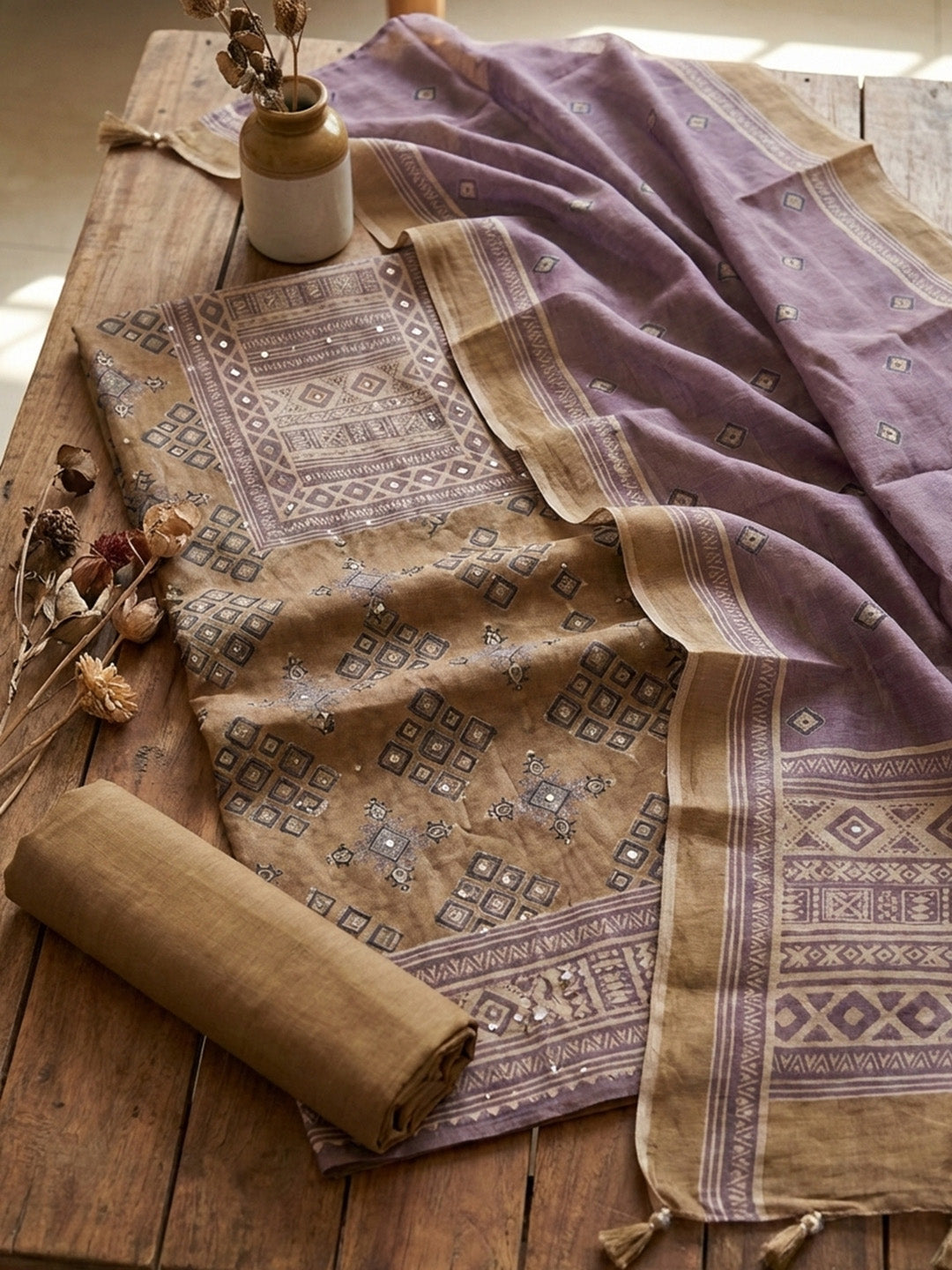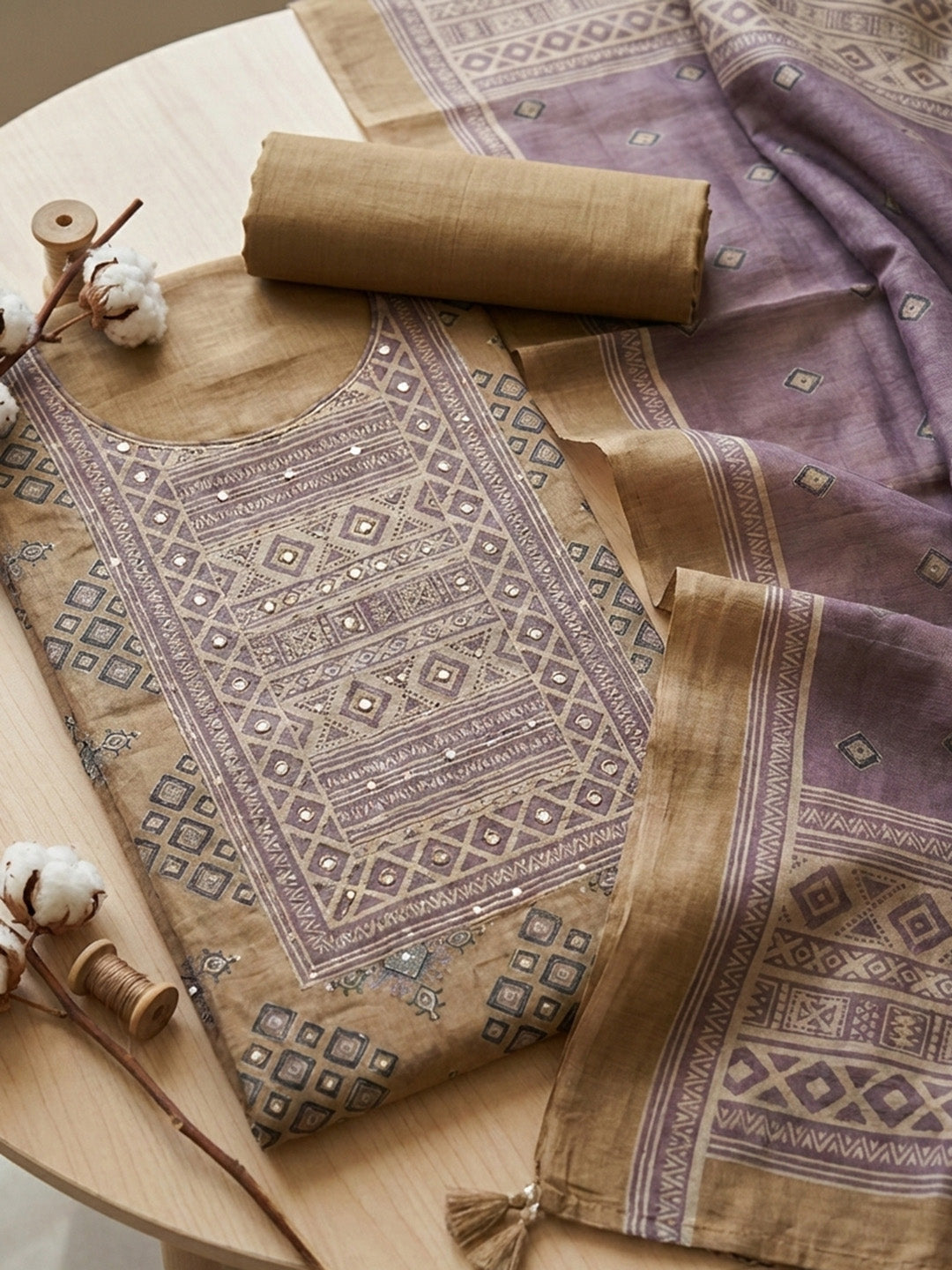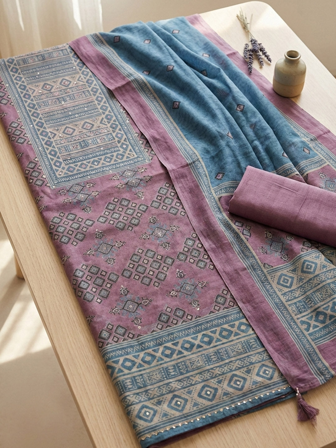 Printed Chanderi Unstitched Suit With Pant & Dupatta