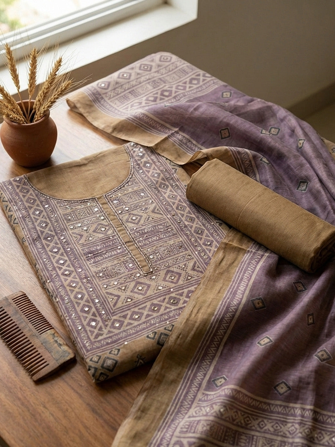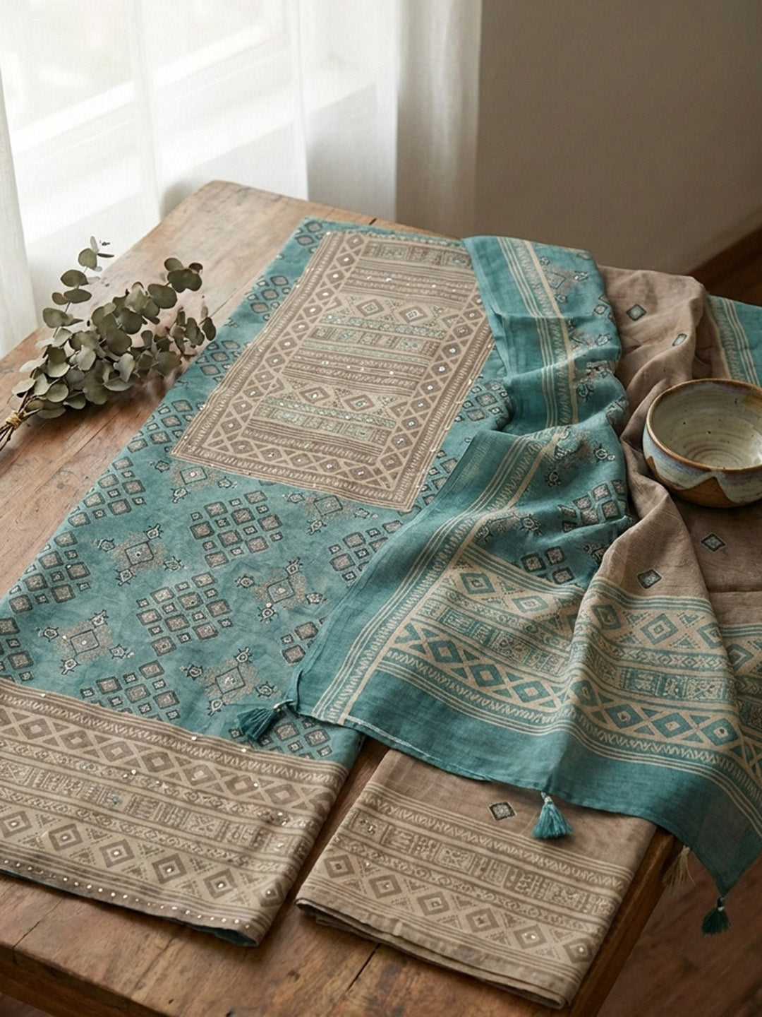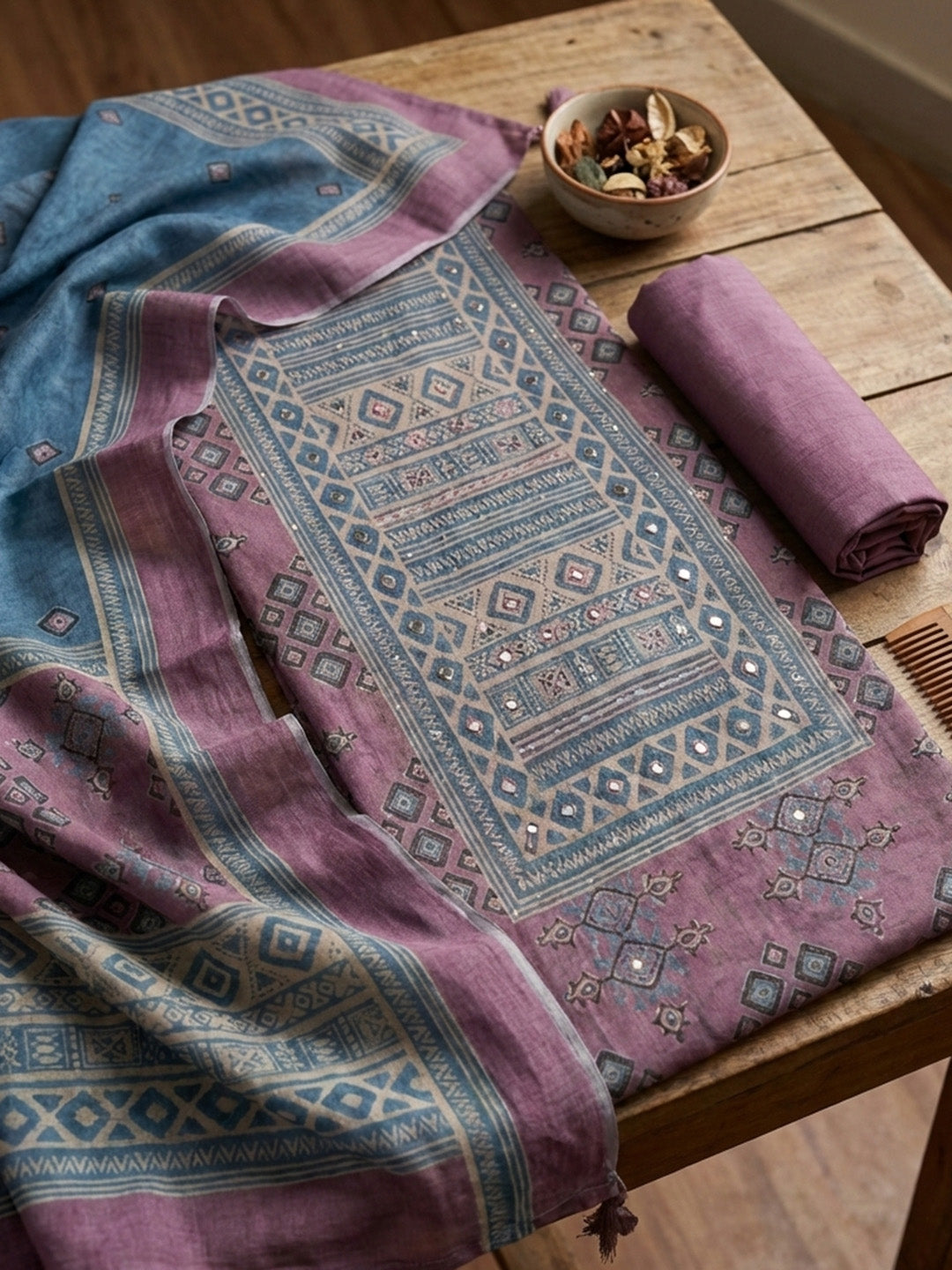 Printed Chanderi Unstitched Suit With Pant & Dupatta