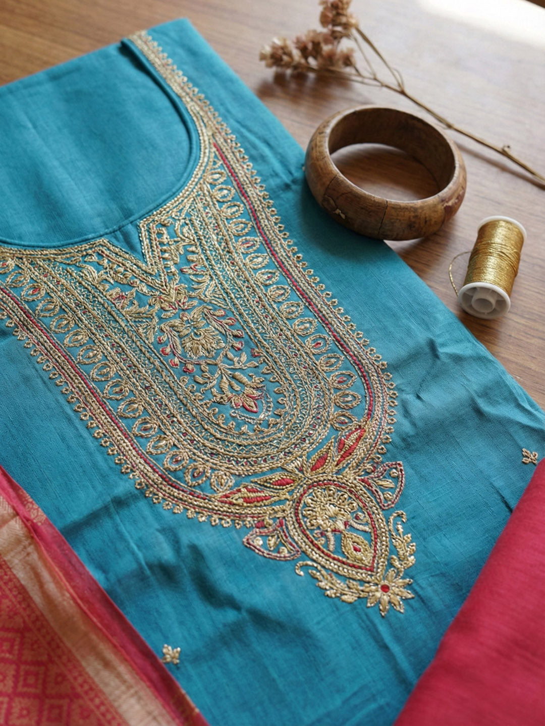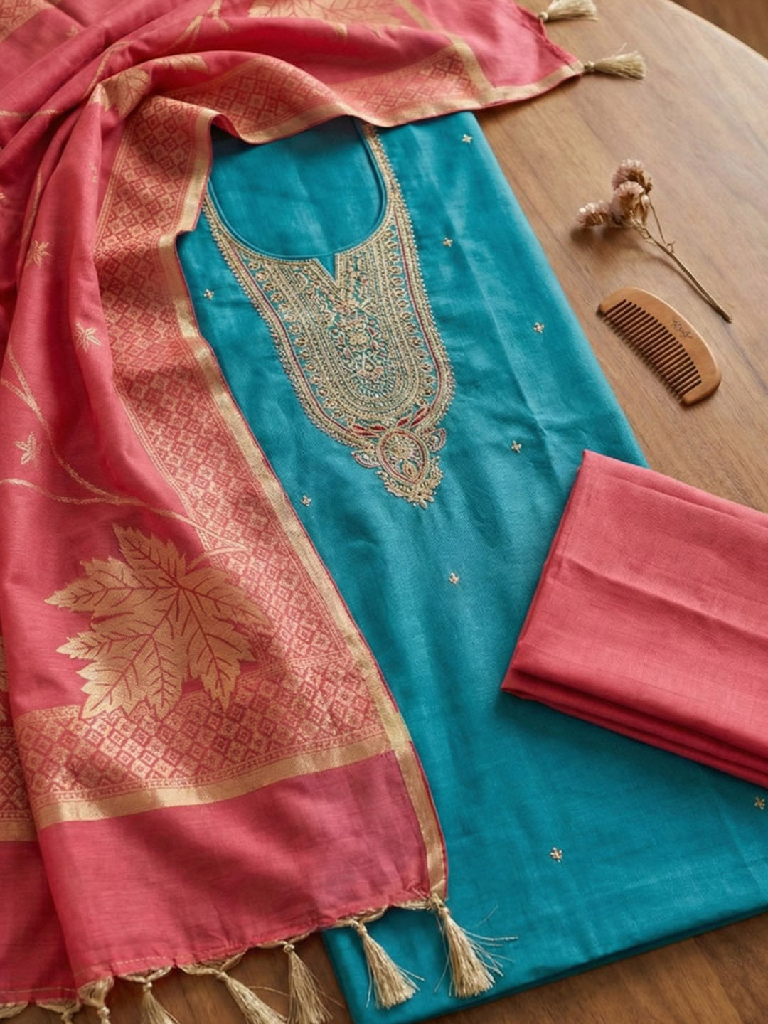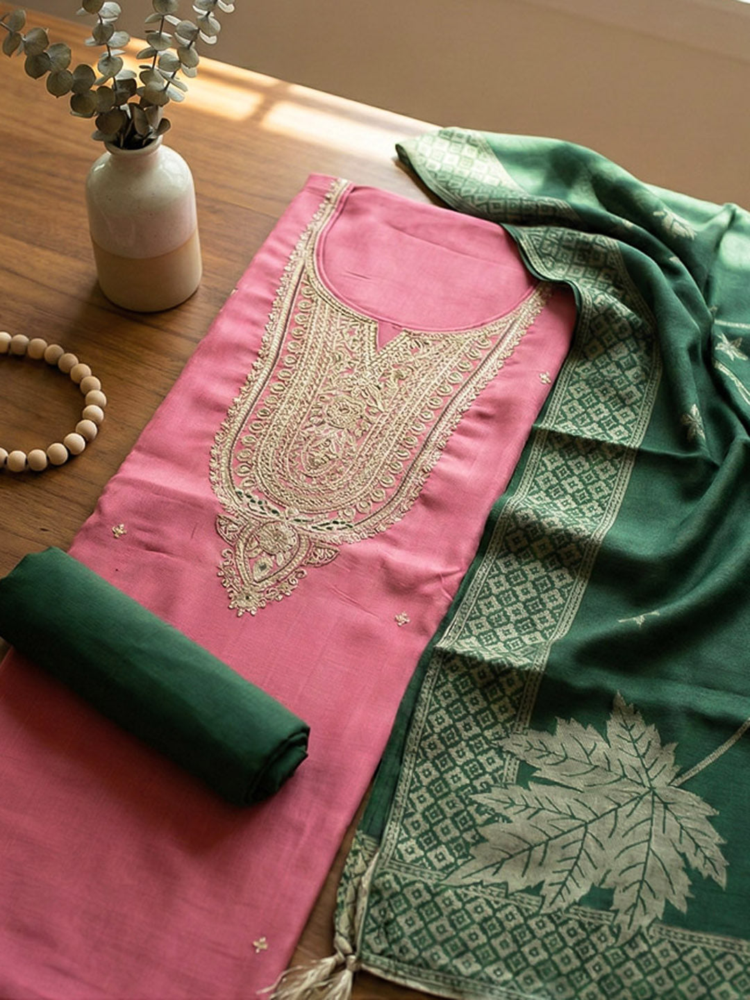 Embroidered Chanderi Unstitched Suit With Pant & Dupatta