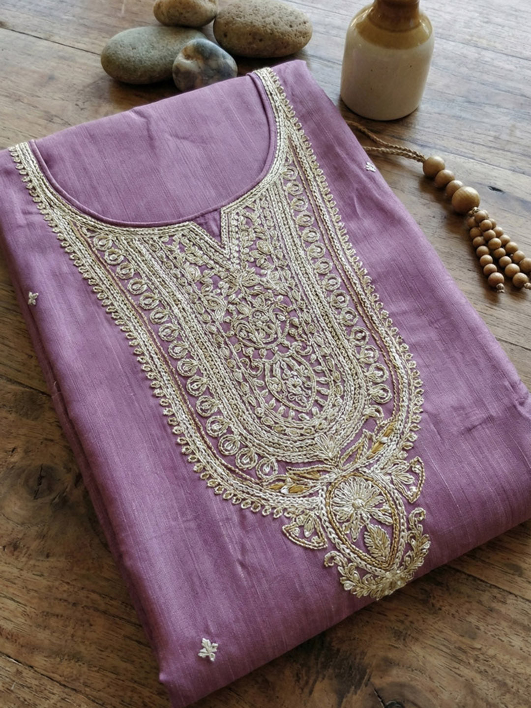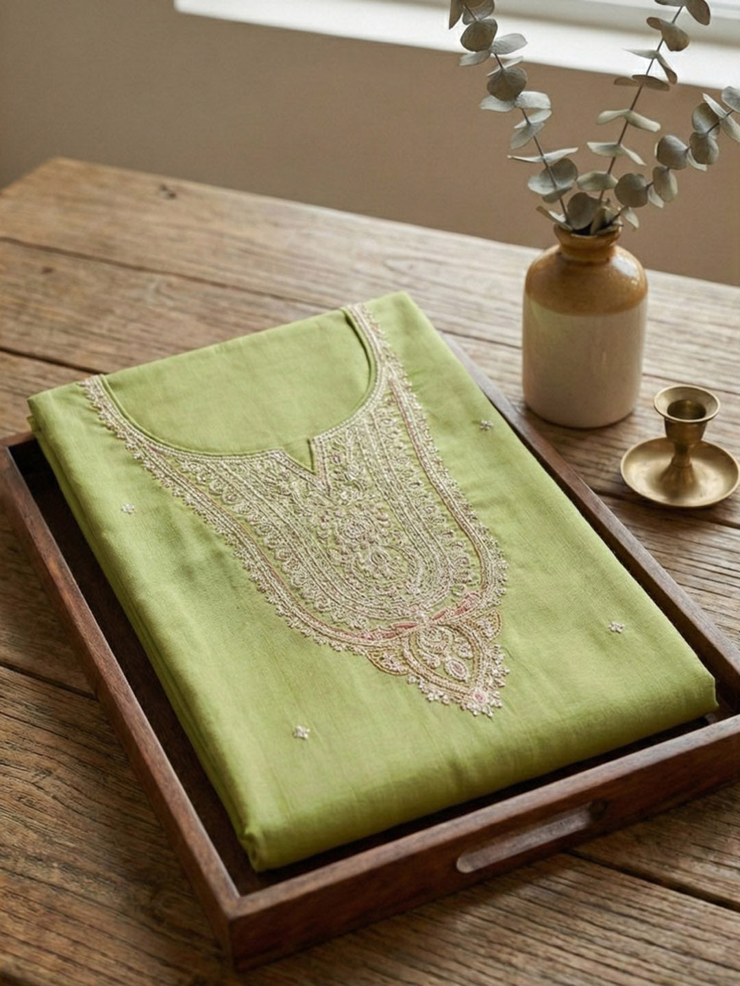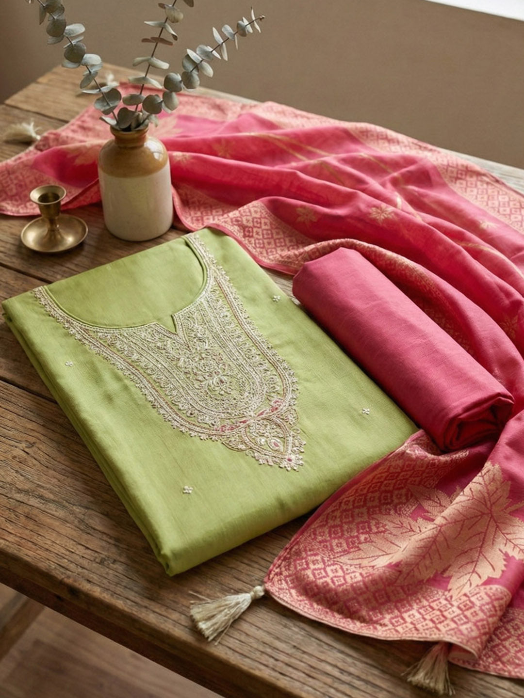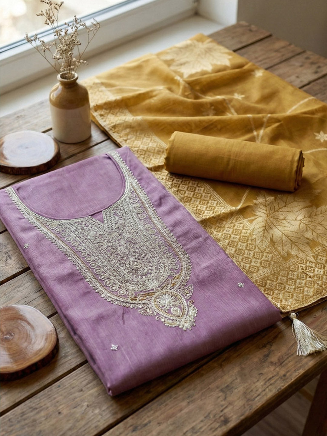 Embroidered Chanderi Unstitched Suit With Pant & Dupatta
