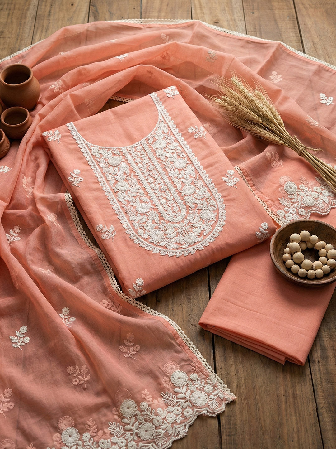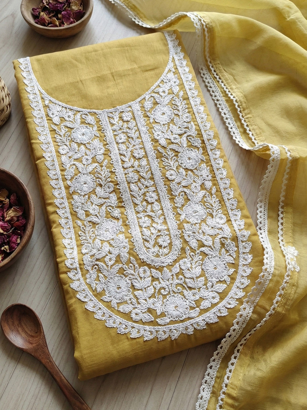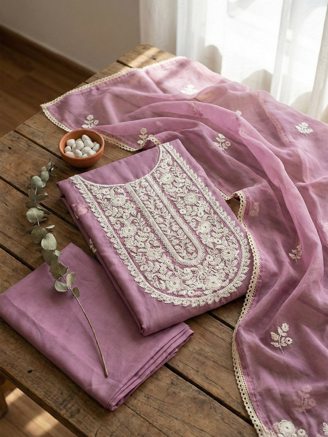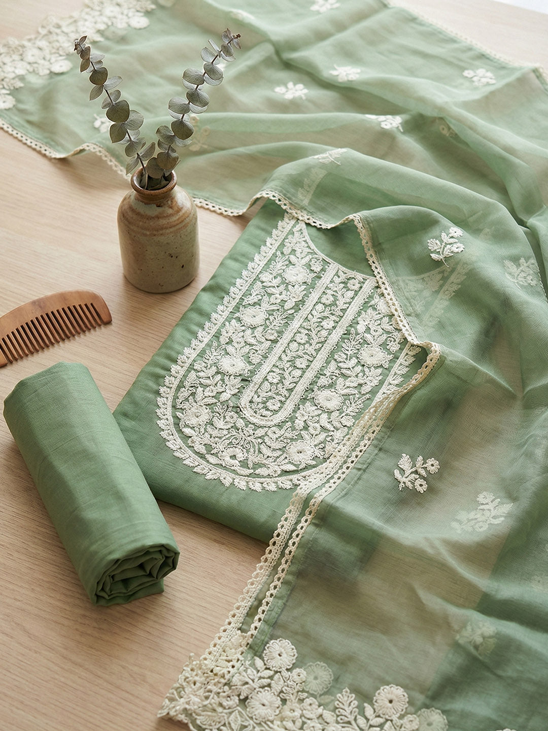 Embroidered Cotton Blend Unstitched Suit With Pant & Dupatta